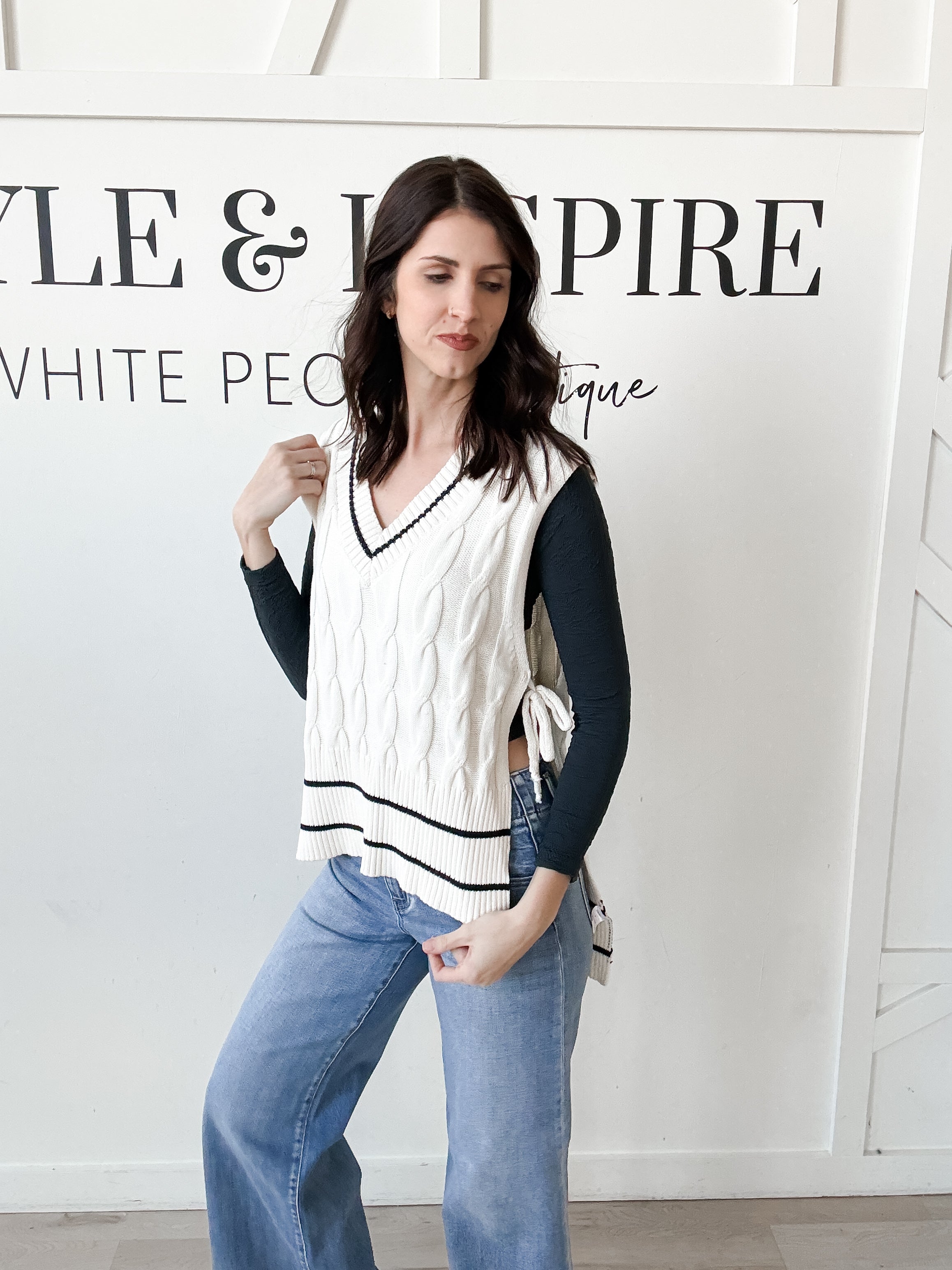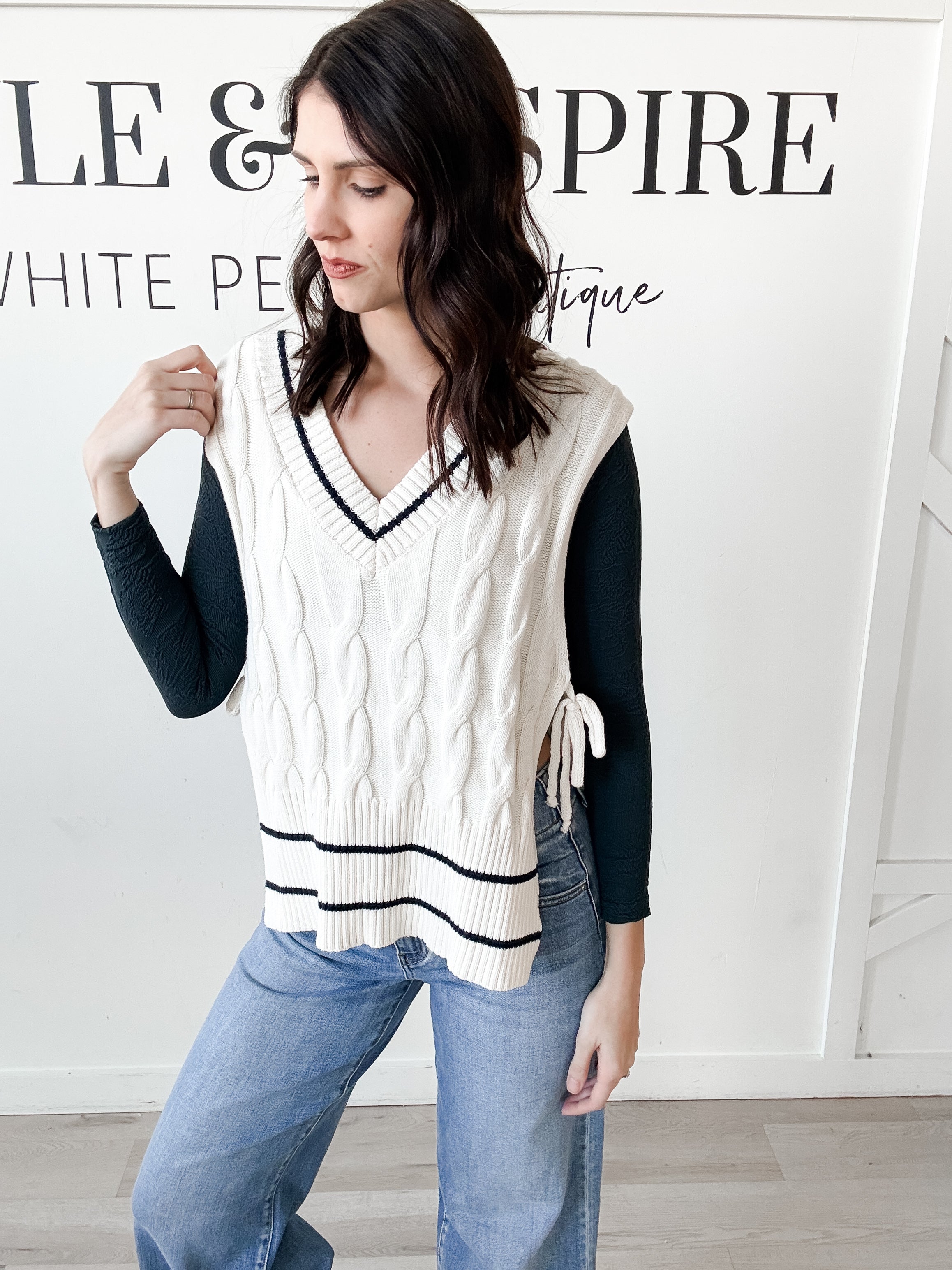 Style: Elevate your layering game with this sophisticated Christina Side Tie Knit Vest. Crafted from a luxuriously soft sweater knit with a textured cable knit body, this sleeveless piece features a flattering V-neckline and high-low hemline for modern movement. Self-tie sides cinch at the waist for a customizable fit, while contrast ribbing with delicate striping at the neckline and hem adds refined detail. Perfect for styling over basics or pairing with your favorite pieces for effortless versatility.