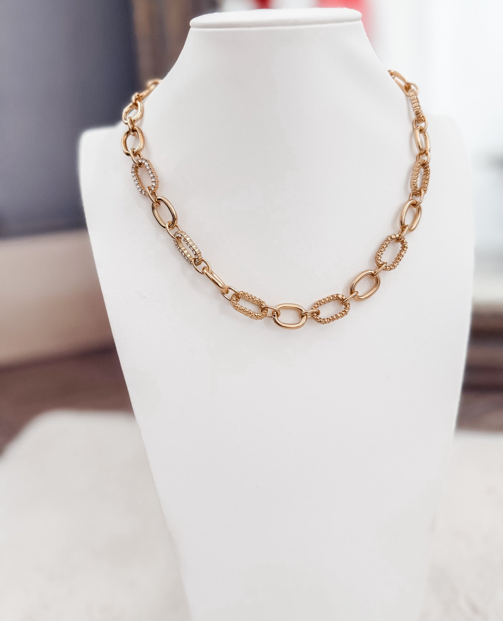 A chic update to a classic chain, this necklace features alternating gold oval links and crystal pave links for a modern sparkle. The polished gold finish contrasts beautifully with the shimmering pave, creating a look that’s both bold and elegant.