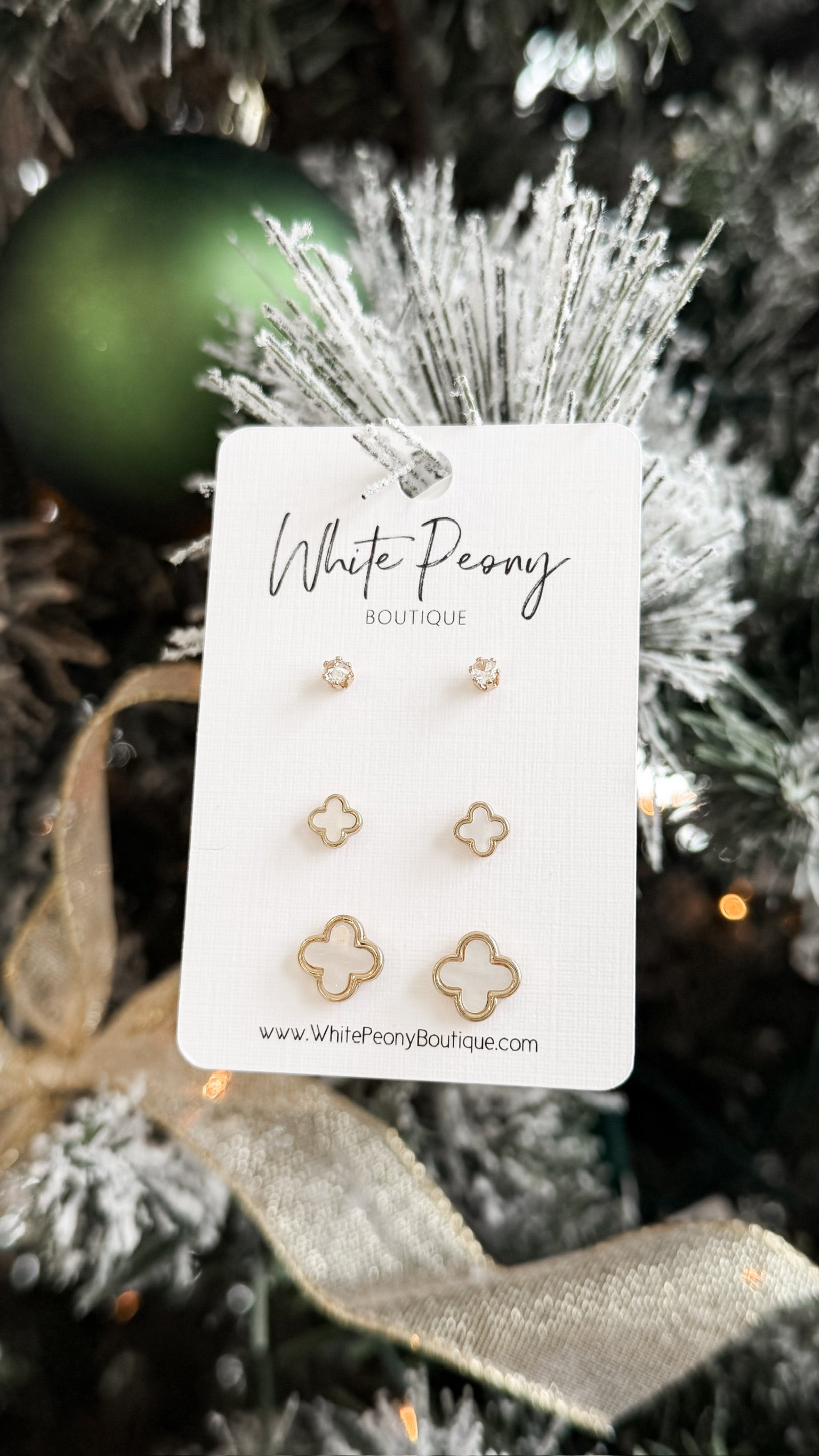 This three-pair earring set offers the perfect mix of sparkle and charm. Includes classic crystal studs, petite gold-edged clover studs, and larger enamel-filled clovers for a touch of modern elegance. Each pair adds just the right amount of polish—perfect for everyday wear or layering across multiple piercings.