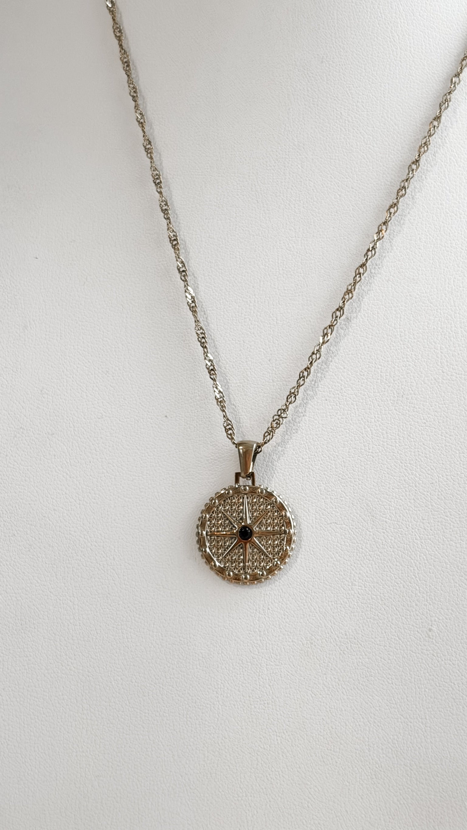 A vintage-inspired gold pendant featuring a detailed compass design with a petite black stone at the center. The textured finish and twisted rope border add depth and dimension, creating a piece that feels both timeless and bold.