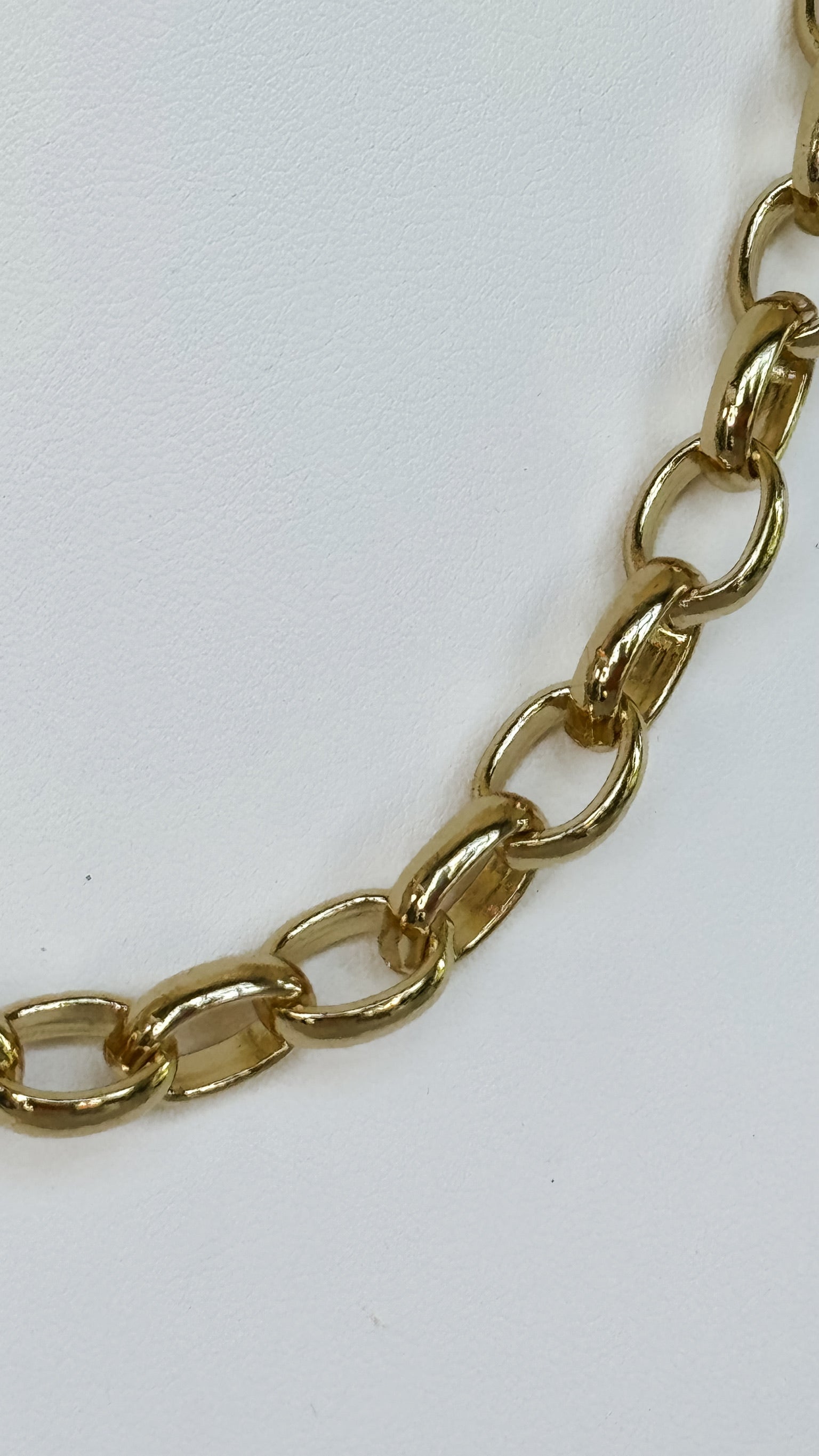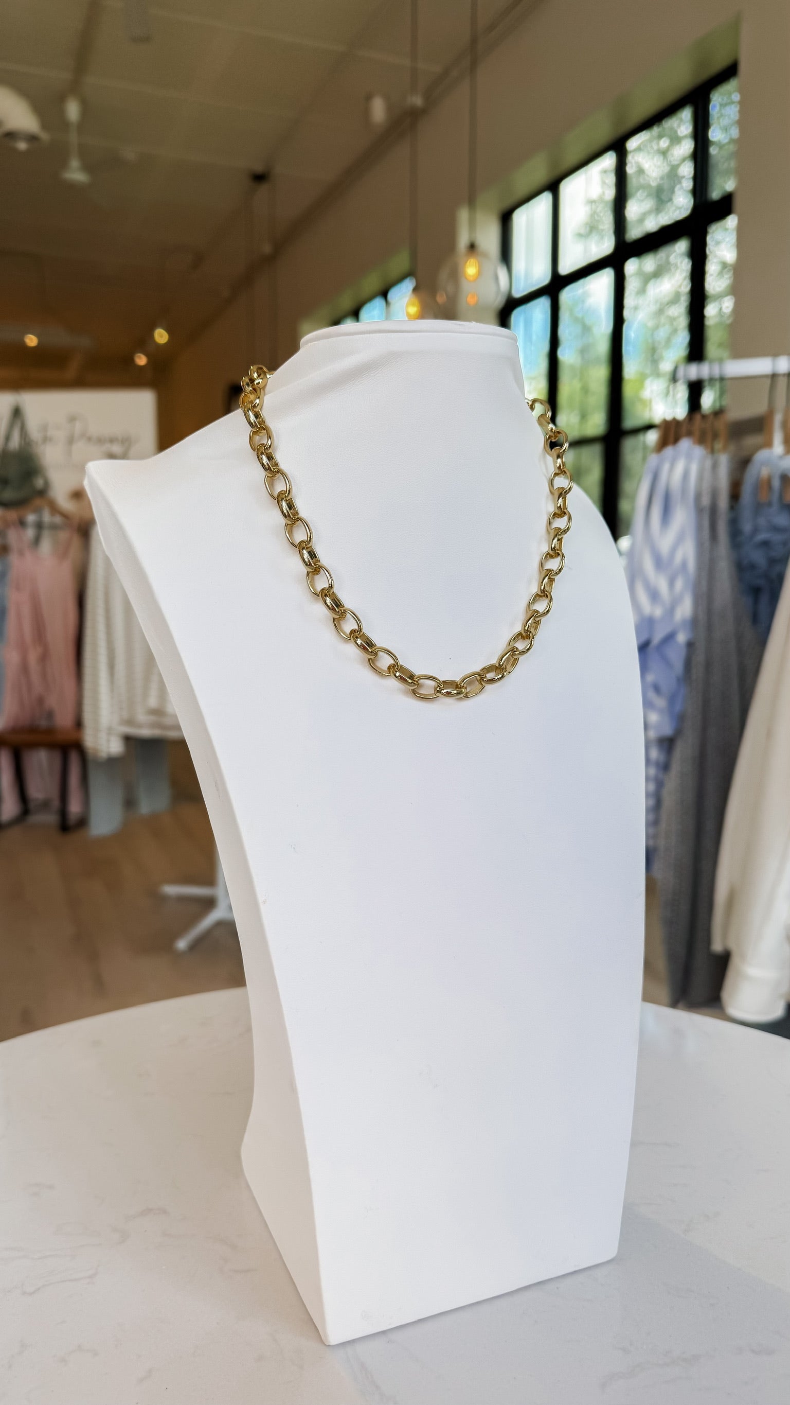 This Oval Wide Link Necklace features polished gold metal links, each measuring just over 1/2" long and 1/4" wide. The rounded edges ensure a comfortable fit against the neck, combining refined craftsmanship with everyday wearability. Its elegant design makes it a versatile addition to any jewelry collection.
