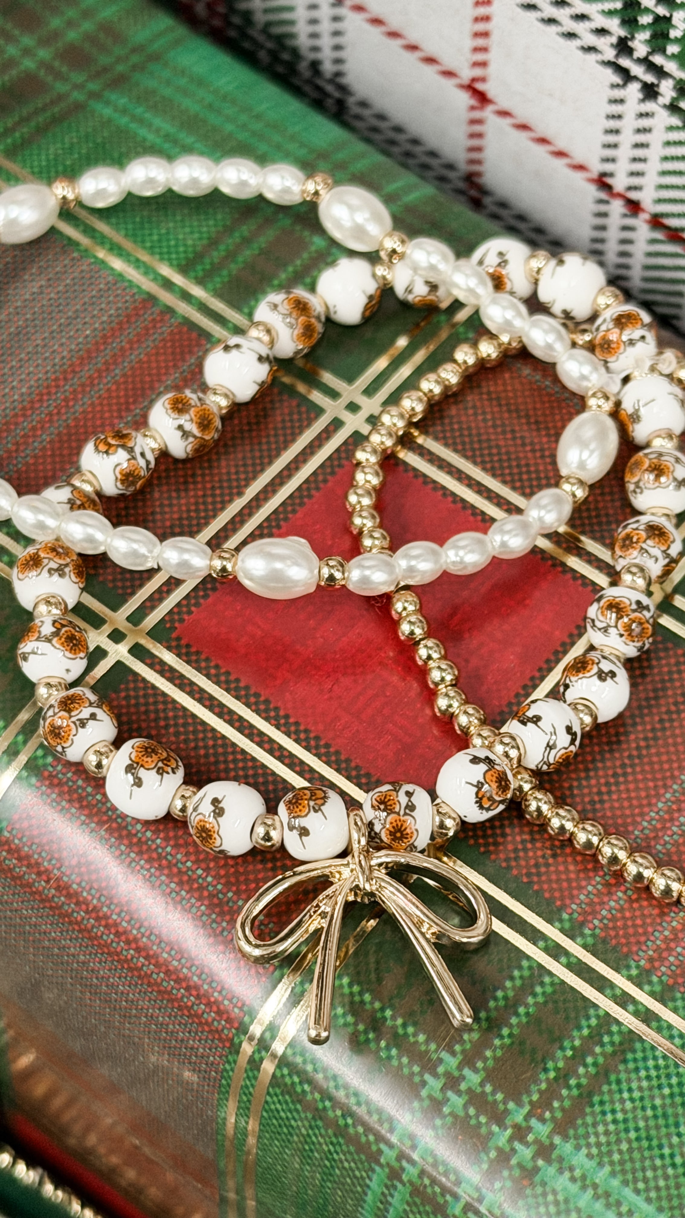 This charming Ribbon Bow Beaded Bracelet Set features three stretch bracelets designed to layer beautifully or wear solo. The mix includes gold beads, faux pearls, and floral-patterned beads accented by a delicate gold ribbon bow charm. Feminine and versatile, it’s the perfect balance of classic and playful.
