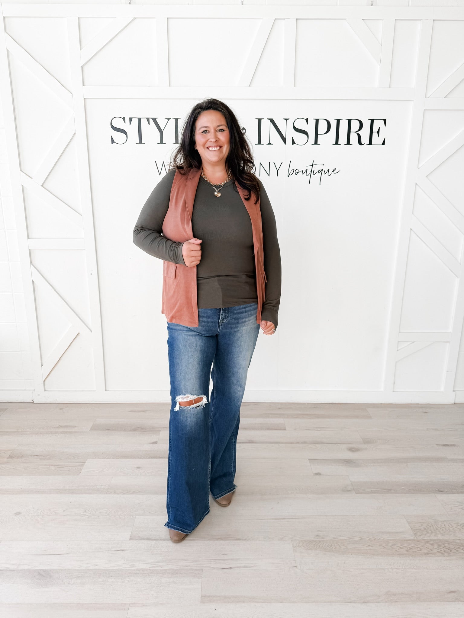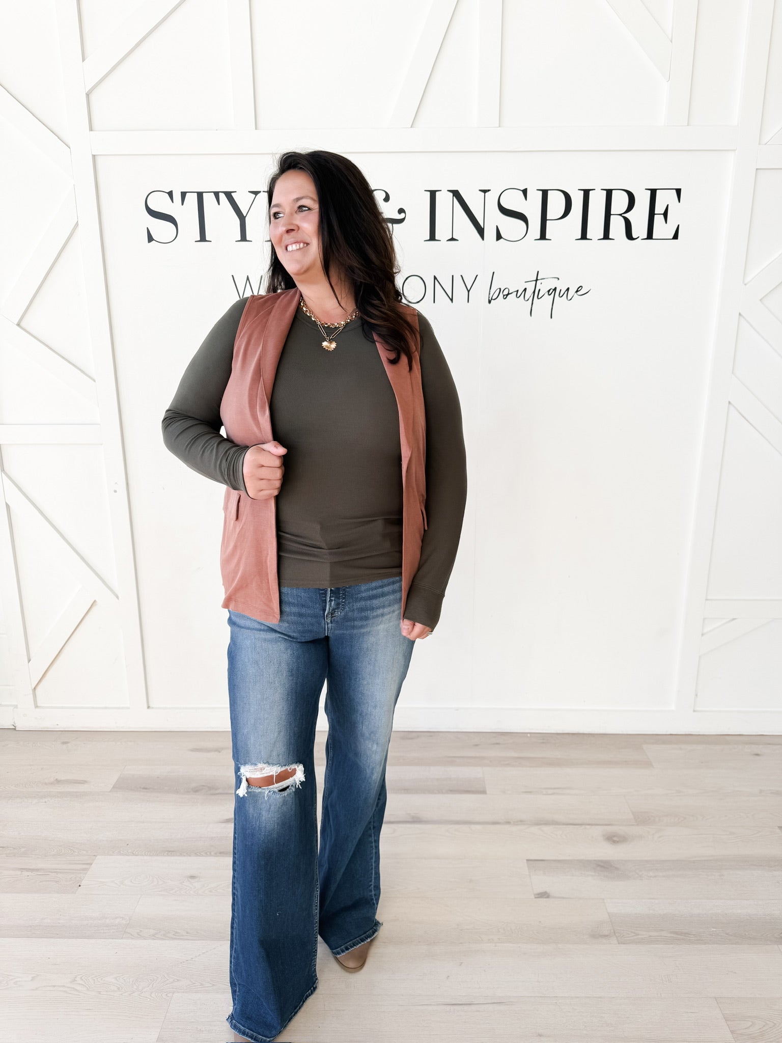 Style: The Charise Shawl Neck Blazer Vest features a refined shawl collar and a long-line silhouette secured with a single button closure for a polished look. Crafted from lightweight knit fabric, it offers comfortable layering without bulk. Practical front flap pockets add subtle functionality, while the straight hem maintains clean lines, making this vest an expert choice for versatile, sophisticated styling.