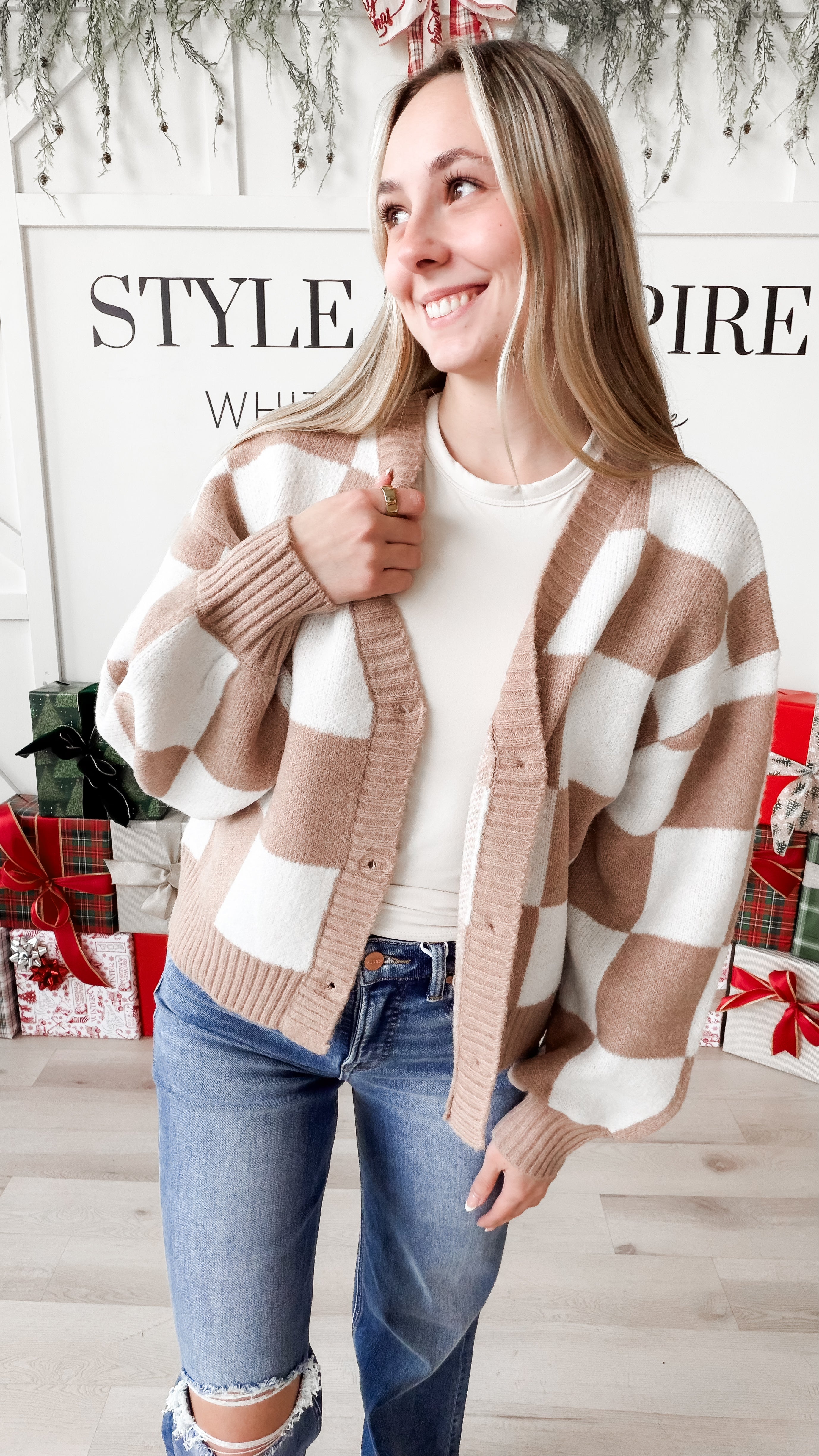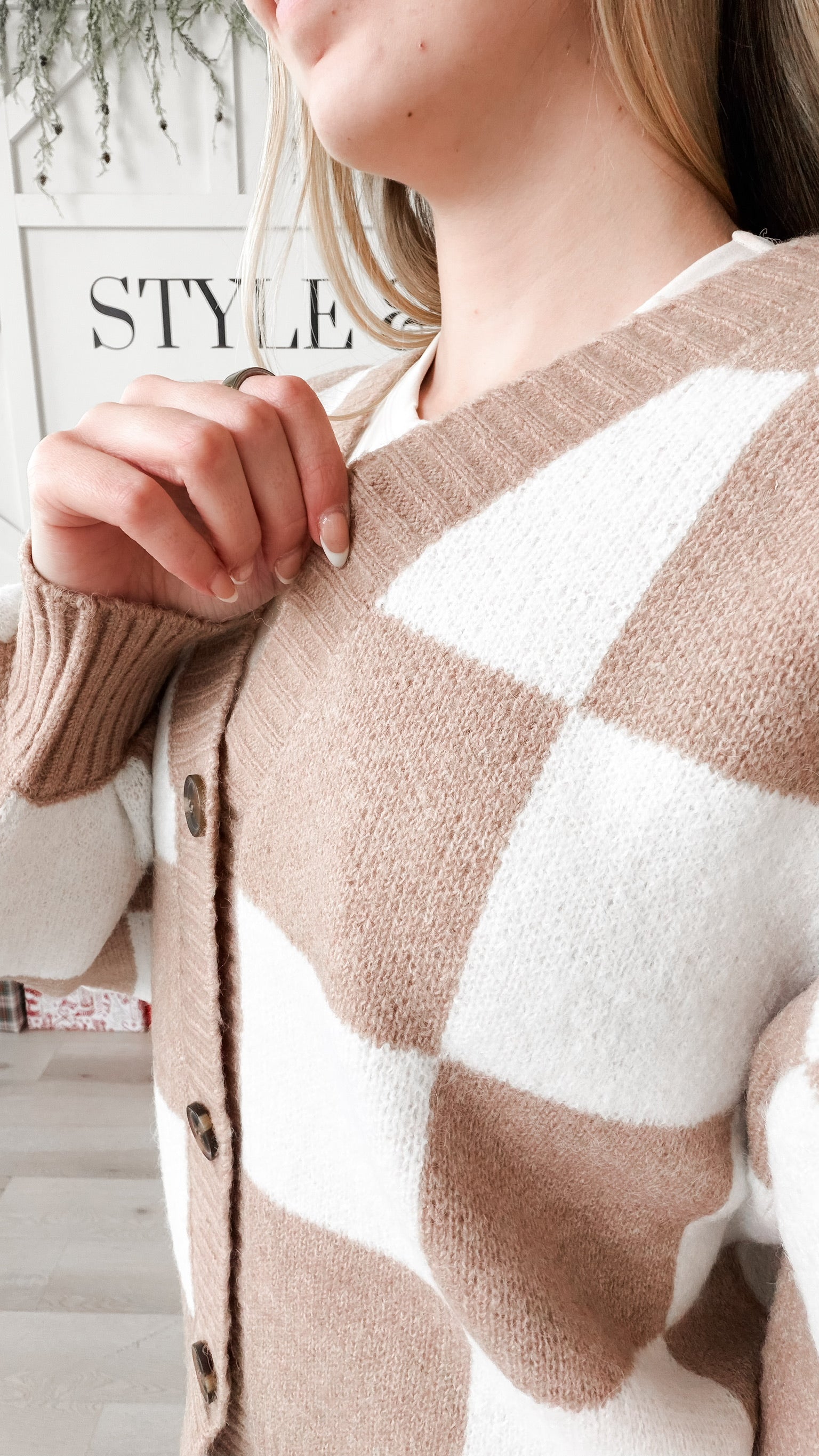 Style: The Maren Checkered Button Cardigan Sweater combines timeless tailoring with contemporary design. This versatile layer features a flattering V-neck with contrast ribbing that frames the face, while drop shoulders create an effortlessly relaxed silhouette. Long sleeves with ribbed cuffs provide polished finishing touches. The standout check color block pattern adds visual interest and pairs seamlessly with your existing wardrobe. Button-front closure allows for easy layering over tees, tanks, or dresses. An essential piece for transitional dressing.