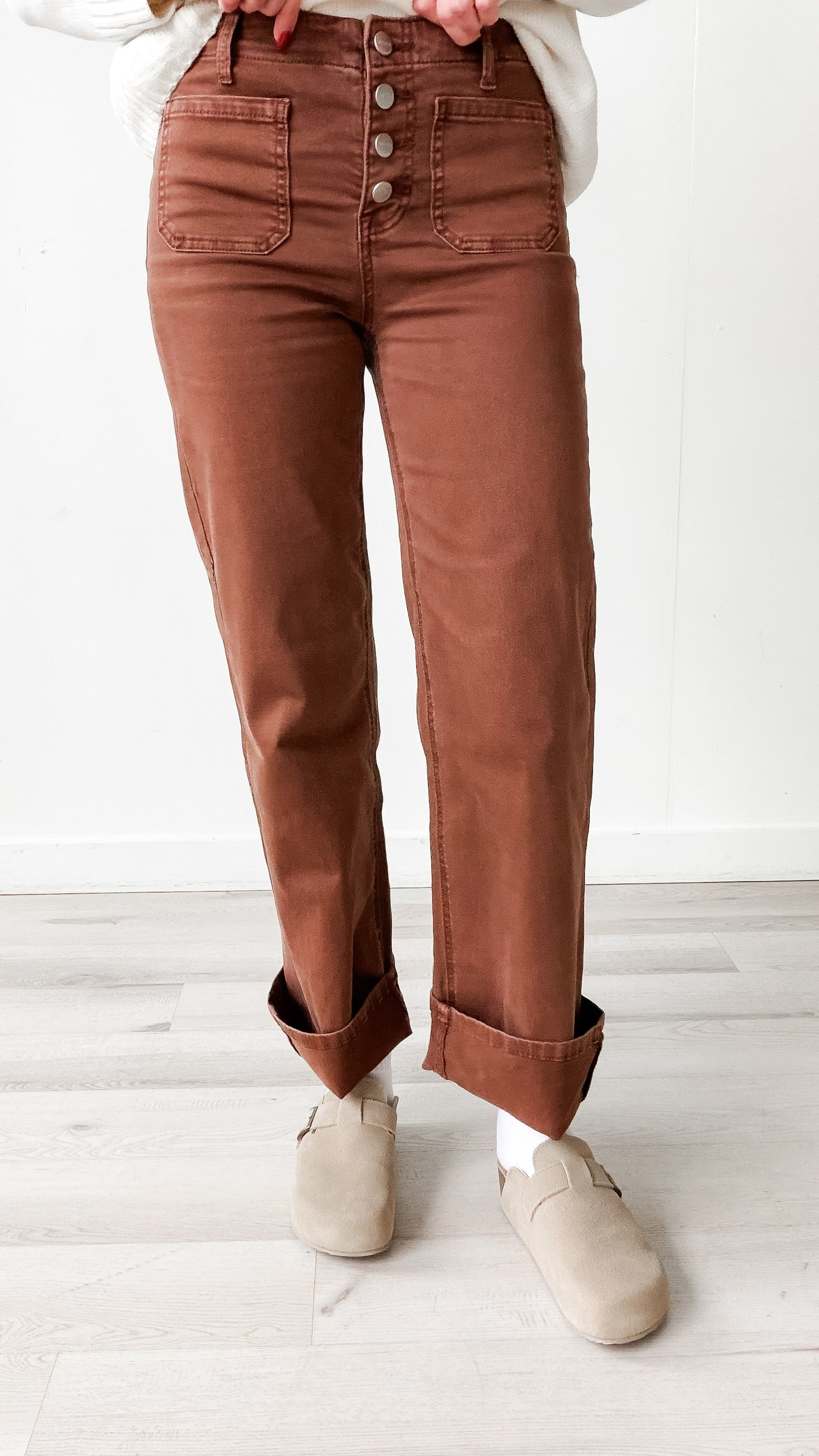 Style: These high-rise Risen Front Patch Pocket Cuffed Jeans feature a button fly closure and wide legs that taper into a broad cuffed hem, measuring 32" before cuff and 28" after. Crafted in a rich espresso hue, they combine classic design with contemporary fit, offering both style and comfort ideal for versatile, polished casual wear.