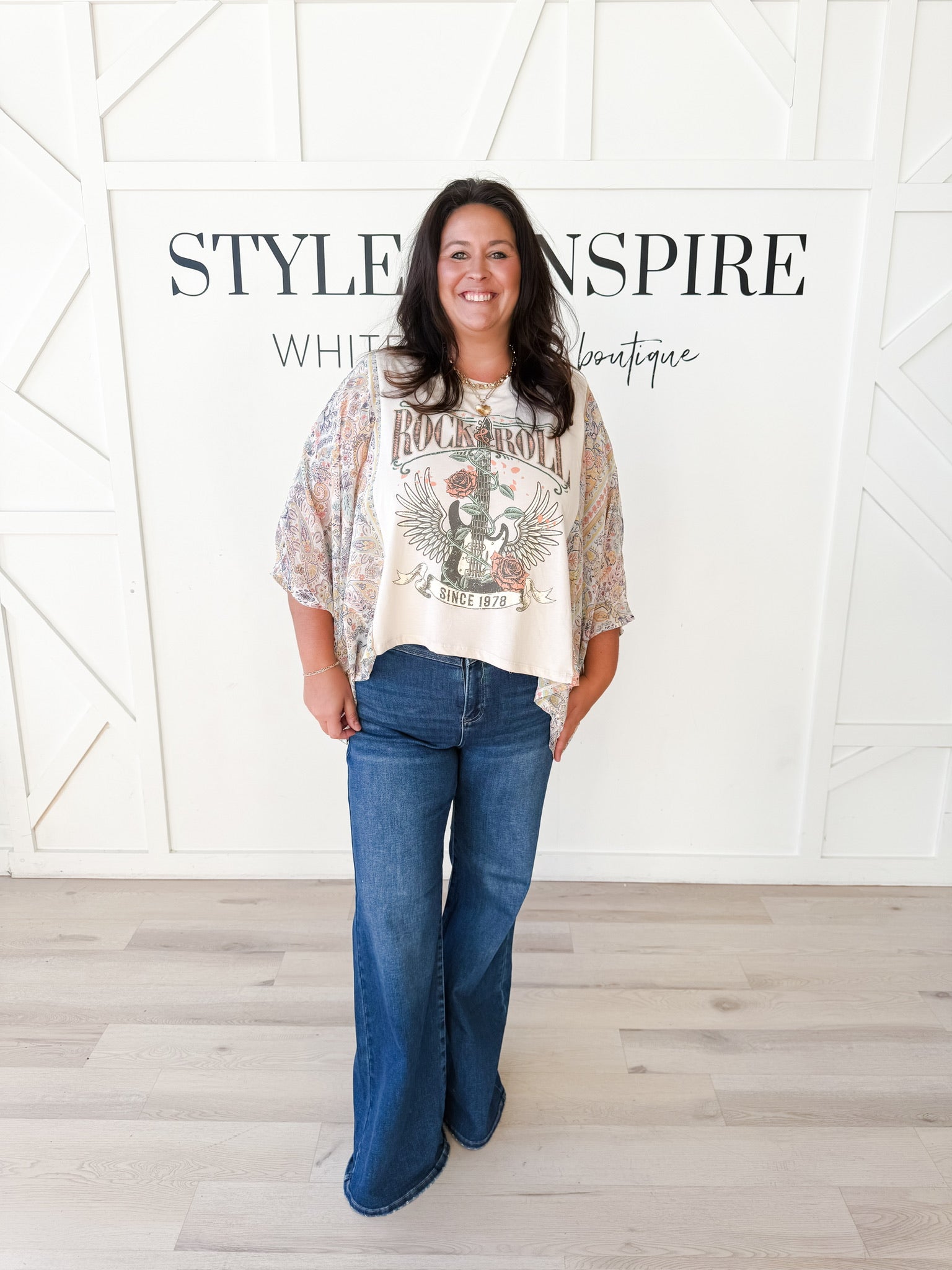 Style: This Rock N Roll Leopard Graphic Kantha Top features a crew neck and striking guitar and dual leopard graphics that bring bold style to your wardrobe. Designed with wide patterned sleeves and open sides, it offers a relaxed fit and breathable comfort. Crafted from lightweight fabric, this top is perfect for layering or wearing on its own in warmer weather. Its distinctive design blends edgy rock motifs with casual ease, making it a versatile statement piece for an expert fashion sense.