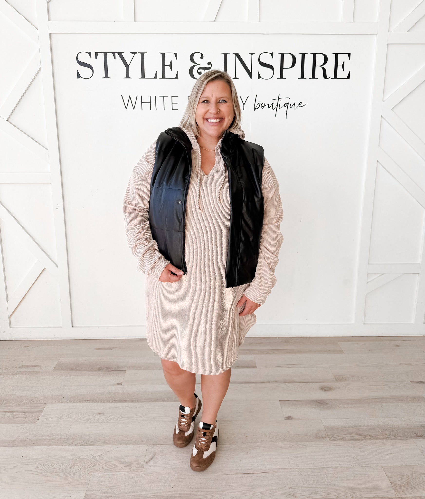 Style: The Trudy Quilted Faux Leather Vest features a cozy polar collar and a front zipper with snap closure for secure wear. Designed without sleeves for layering versatility, it includes convenient side pockets. The quilted construction enhances warmth while maintaining a sleek silhouette, crafted in durable faux leather for a stylish and animal-friendly finish. Ideal for adding textured interest and lightweight insulation to any outfit.