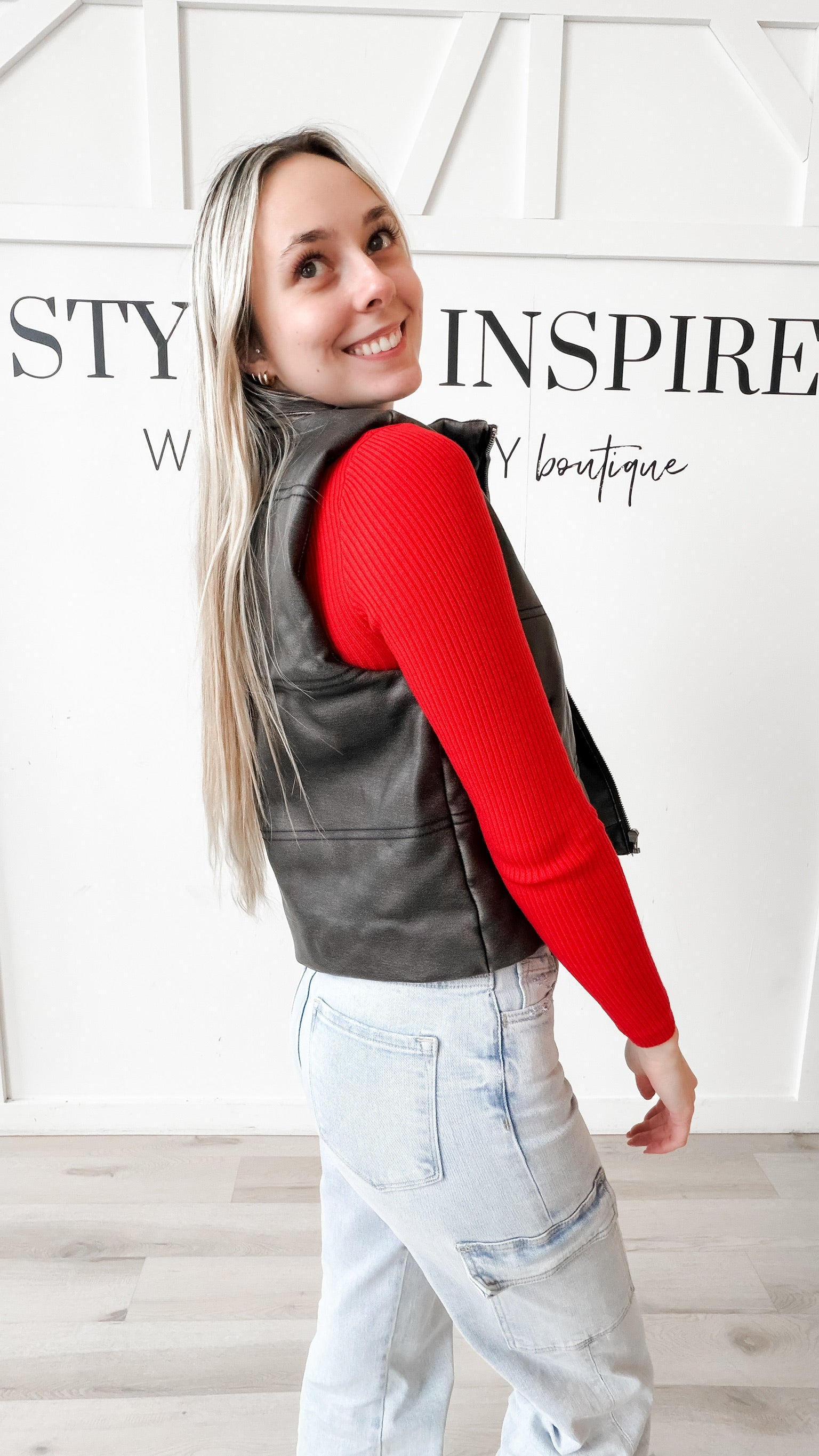Style: Elevate your layering game with this sophisticated faux leather vest, featuring a commanding stand-up collar and full-zip front for effortless styling versatility. The sleeveless silhouette pairs seamlessly over shirts, sweaters, and dresses, while strategically placed side hand pockets deliver practical functionality. Crafted from buttery-soft faux leather with a distinctive wash effect, this piece combines contemporary edge with refined texture—perfect for transitional seasons and elevated casual looks.