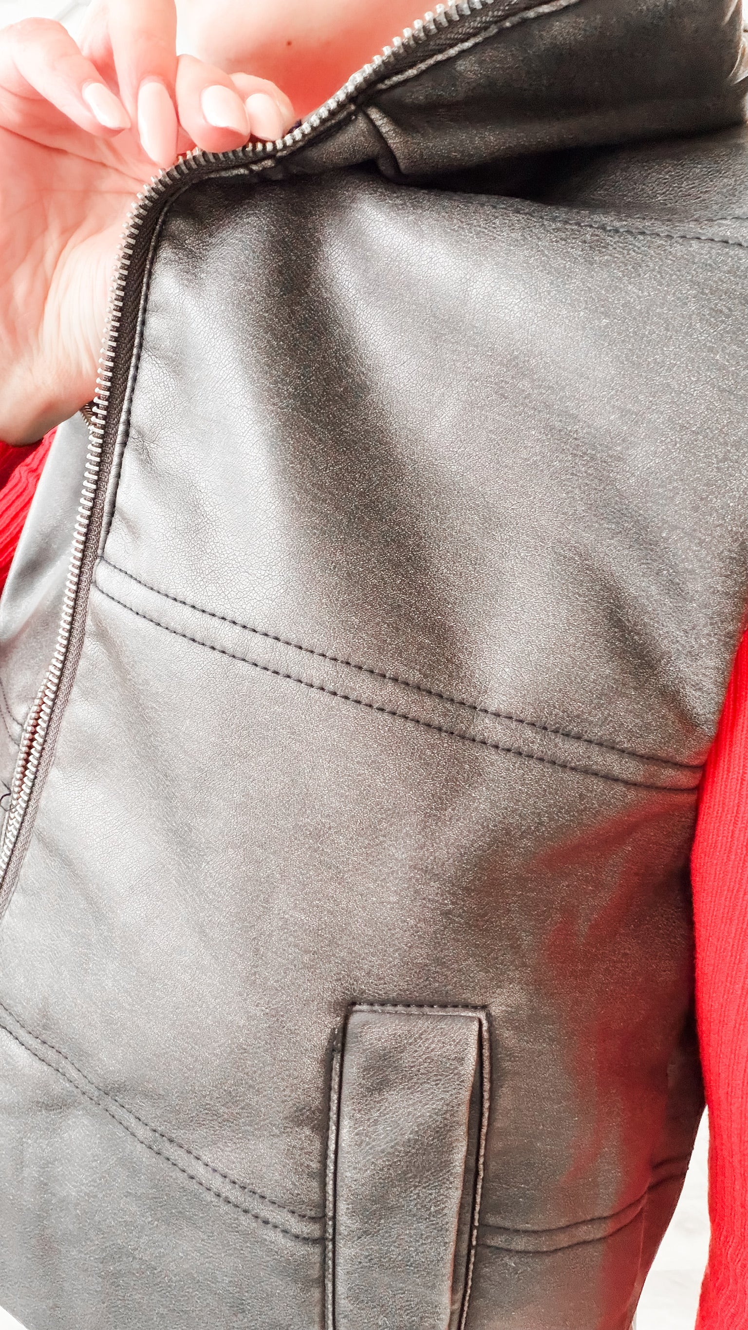 Fit: Stand up collar. Full zip front. Sleeveless. Side hand pockets. Wash effect. Soft faux leather.