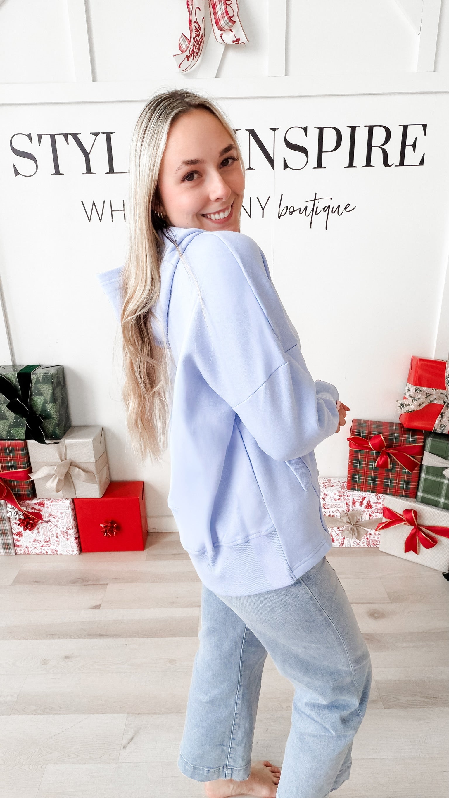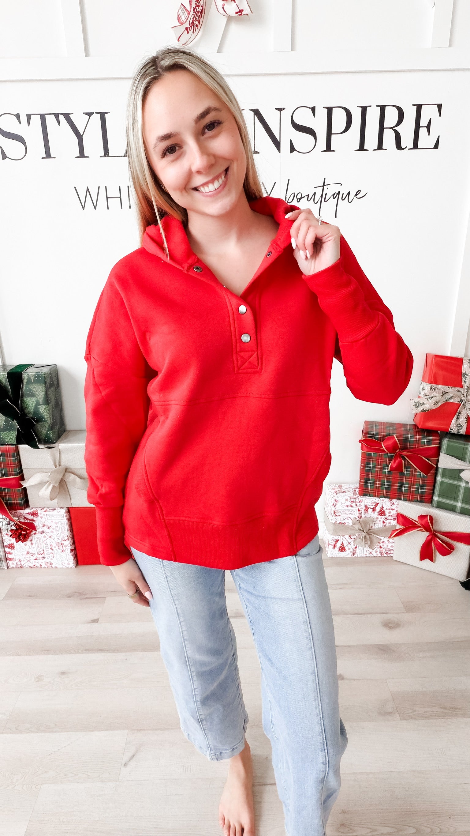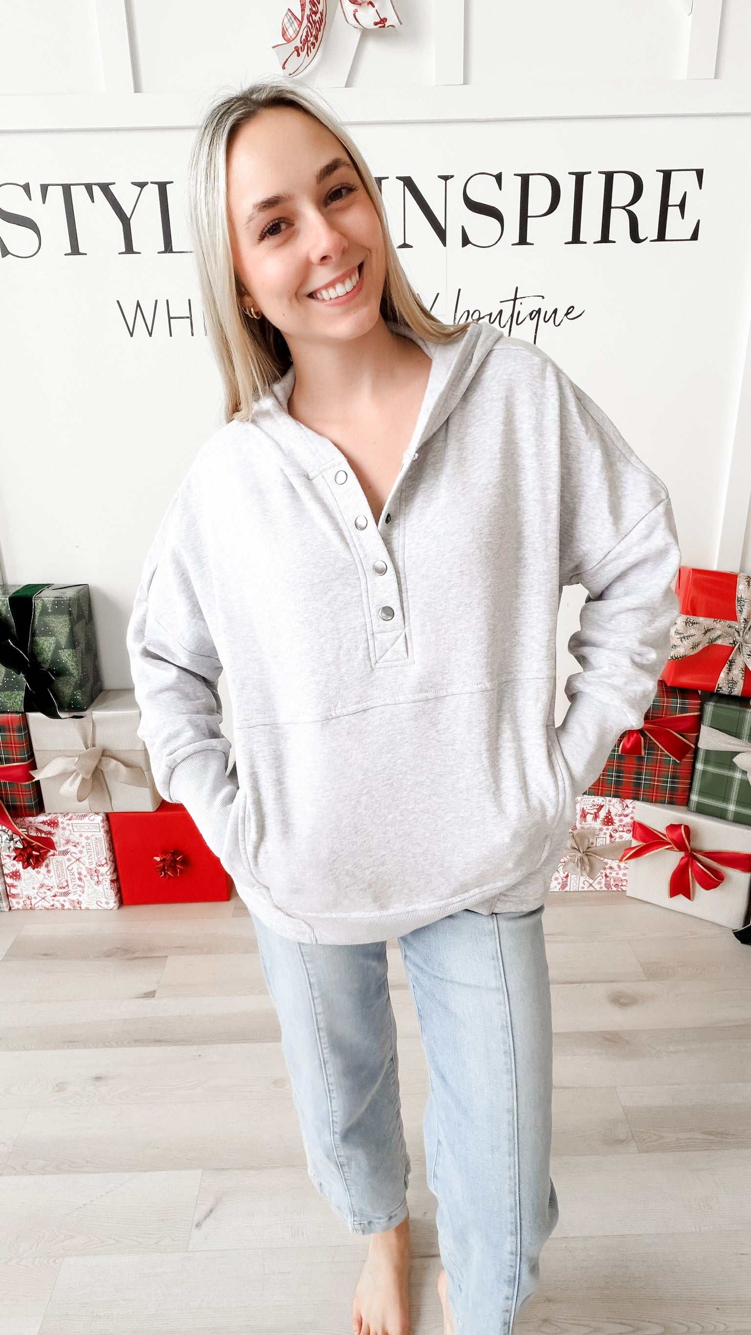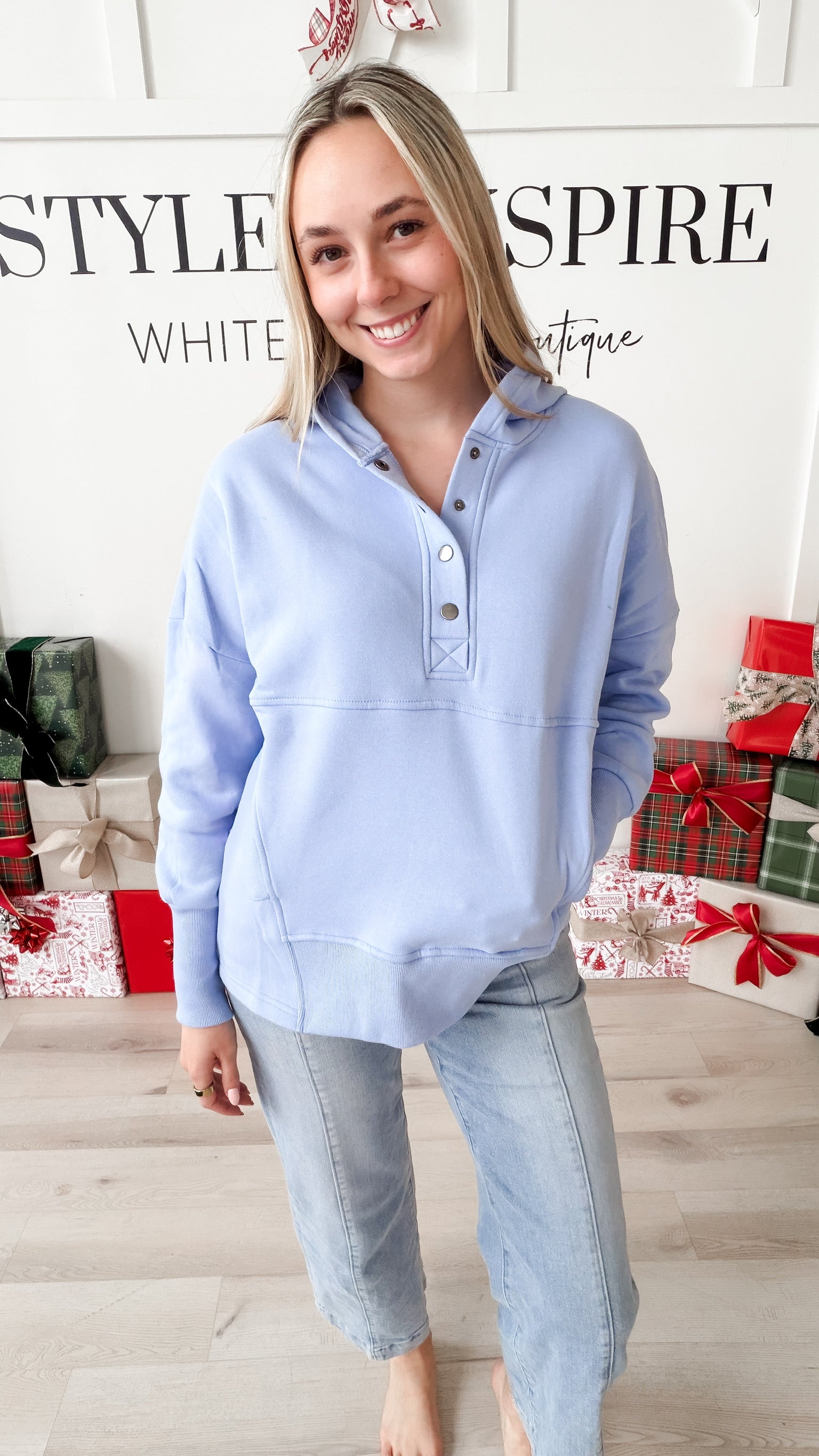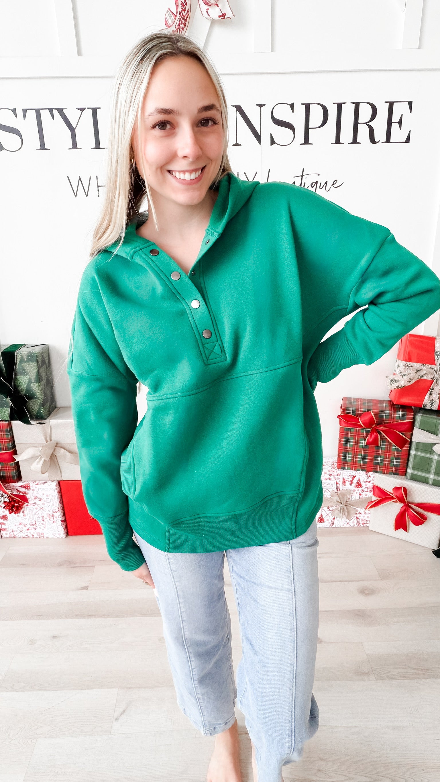 Style: The Neecy Half Snap Hooded Sweatshirt combines relaxed silhouette with thoughtful construction. A half snap closure at the chest offers versatile layering options, while drop shoulders and long sleeves with generous cuffs create an effortlessly oversized fit. Functional kangaroo pockets provide everyday practicality, and the mid-thigh length delivers modern proportions. Brushed interior fabric ensures soft comfort against skin—ideal for transitional seasons or casual layering.