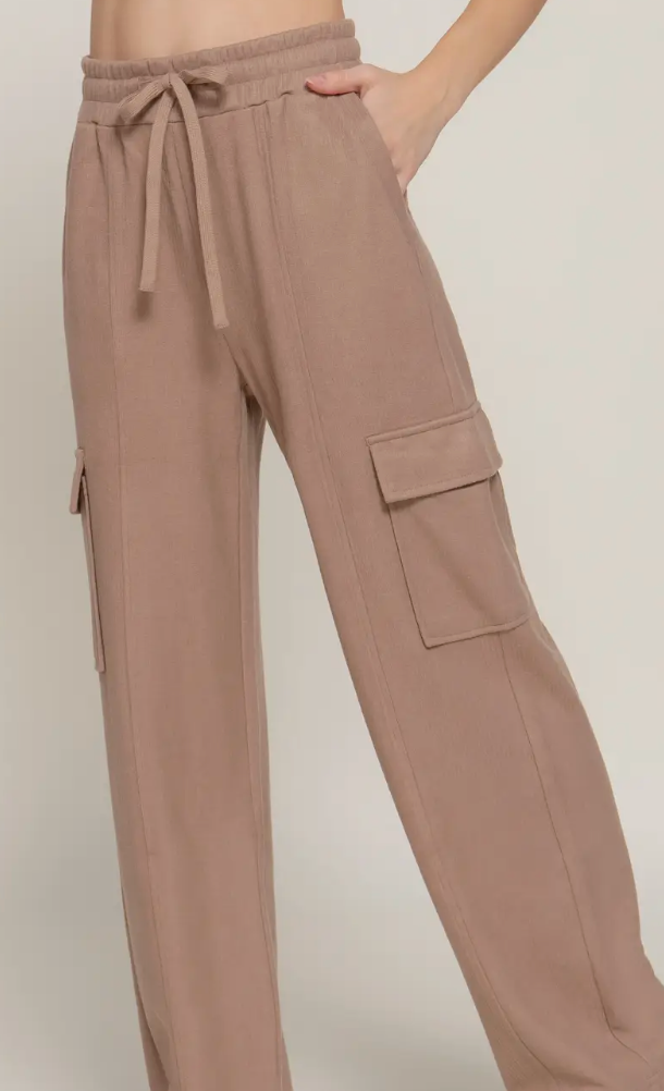Fit: High waist. Elastic waistline with adjustable drawstrings. Side hand pockets. Cargo pockets on the side of the legs. Straight cut. Super soft light corduroy ribbed knit.