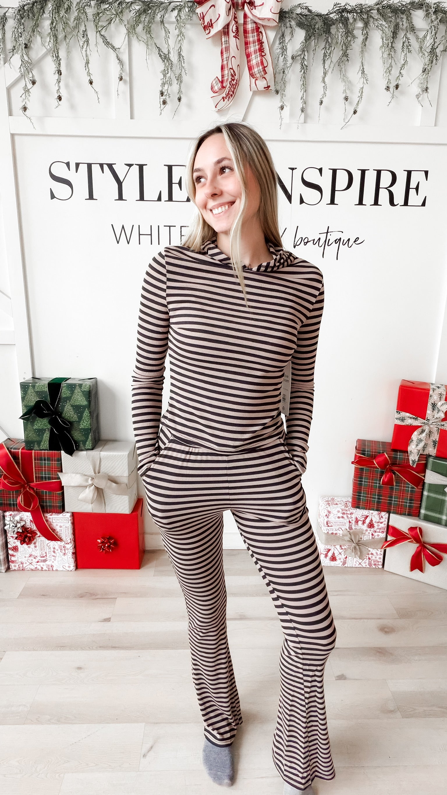 Style: The Willa Soft Modal Stripe Pants combine comfort with contemporary style. Crafted from lightweight modal fabric, these pants offer a luxuriously soft feel against the skin while maintaining breathability. The mid-rise silhouette pairs with a flattering flare leg, creating an effortlessly polished look. An elastic waist with adjustable drawstring ensures a customized fit, while functional side hand pockets add practical appeal. Horizontal stripes add visual interest to this versatile wardrobe essential.