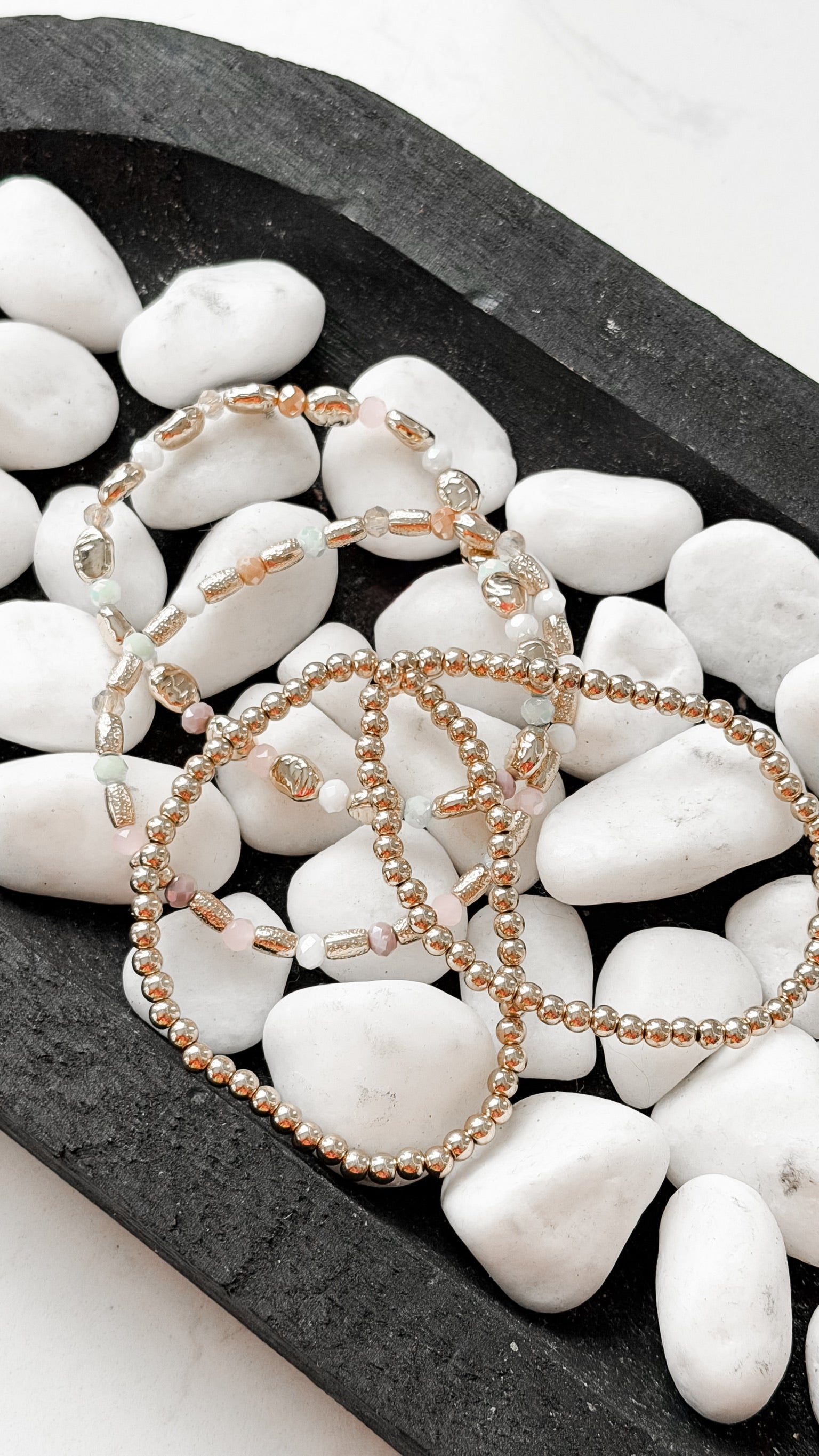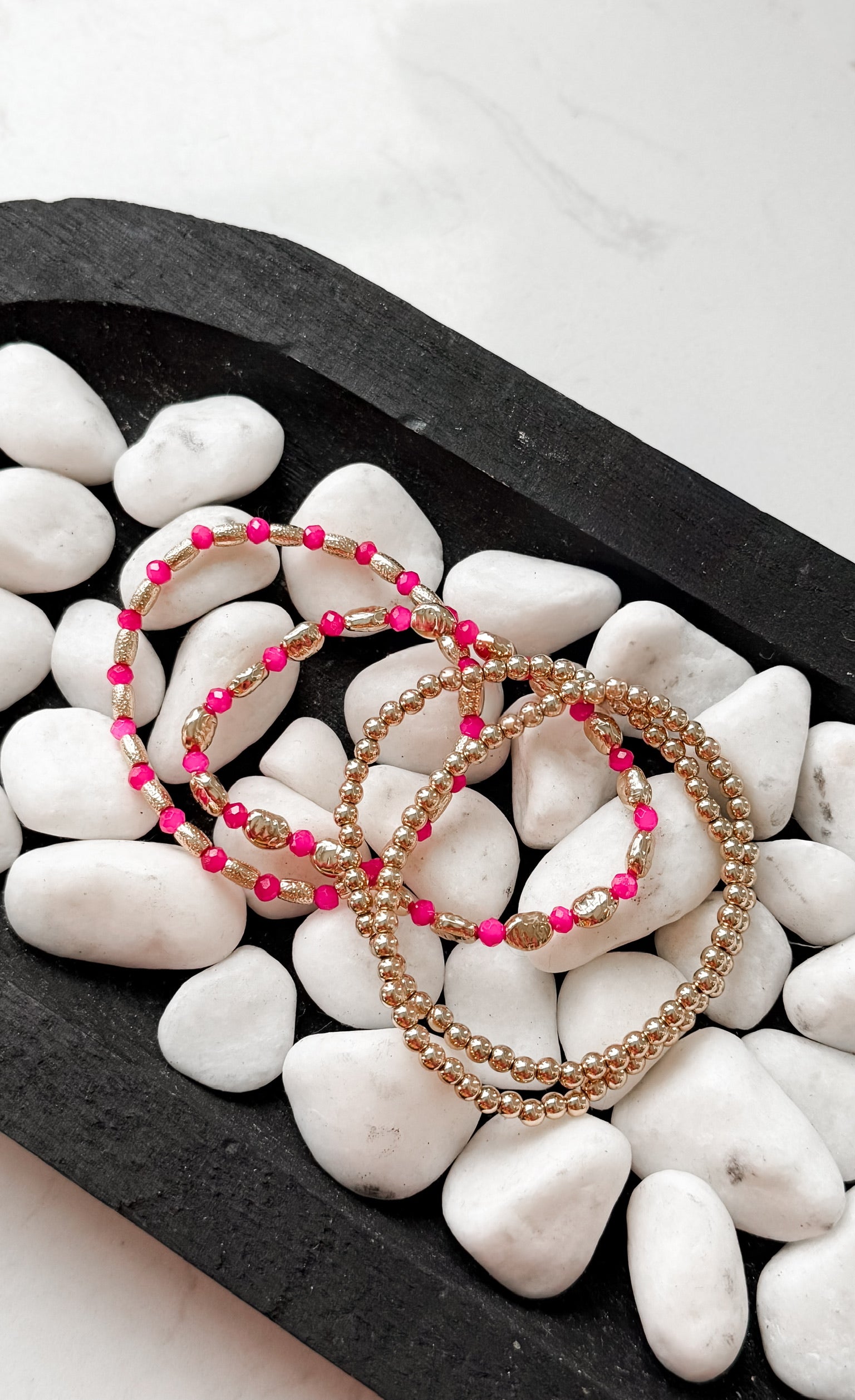 Designed with a comfortable stretch fit, each strand layers effortlessly for that curated, boutique-style look. Choose from bold pink for a statement pop, soft pastels for a subtle glow, or creamy white for a timeless neutral finish.