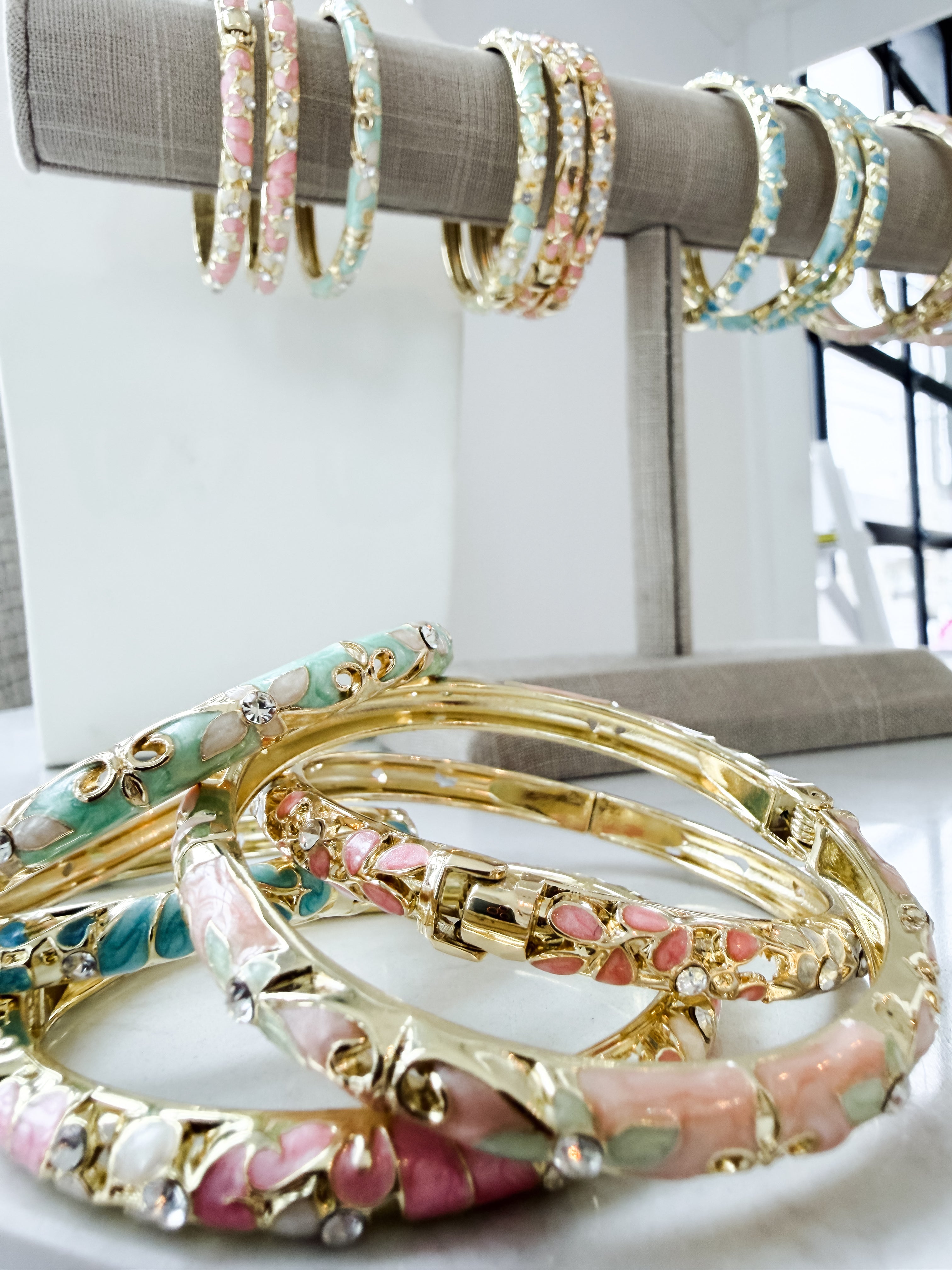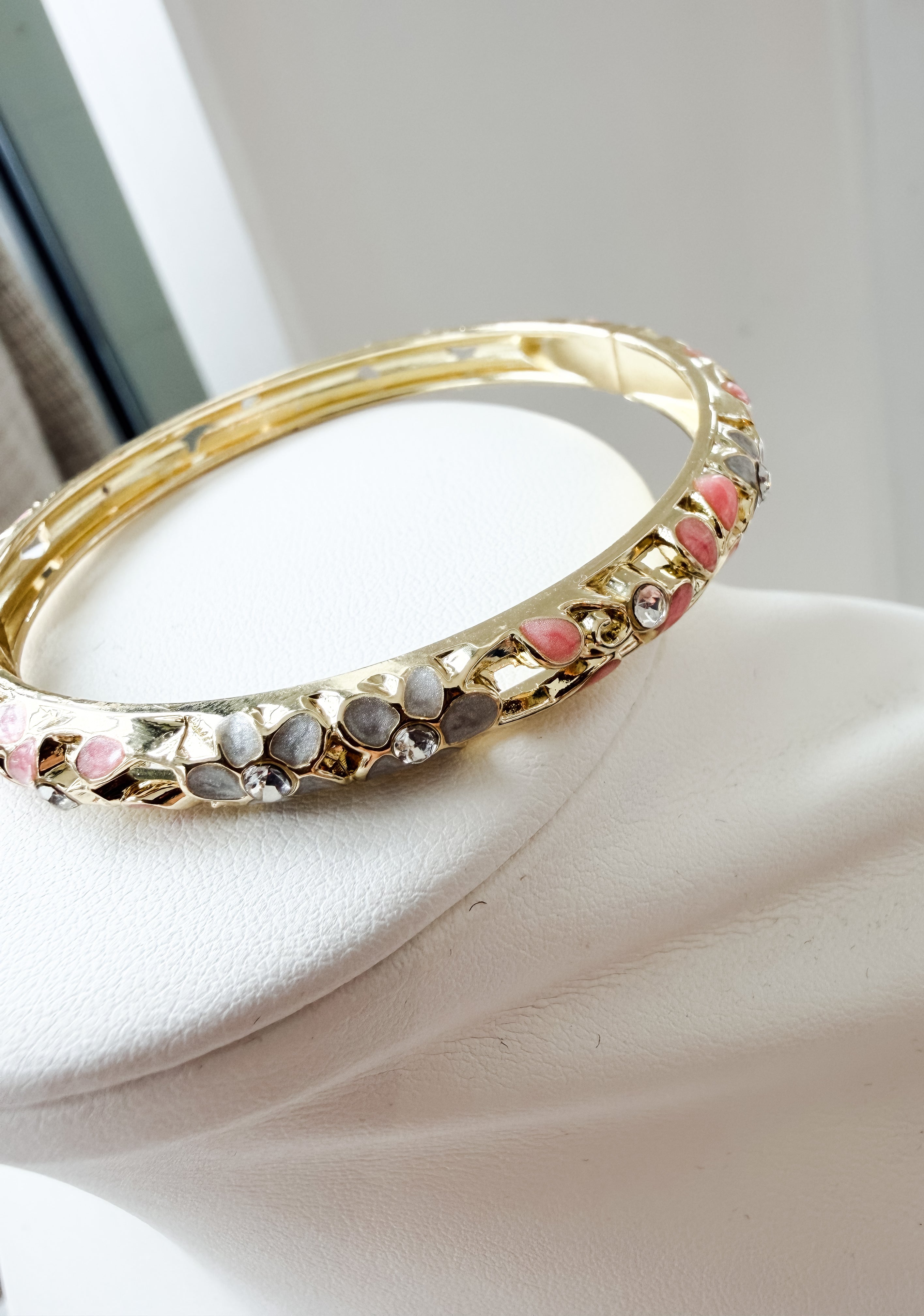 Designed with a secure hinged closure, this bracelet slips on easily while offering a polished, structured feel. The glossy gold finish paired with soft florals makes it a standout piece that still feels wearable for everyday styling.