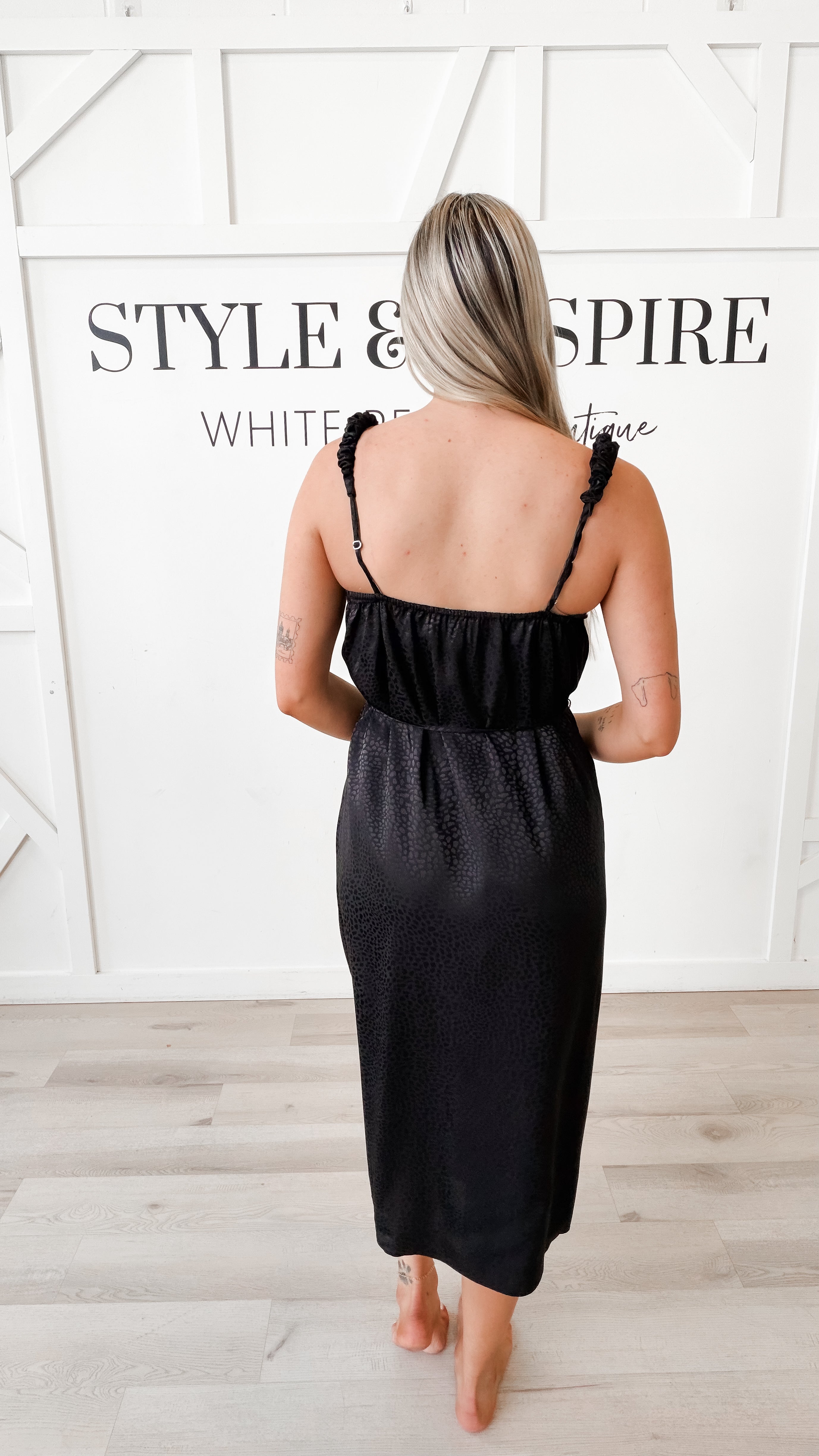Style:   Elevate your wardrobe with the Amara Speckled Satin Midi Dress, a sophisticated piece that seamlessly transitions from day to evening. Crafted from luxurious speckled satin, this midi dress features a flattering V-neckline and adjustable scrunch spaghetti straps for a customizable fit. The self-tie skinny belt cinches at the waist to define your silhouette, while a subtle side slit adds movement and modern appeal. Perfect for those who appreciate refined fabrics and thoughtful design details.