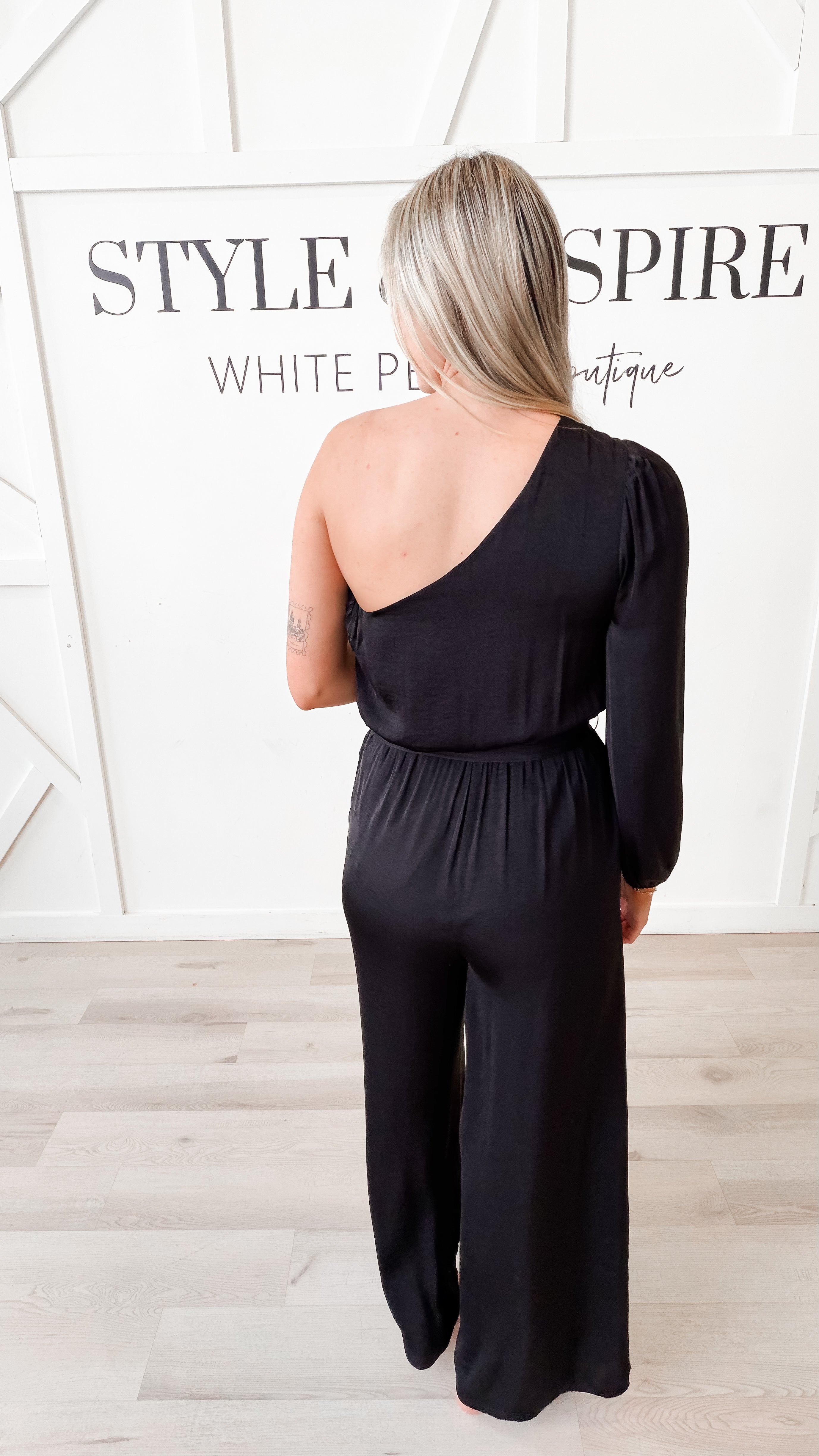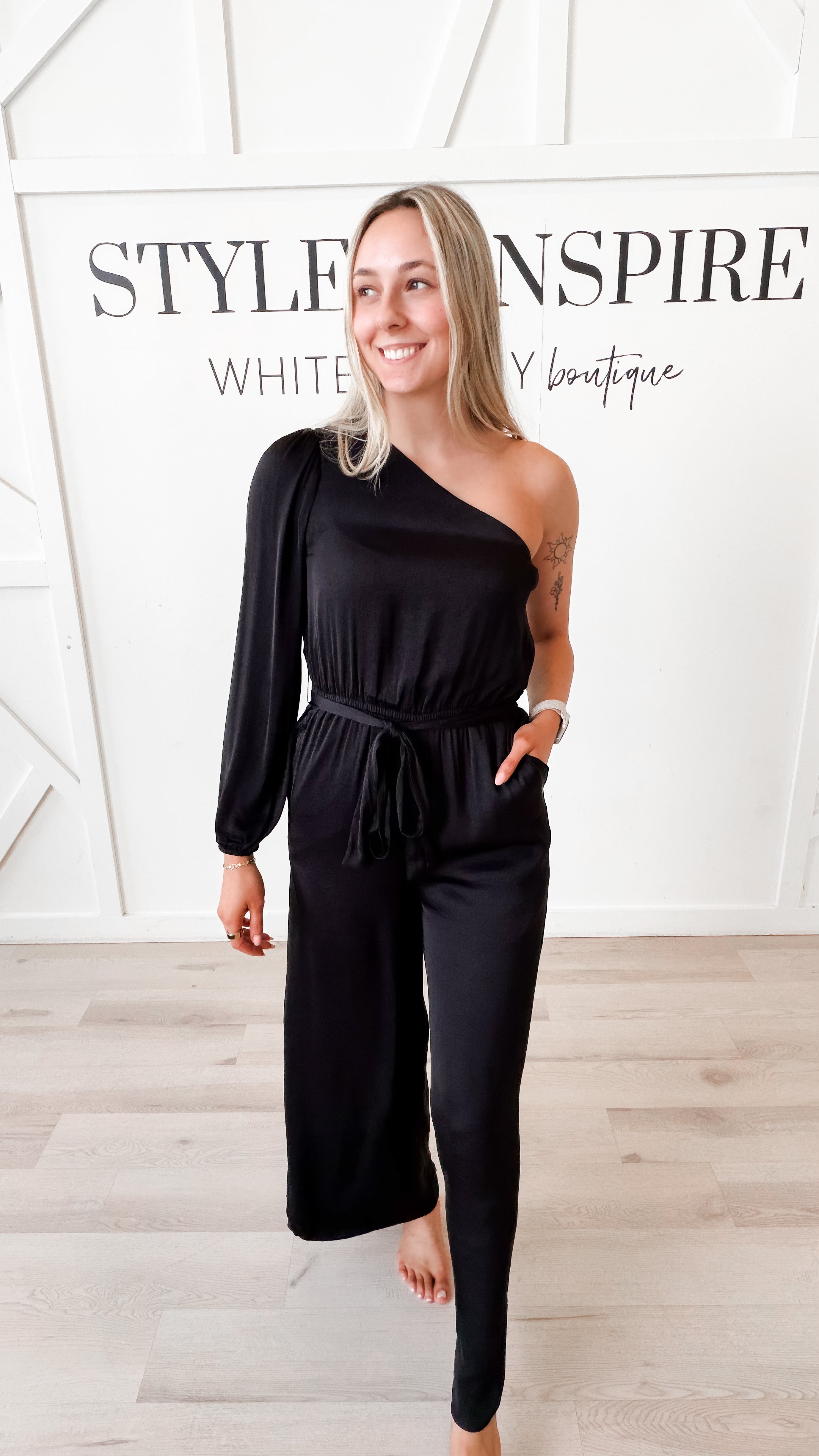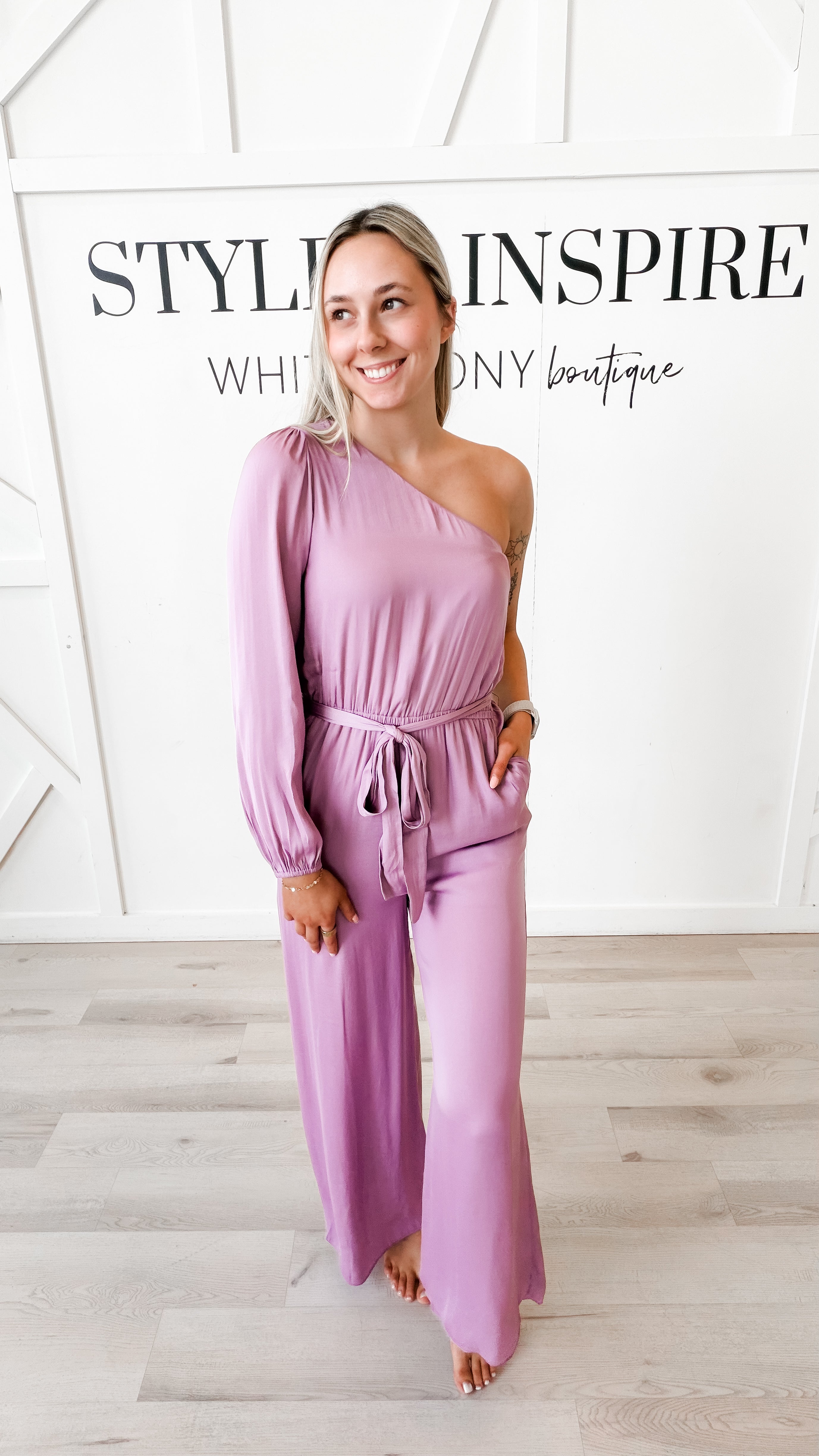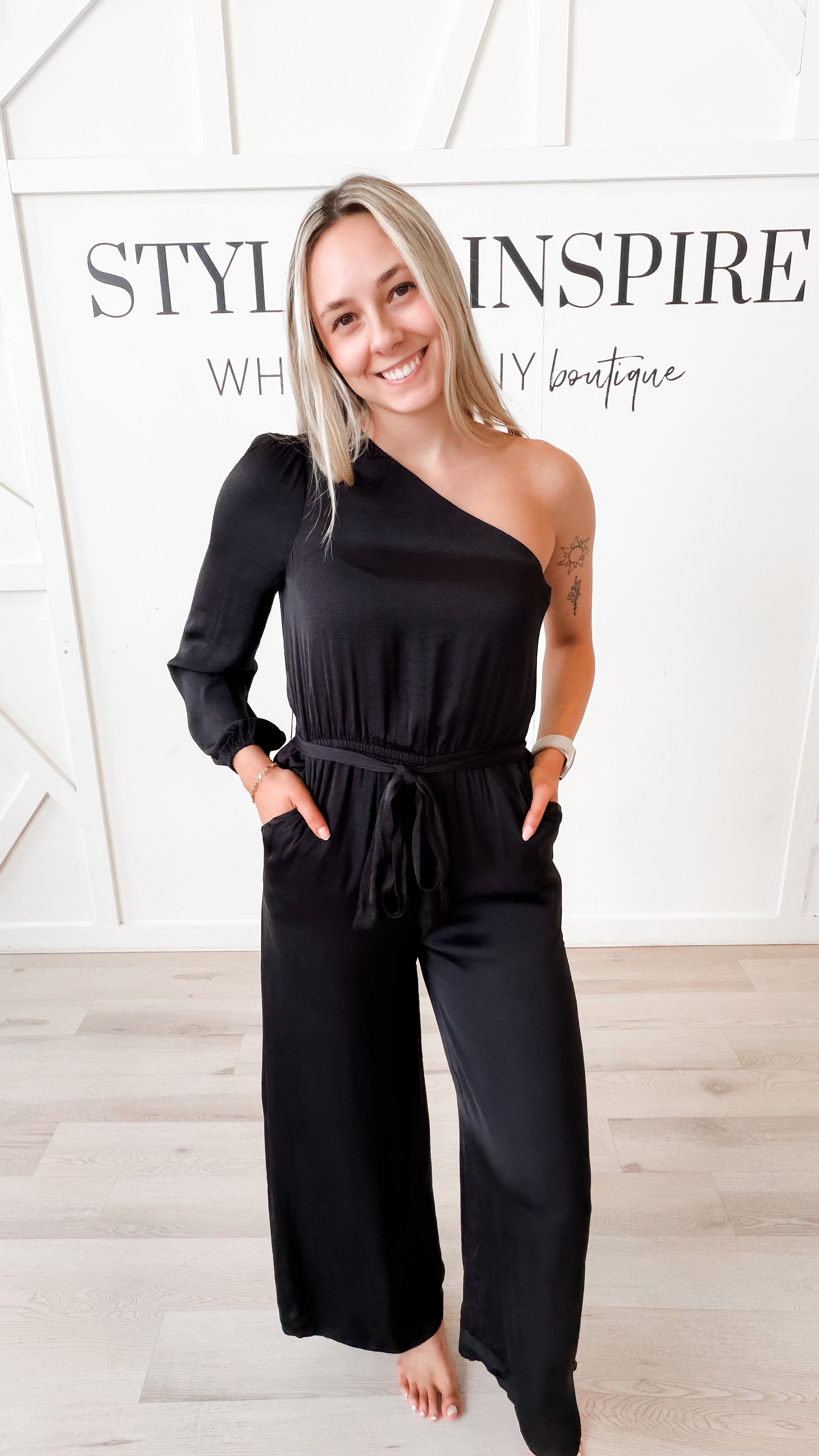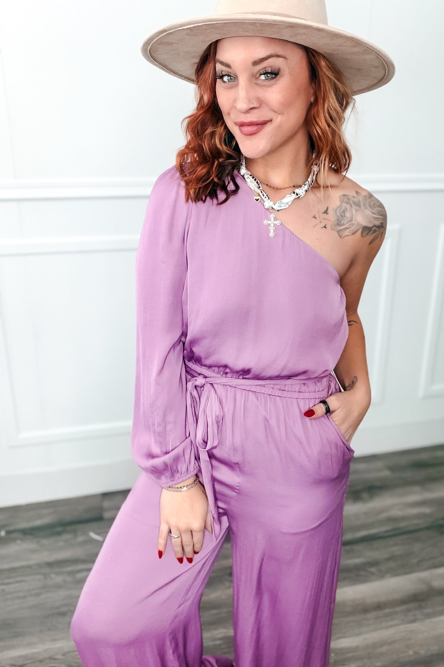 Style: The Delilah One Shoulder Jumpsuit combines sophisticated design with everyday wearability. Crafted from luxurious silky satin, this piece features an elegant one-shoulder neckline and long sleeves with elastic wrists for a polished finish. The elastic waist with self-tie belt allows for customizable shaping, while side hand pockets add practical functionality. Straight-leg silhouette creates a streamlined, versatile look that transitions seamlessly from evening events to upscale casual occasions.