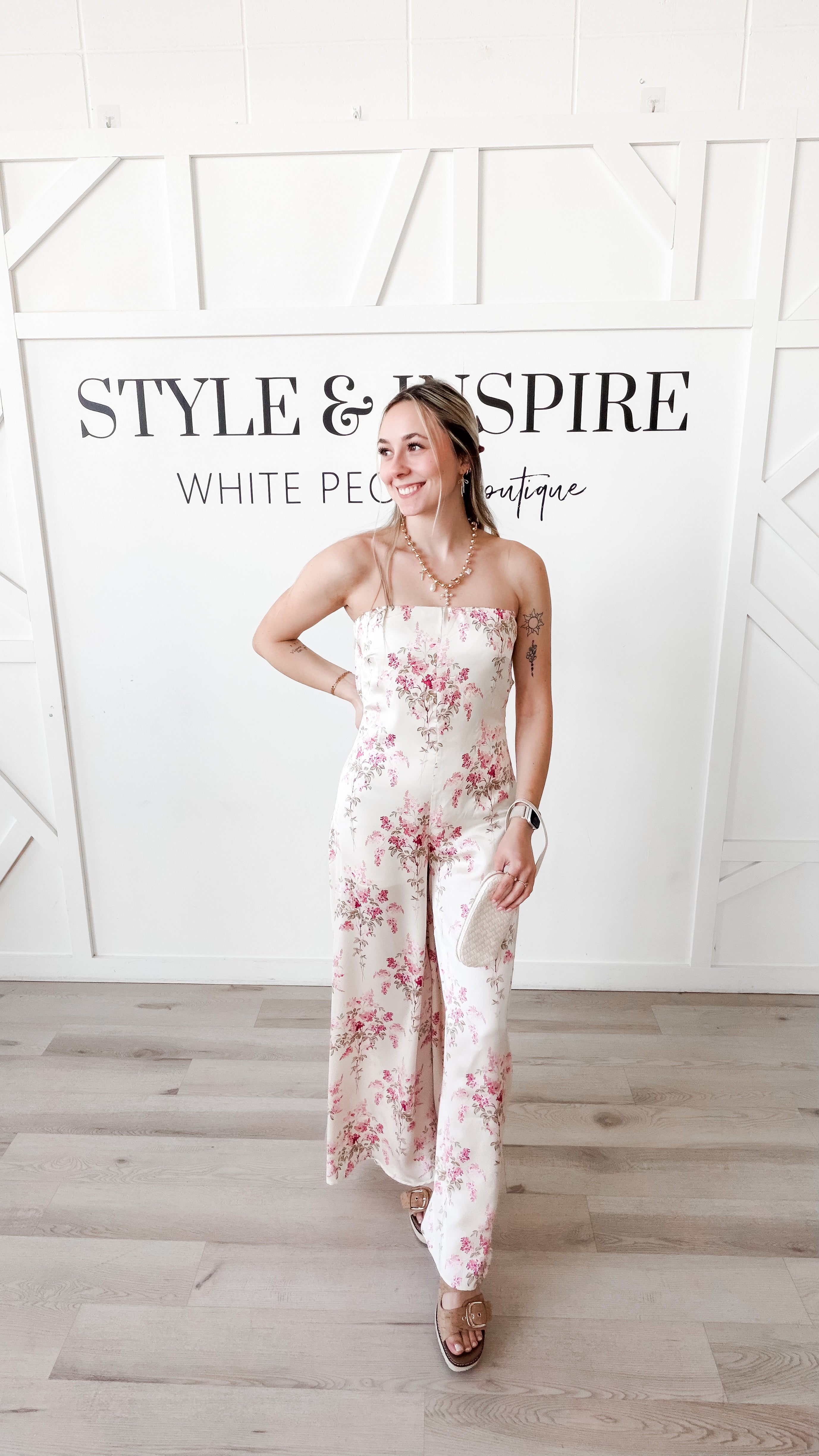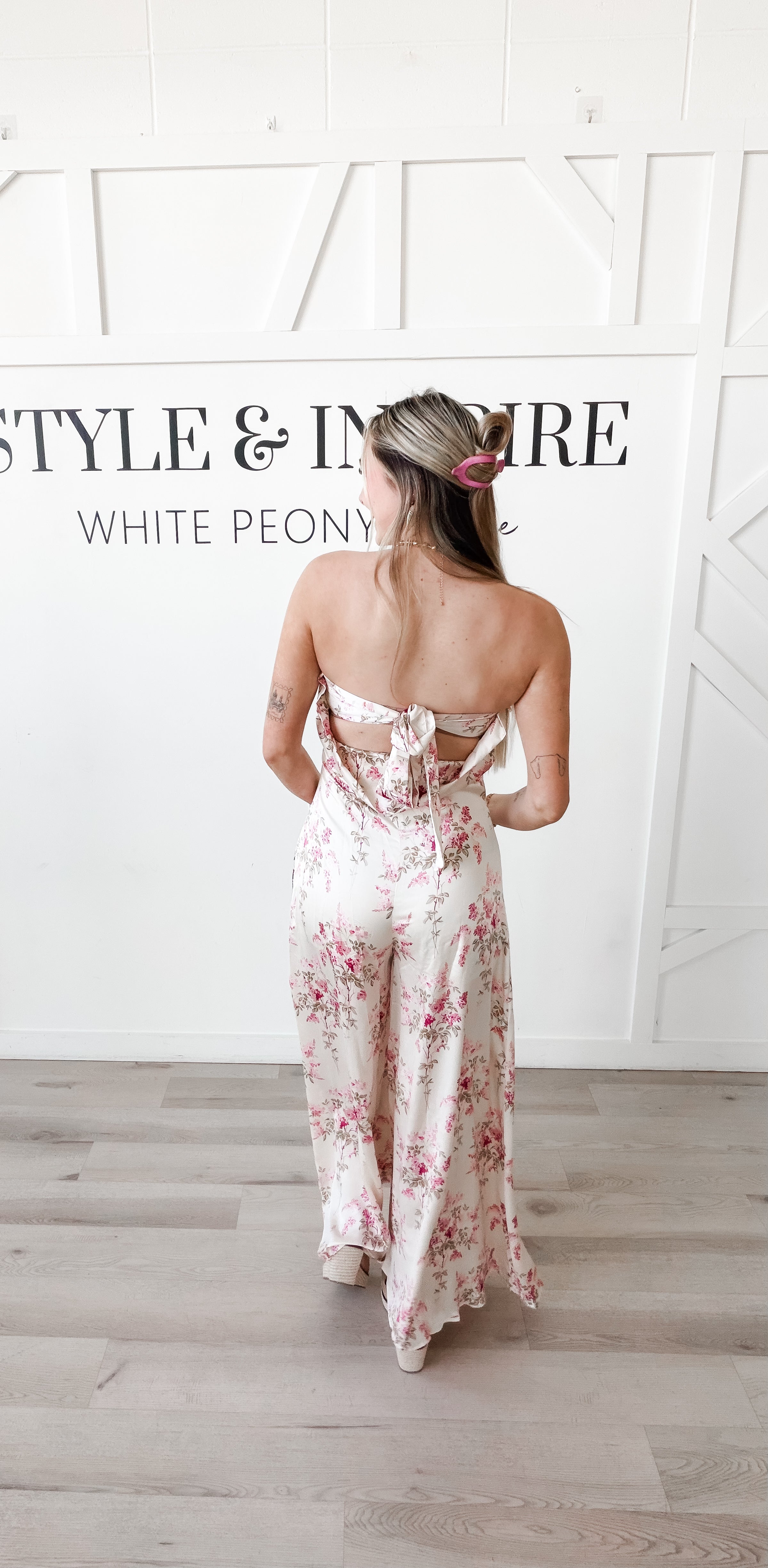 Style: Elevate your evening attire with this sophisticated strapless jumpsuit featuring a distinctive cowl back design with self-tie closure. The wide-leg silhouette creates a flowing, elegant profile while the luxurious satin finish catches the light beautifully. Adorned with a refined floral print, the Melana Jumpsuit transitions effortlessly from cocktail events to formal occasions.