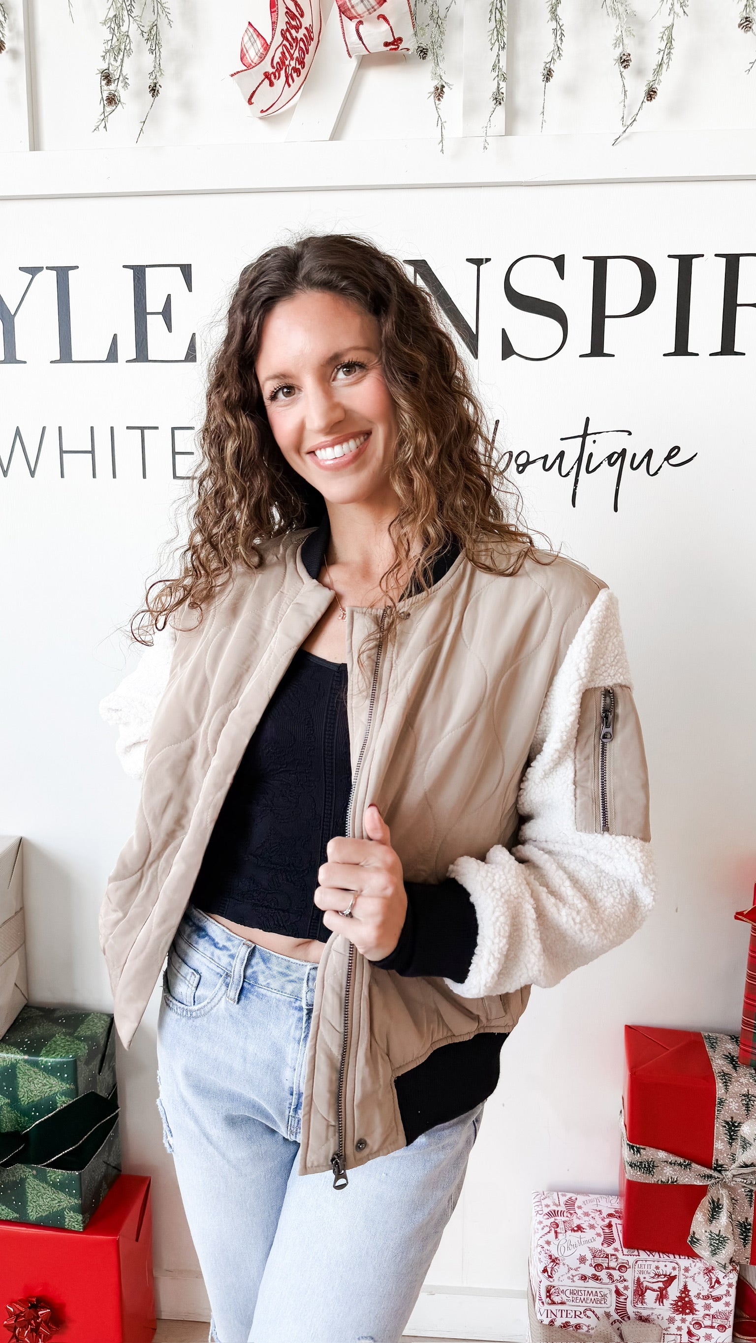 Style: The Jenny Quilted Bomber Jacket combines contemporary design with functional details. This piece features a structured stand-up collar and drop shoulders for a relaxed silhouette, while the front zip closure with hidden placket maintains a clean aesthetic. Long sherpa-lined sleeves provide warmth and texture, complemented by color-block paneling that adds visual interest. A convenient zip pocket on the left sleeve keeps essentials within reach, while elastic ribbing at the collar, cuffs, and hem ensures a secure, tailored fit. Versatile enough for layering or standalone wear, this jacket transitions seamlessly across seasons.