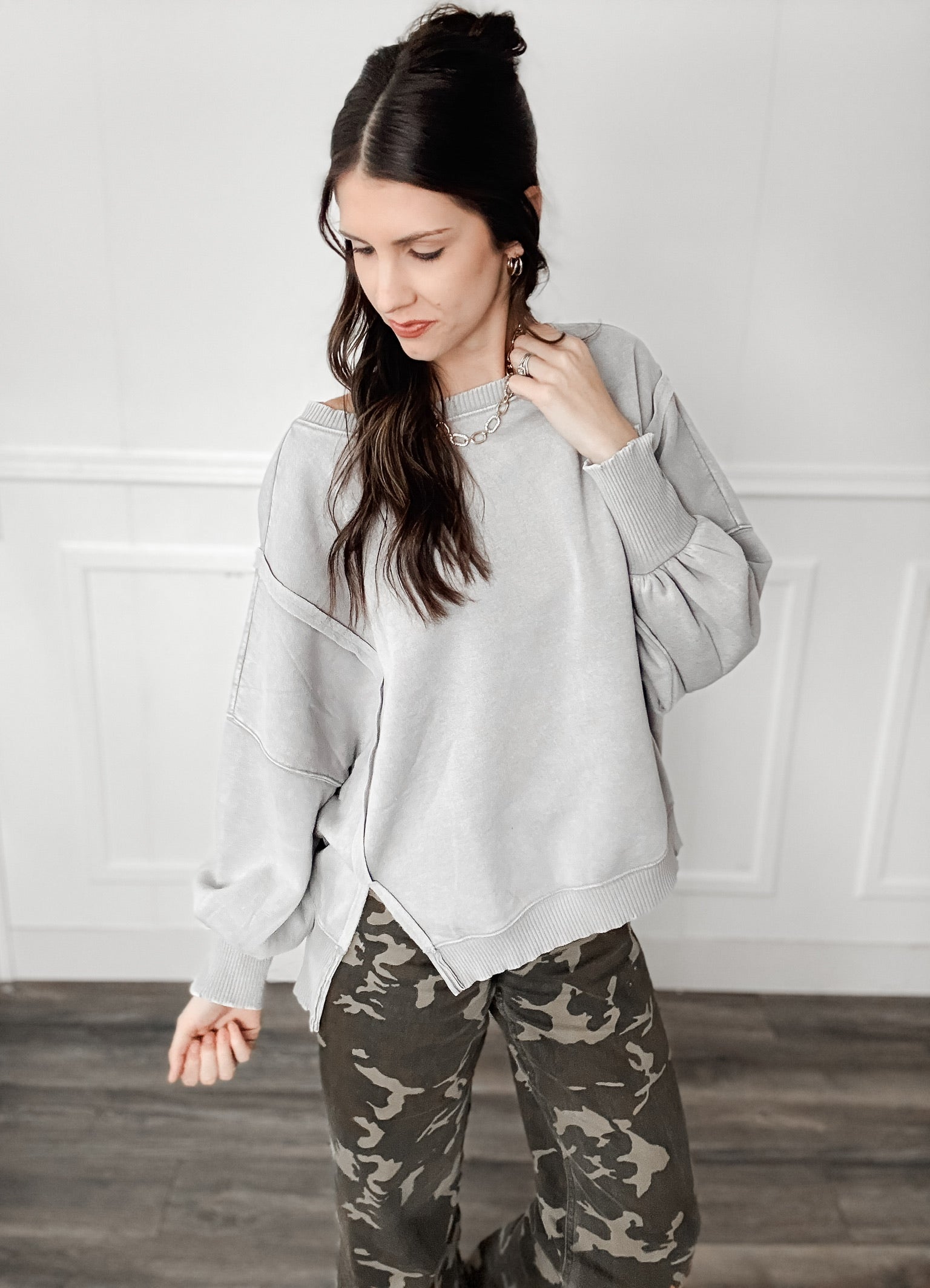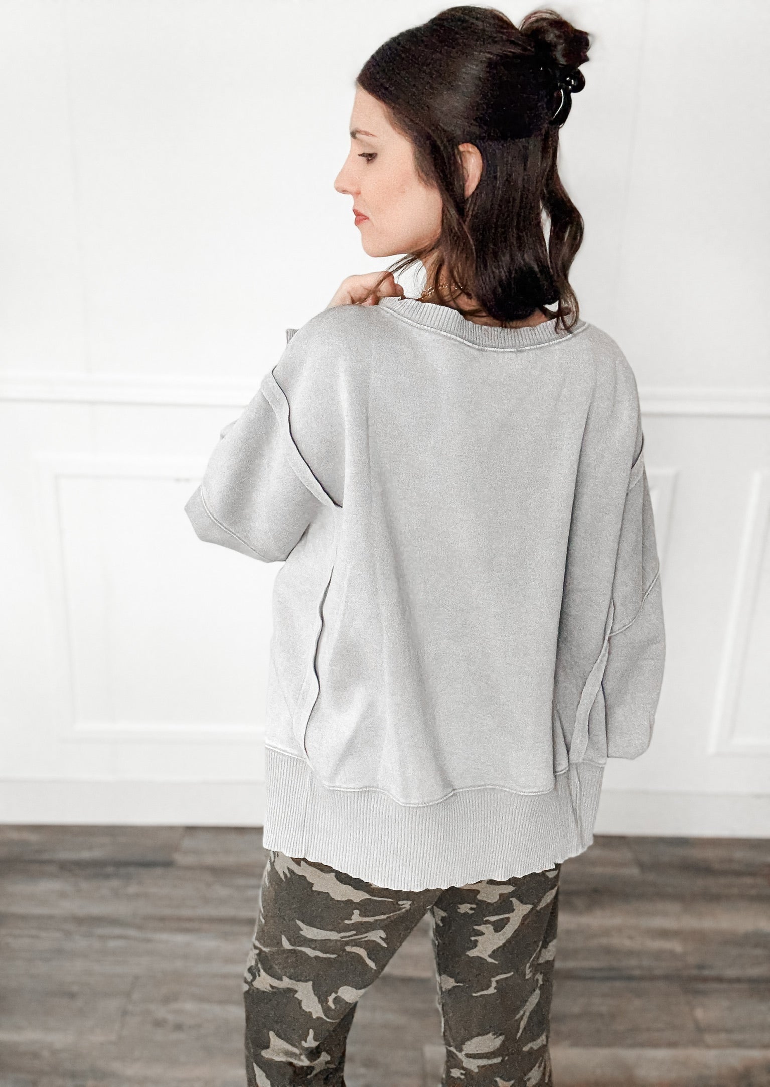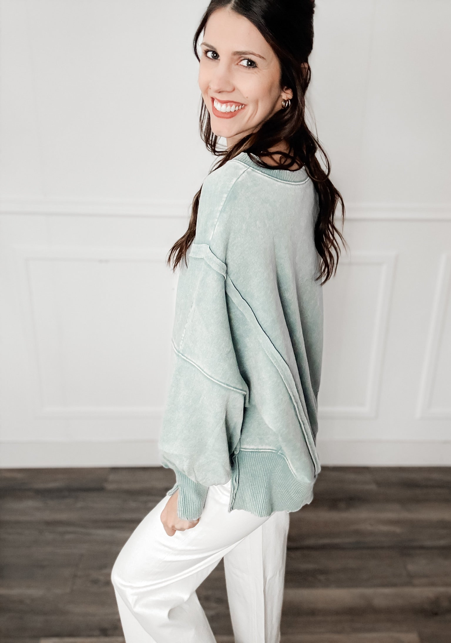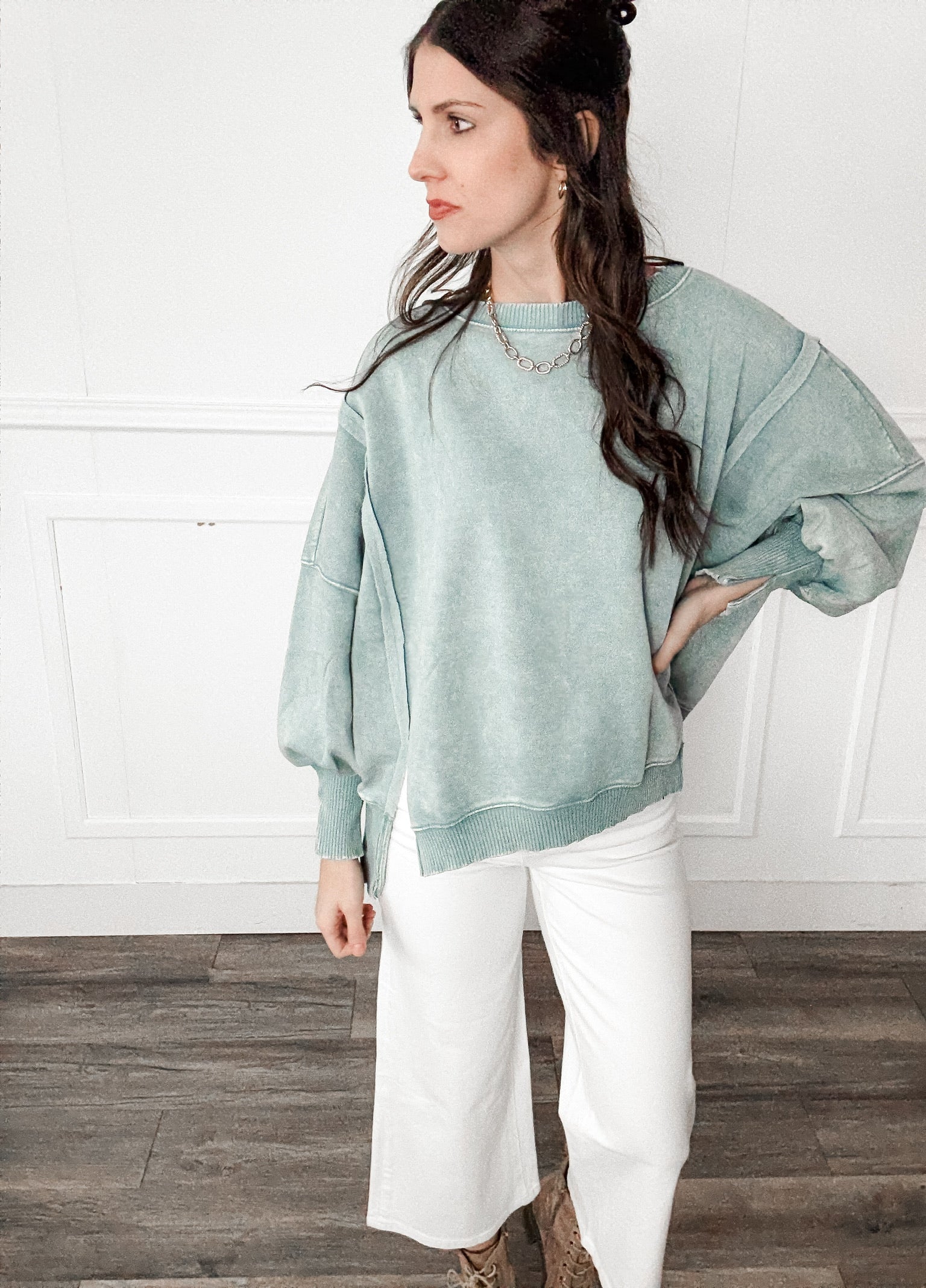 Style: The Monica Batwing High Low Sweatshirt delivers contemporary silhouette with intentional design details. Featuring drop shoulders and dramatic batwing sleeves with subtle pleating at the cuffs, this piece balances structure with movement. The oversized, boxy cut creates a relaxed fit, while contrast ribbing frames the crew neckline, cuffs, and asymmetrical high-low hem. Pleated side slits at the cuffs and hem add functional sophistication. Crafted from soft acid-wash fabric, it offers a lived-in aesthetic with premium comfort. An effortless layering essential for modern wardrobes.