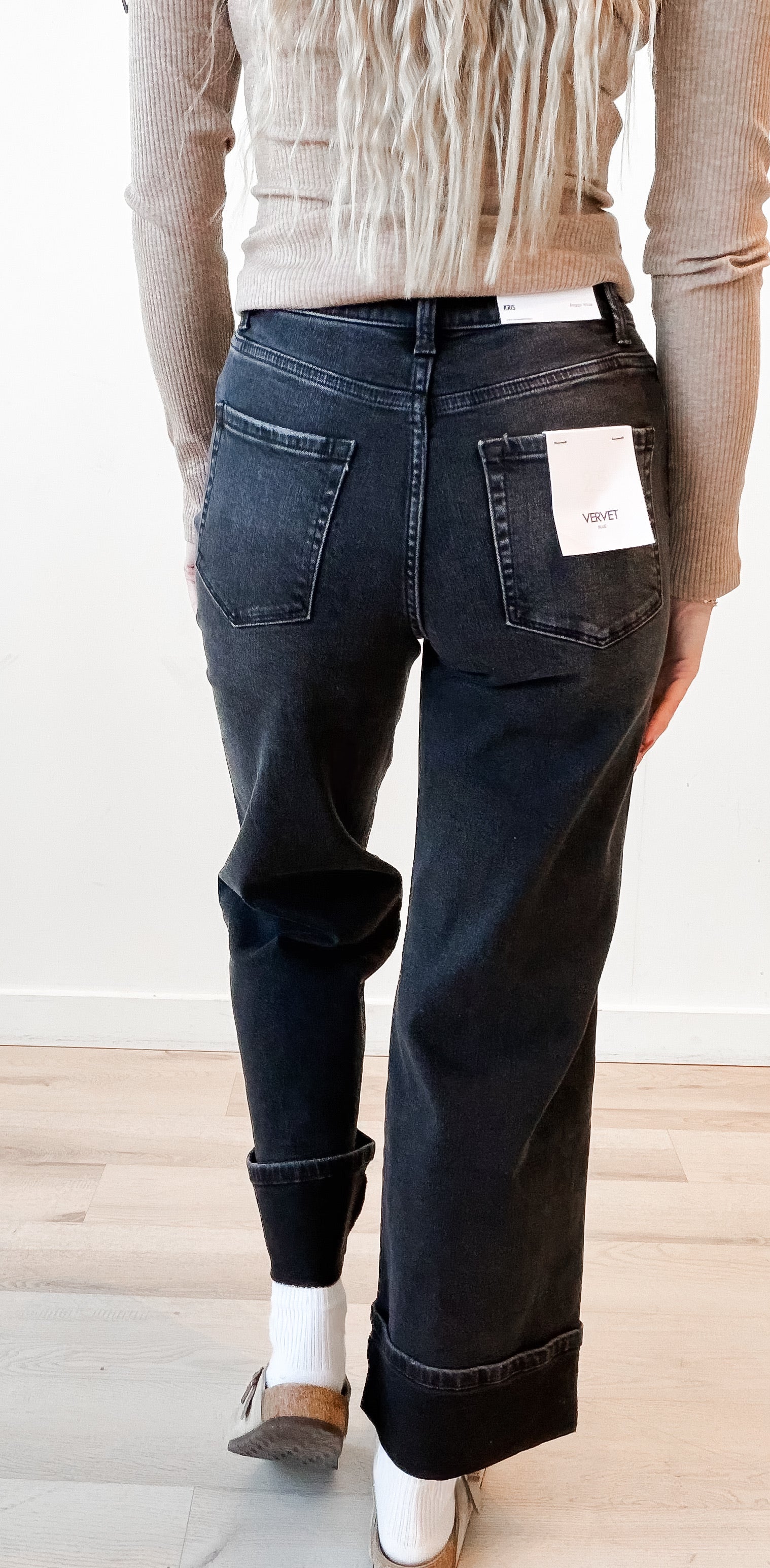 Style: These Vervet Cuffed Baggy Wide Jeans feature a super high rise and a 28" inseam, delivering a modern silhouette with added comfort. Crafted with stretch fabric, they ensure ease of movement throughout the day. The cuffed hem and double front pocket detail add distinctive style, while the clean finish with no distressing keeps the look polished and versatile. Ideal for those seeking a relaxed yet refined fit.