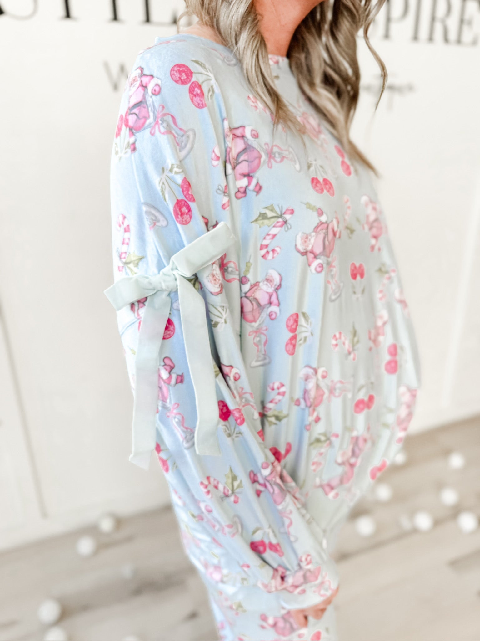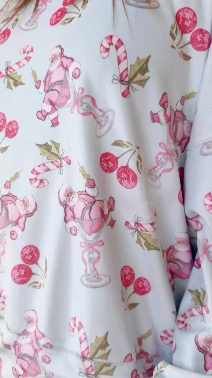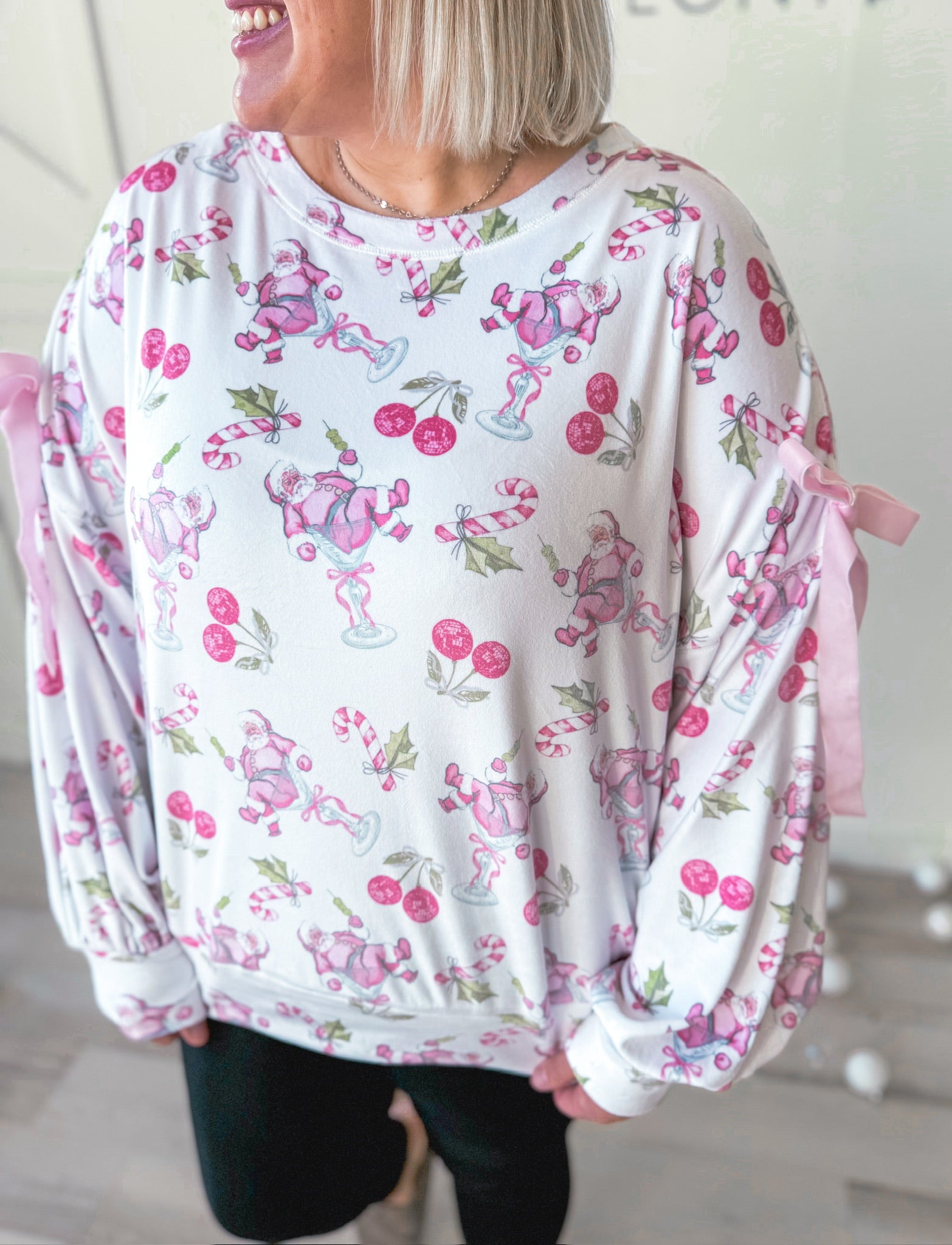 Fit: Crew neck. Drop shoulder with Velvet bow at the arm. Long balloon sleeves with gathered wrists. Straight hem. Super soft velour fabric. Santa sitting in a martini glass, candy canes and Pink disco ball cherries throughout.