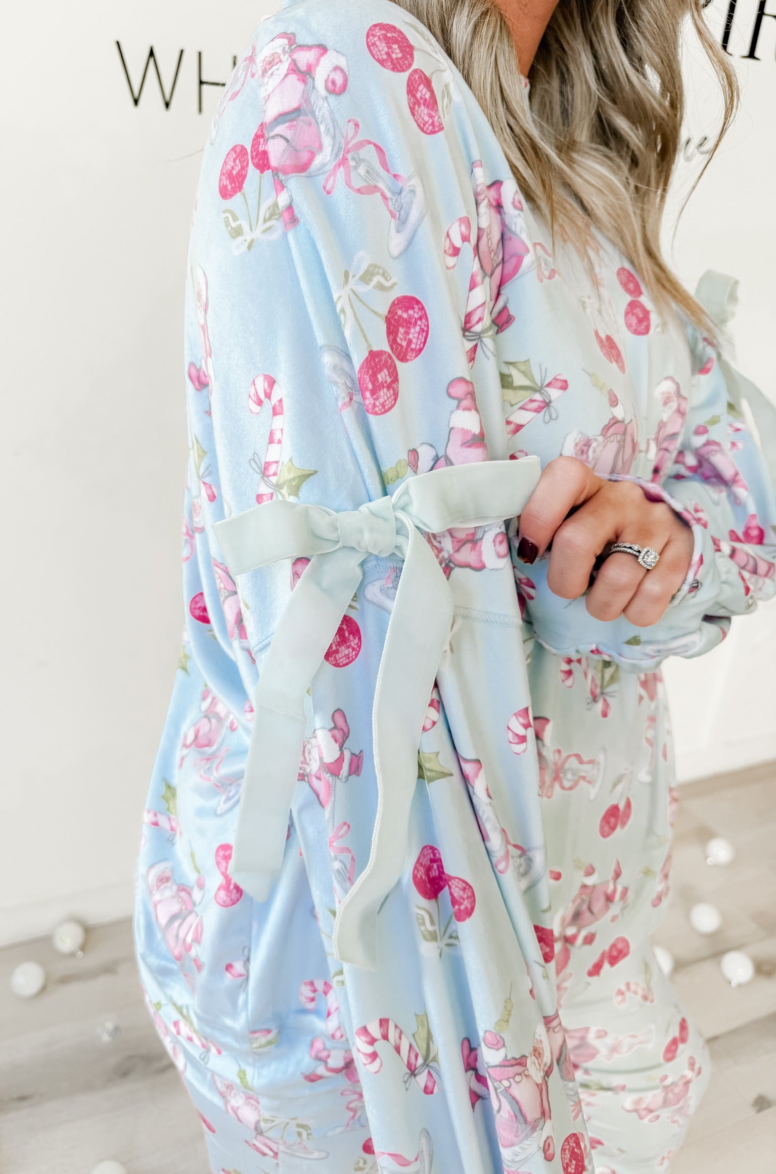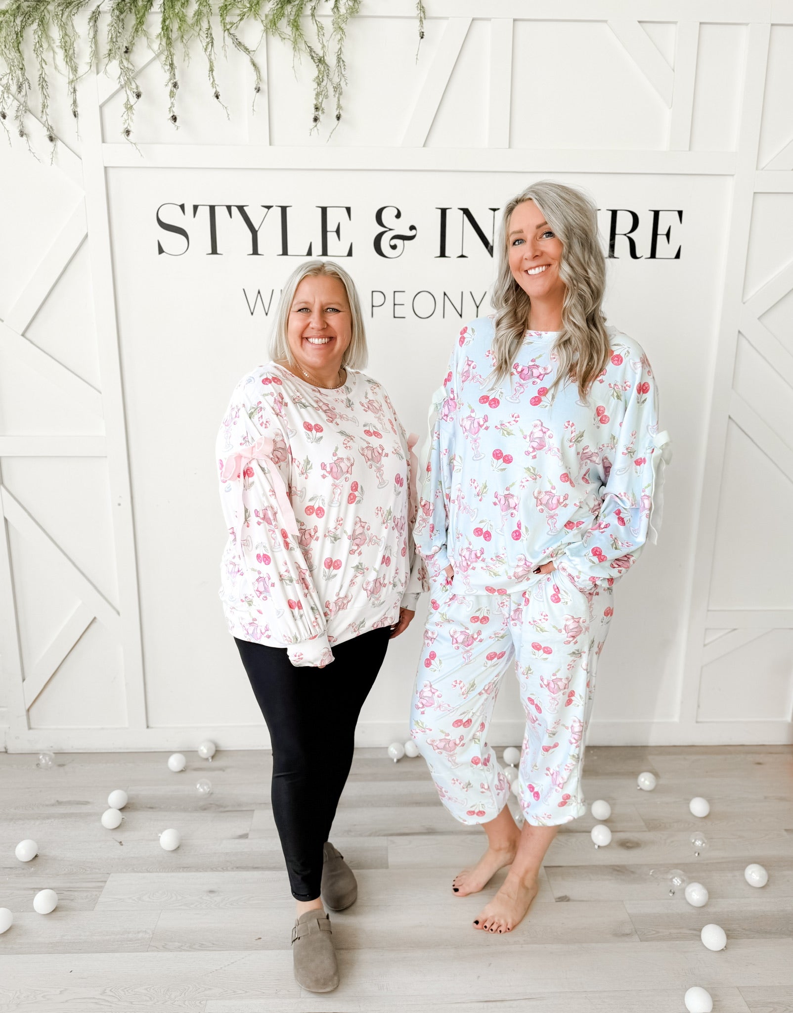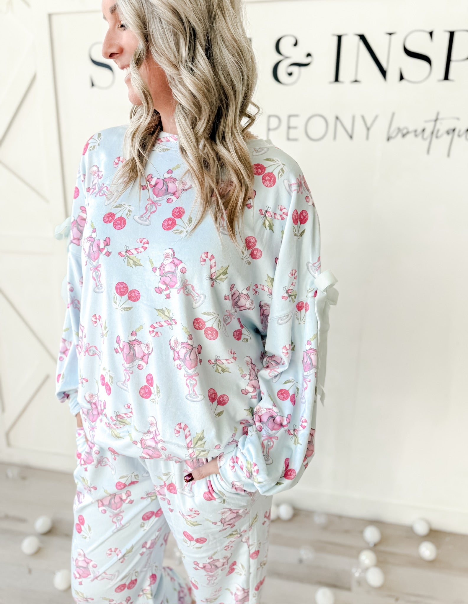 Fit: Crew neck. Drop shoulder with Velvet bow at the arm. Long balloon sleeves with gathered wrists. Straight hem. Super soft velour fabric. Santa sitting in a martini glass, candy canes and Pink disco ball cherries throughout.