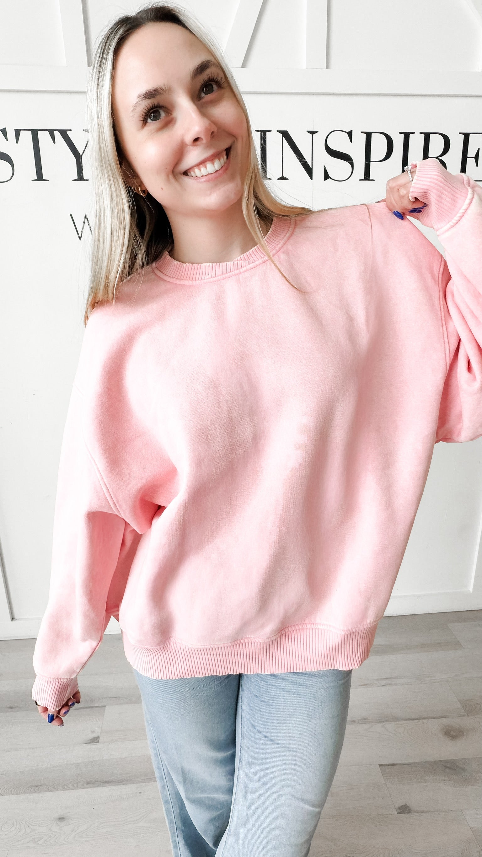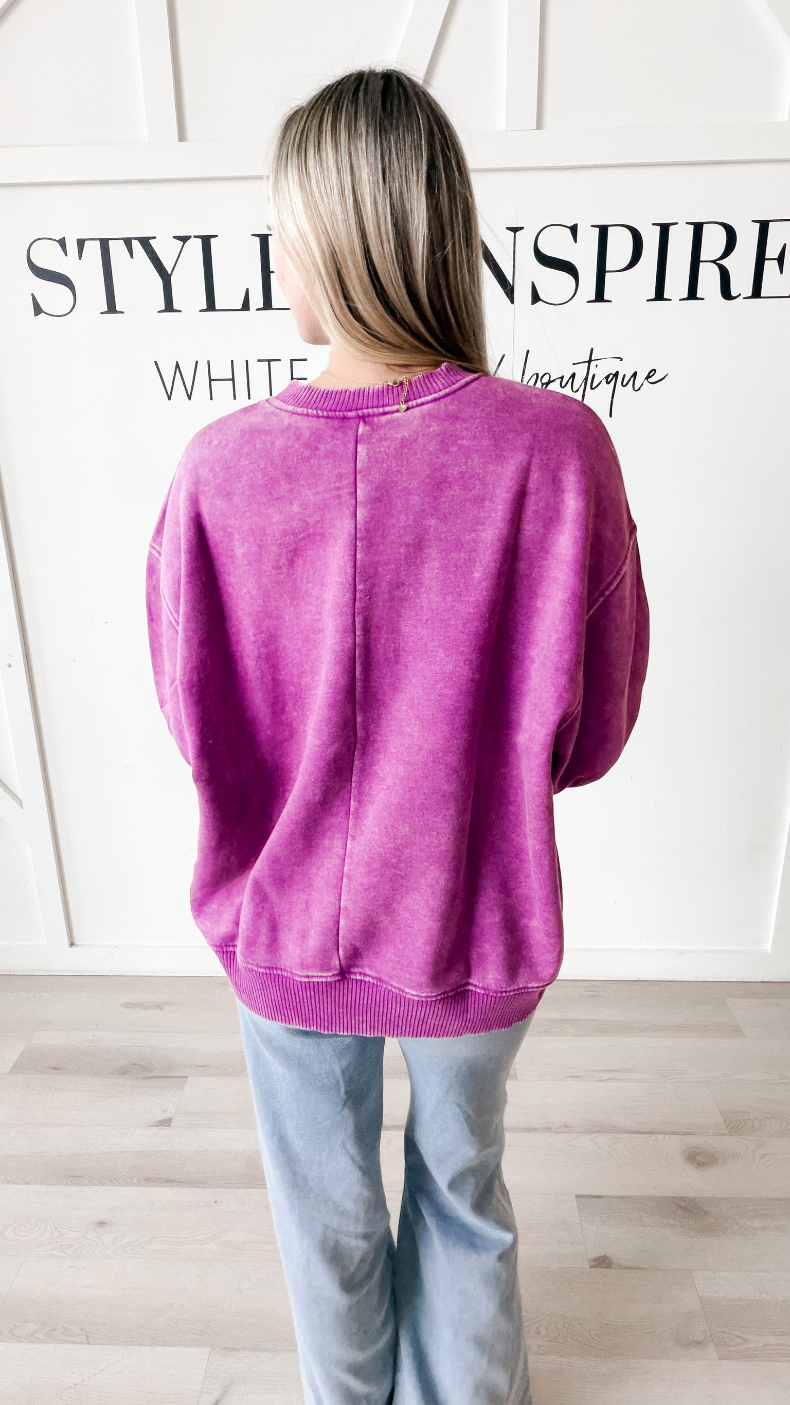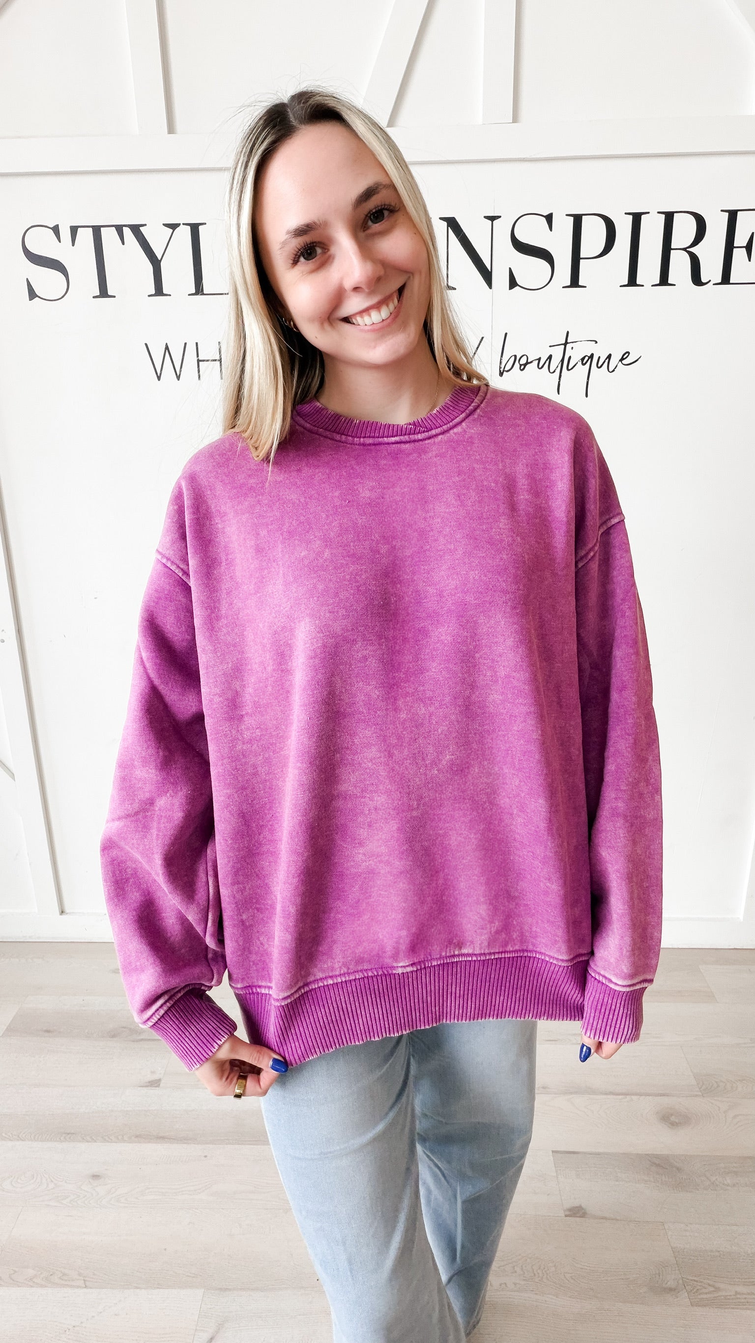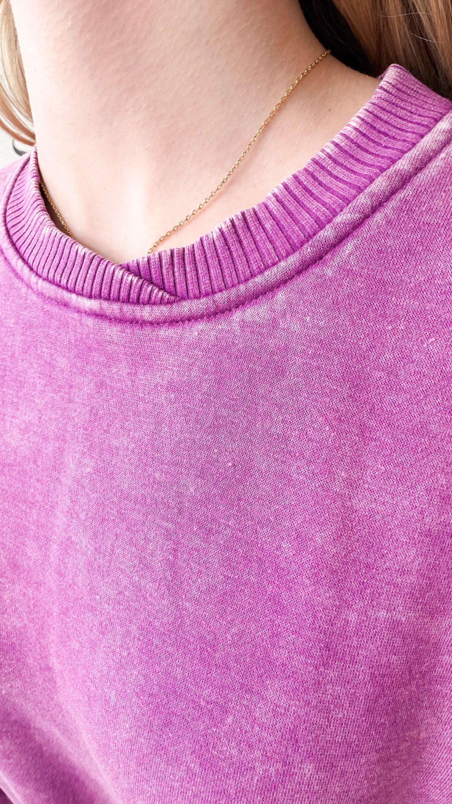 Fit: Crewneck. Drop shoulders. Long sleeves. Contrast ribbing on the neck, cuffs and hem. Super soft. Acid wash coloring. Oversized.