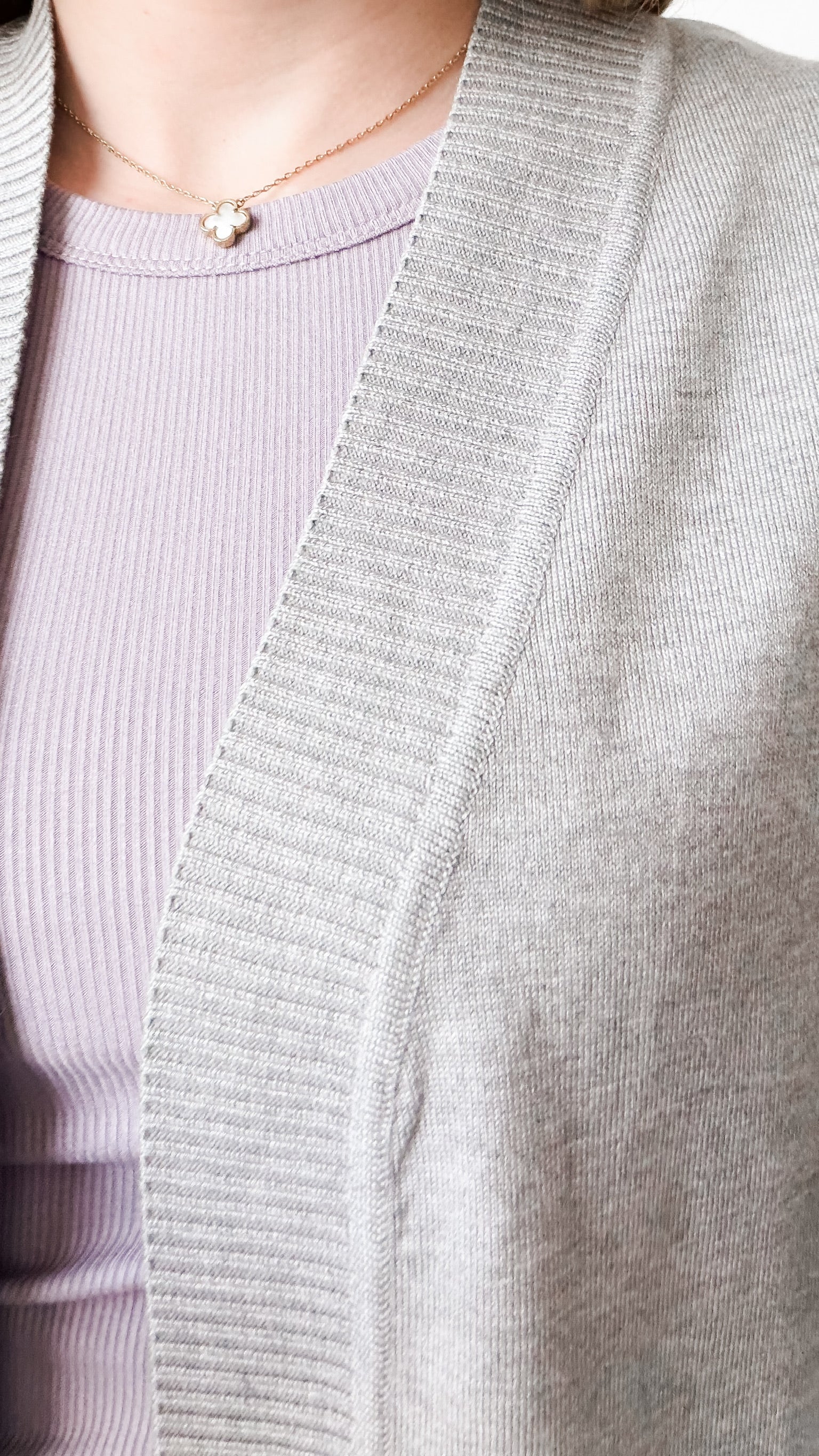Fit: Long line open front. Contrast ribbing on cuffs, pocket trim and front edging. Front patch pockets. Falls around knee length. Light weight and super soft. Sweater knit.