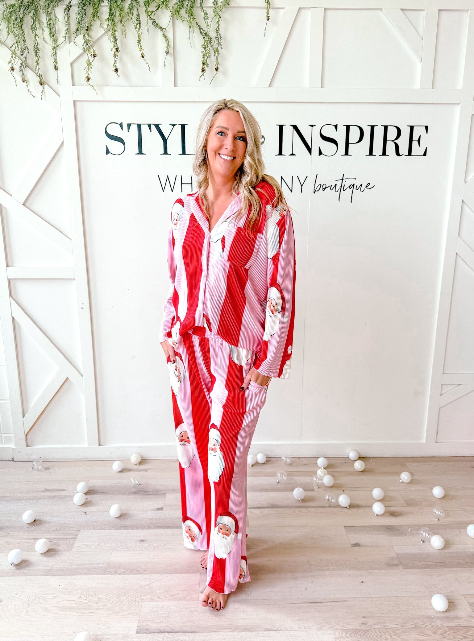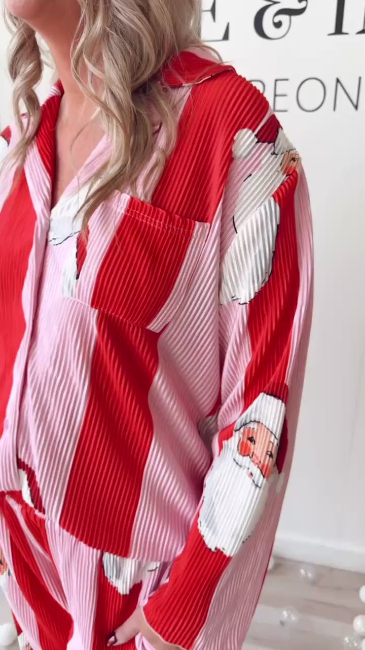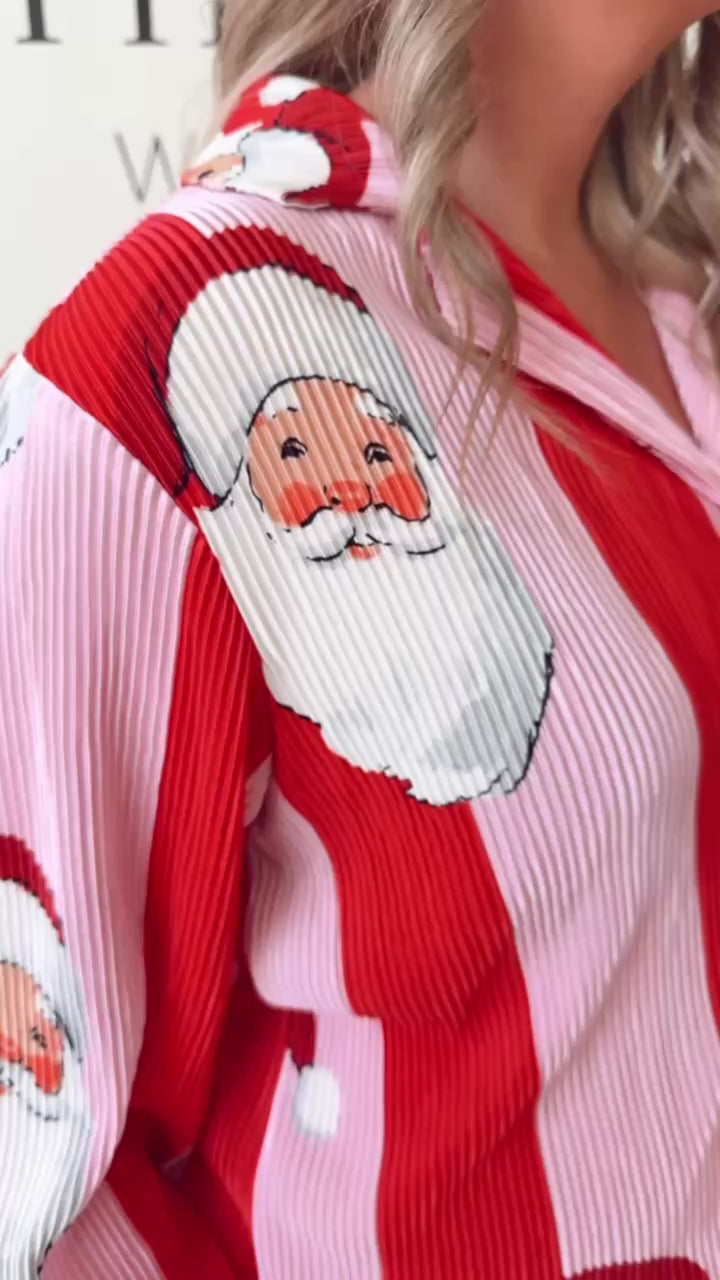 Style: This Pink & Red Santa Pajama Set combines classic style with festive charm. The top features a notched shirt collar, button-down front, long sleeves, and a single chest pocket for traditional comfort. The pants offer an elastic waist for a flexible fit and showcase a playful print of vintage Santa Claus heads. Crafted from lightweight plissé satin, this set ensures a soft, smooth feel ideal for cozy yet stylish holiday lounging.