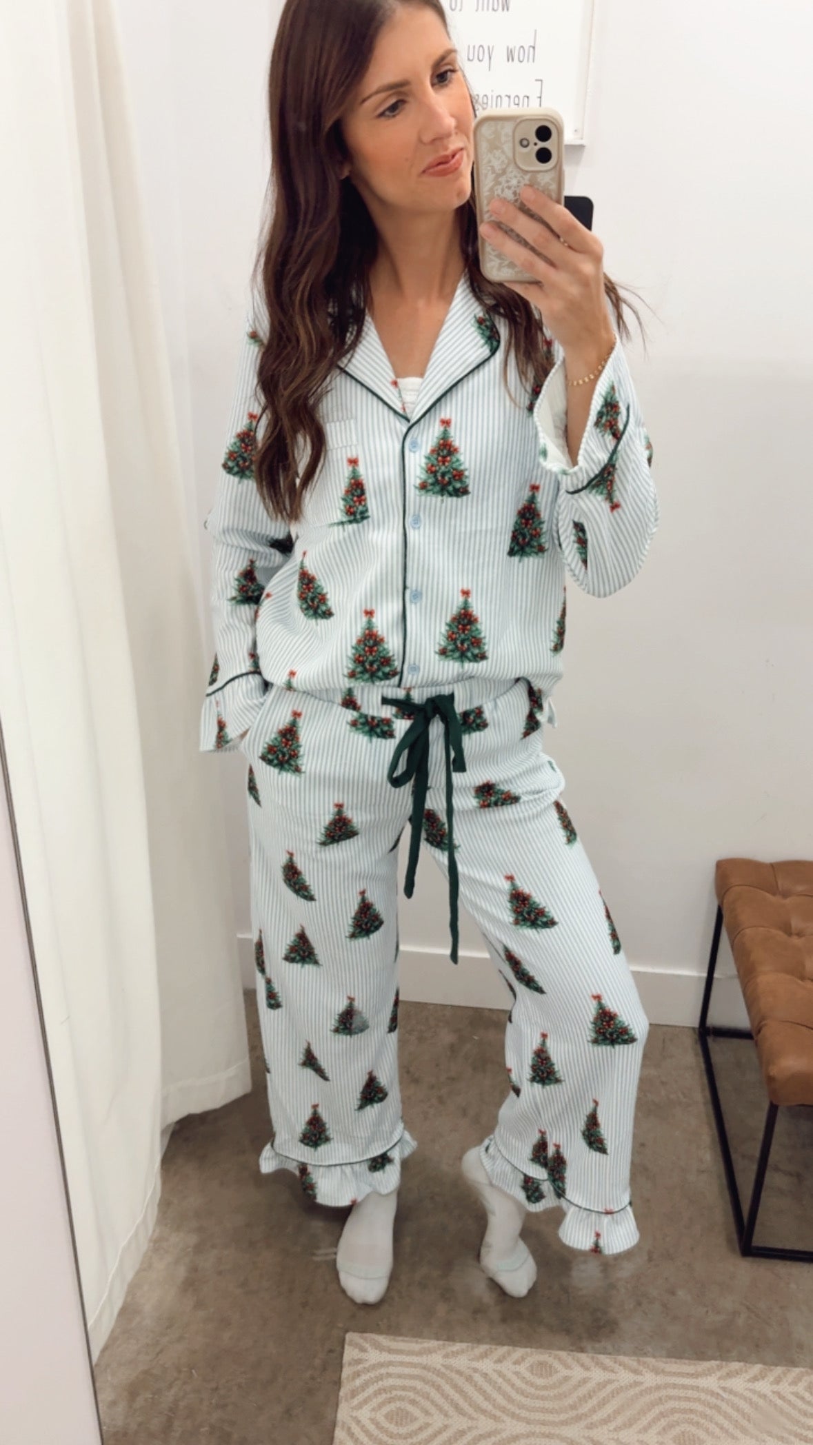 Fit: Top: Notched shirt collar. Button down front. Single chest pocket. Long sleeves. Contrast Piping trim. Ruffle at the cuff. Pants: Elastic waist. Ruffle at hem Light weight. Brushed knit. Subtle blue vertical striping with lit Christmas trees throughout.