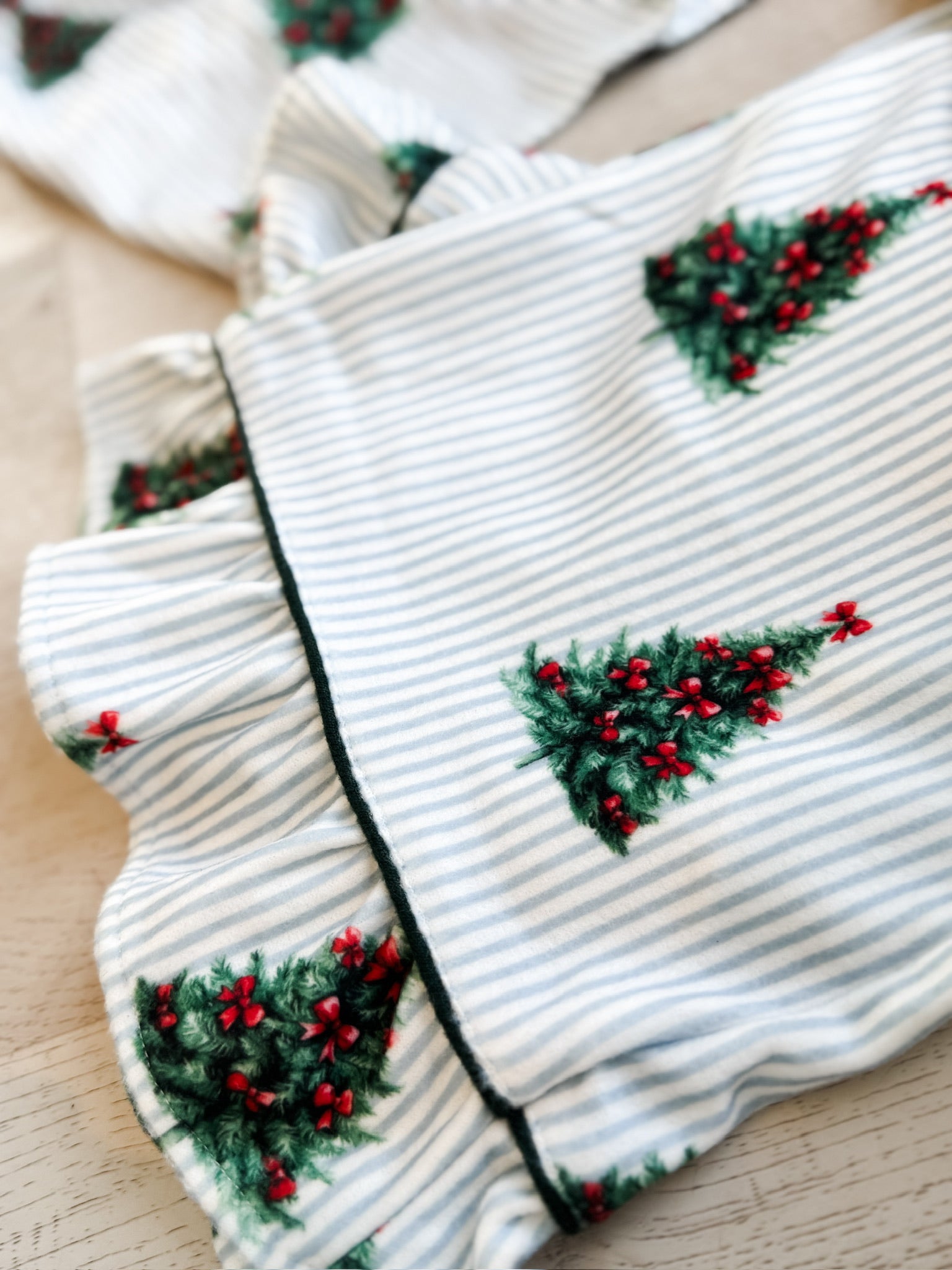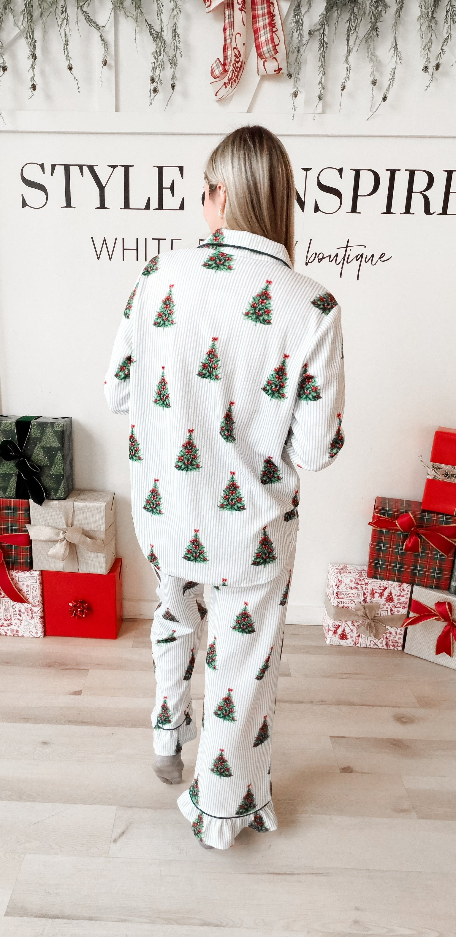 Style: This Striped Christmas Tree Pajama Set combines festive charm with comfortable design. The top features a notched collar, button-down front, and a single chest pocket, accented by contrast piping and ruffled cuffs for refined detail. The lightweight, brushed knit fabric offers softness and warmth, while the subtle blue vertical stripes and delicate Christmas tree pattern evoke a seasonal spirit. Coordinated pants provide an elastic waistband and ruffled hems, ensuring ease of movement and a polished look. Perfect for cozy holiday evenings with style and comfort.