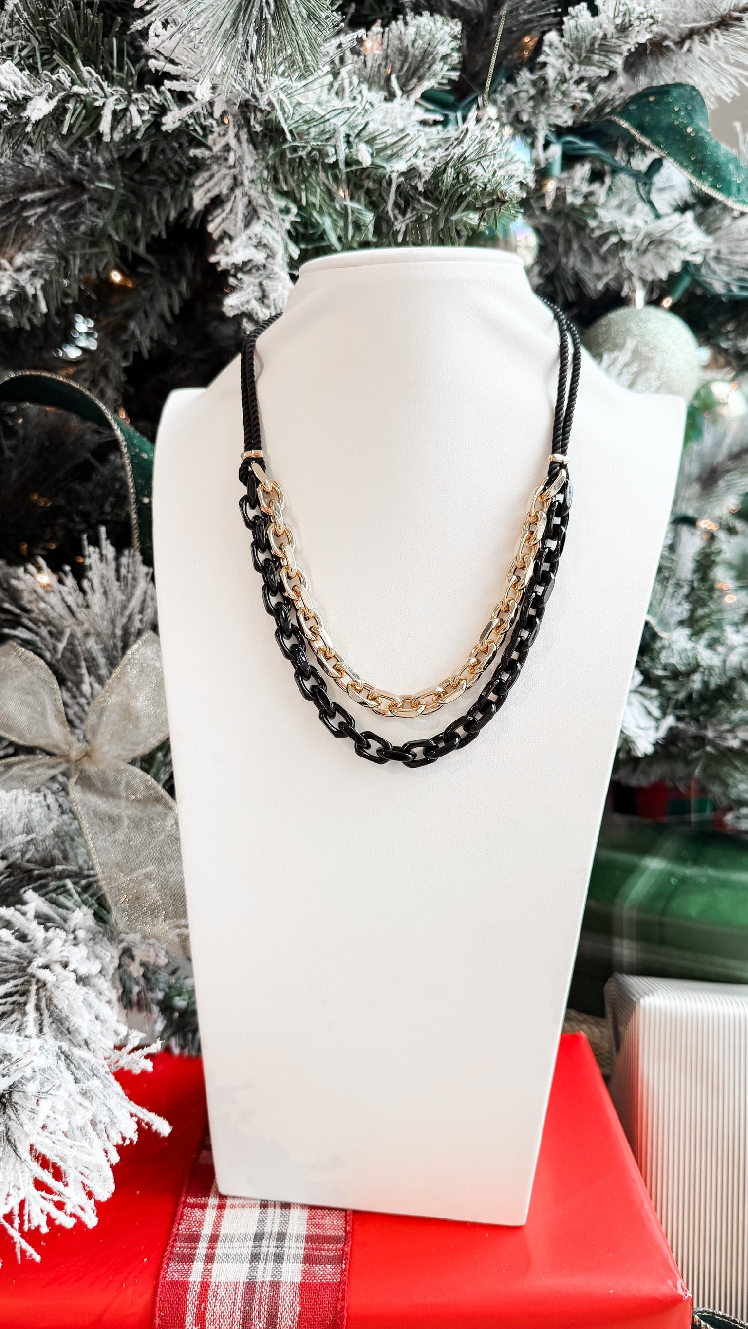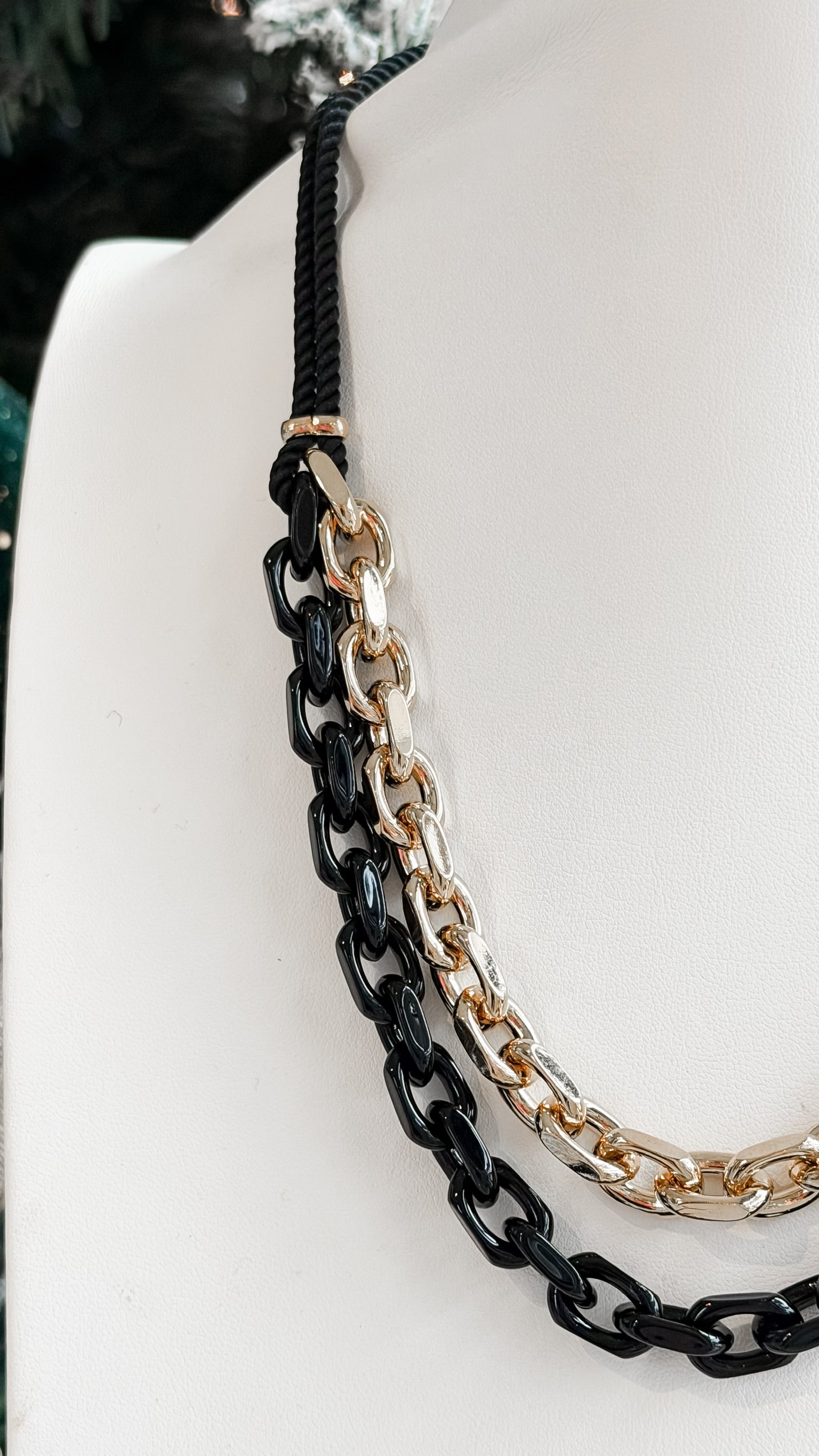 Make a bold statement with the Circle Link Layered Necklace, featuring dual black and gold-tone chains accented by sleek cord details. The contrasting textures and tones create a modern, eye-catching look perfect for adding edge to any outfit. Adjustable lobster clasp closure ensures a comfortable fit.