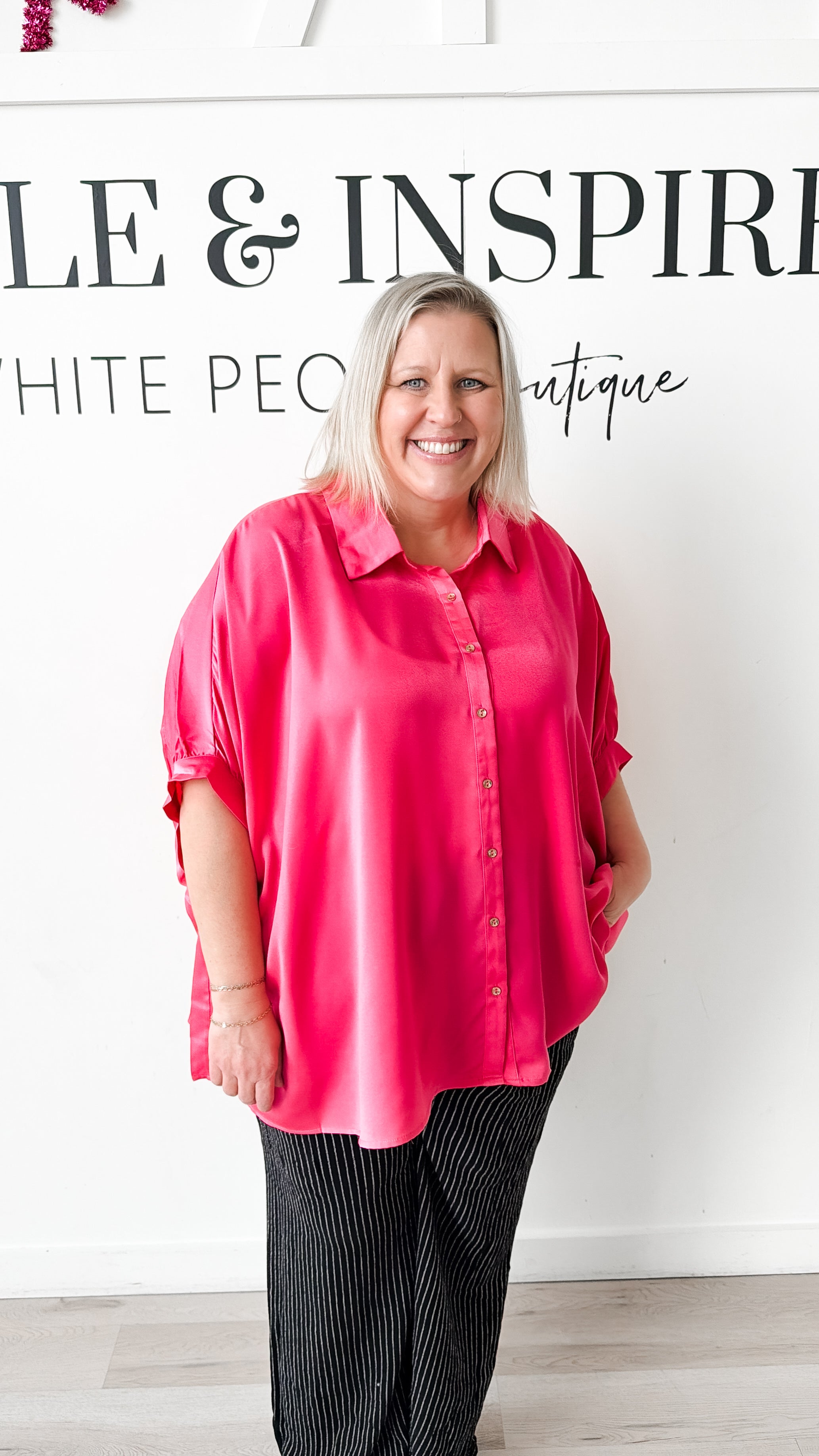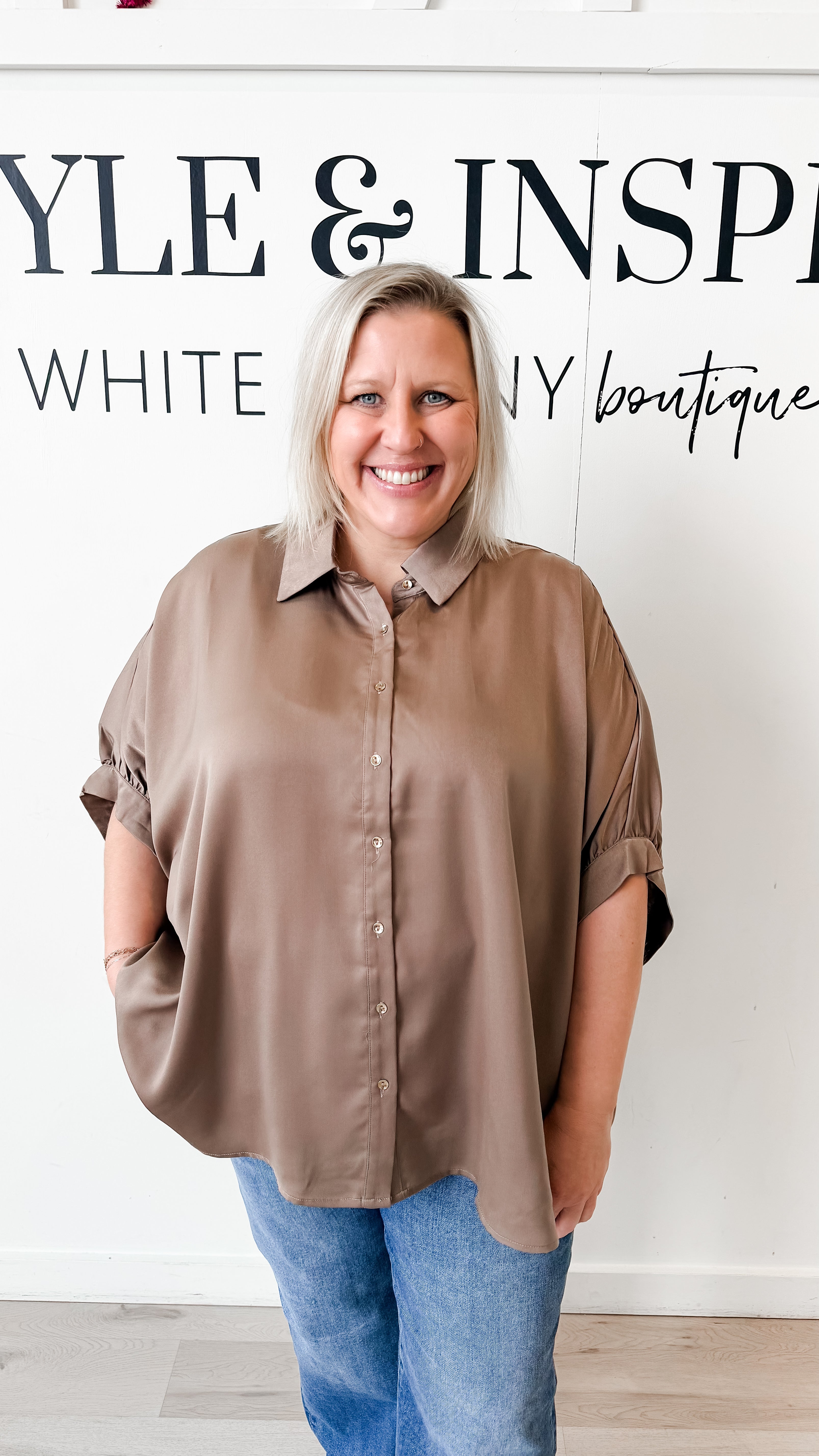 Style: Melody Button Down Satin Swing Top Crafted from lightweight satin, this swing top combines timeless elegance with modern comfort. The button-down collar and full half sleeves with banded cuffs create a polished silhouette, while the generous swing design offers effortless movement and flattering drape. Perfect for layering or wearing solo, this piece transitions seamlessly from day to evening occasions.