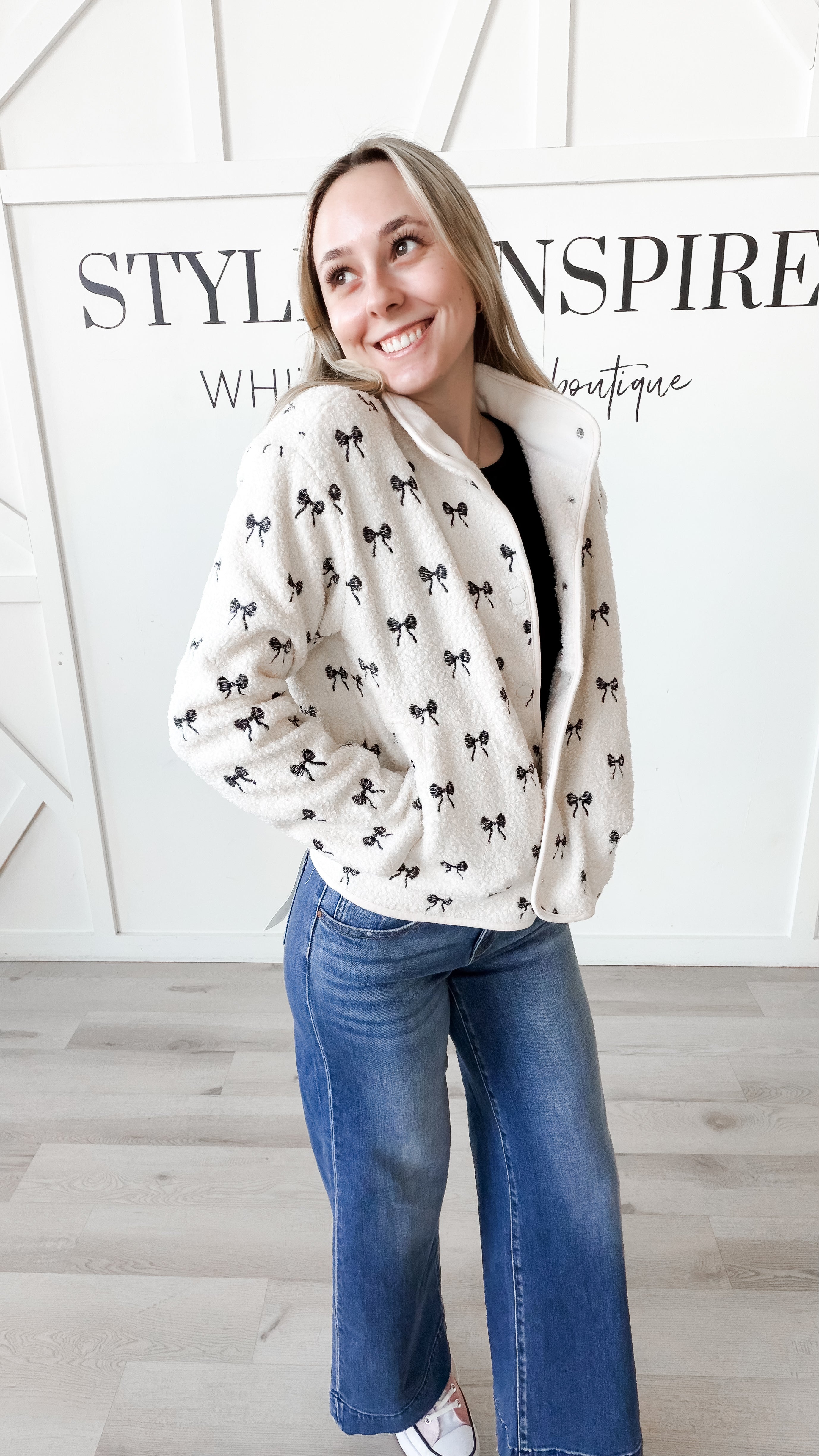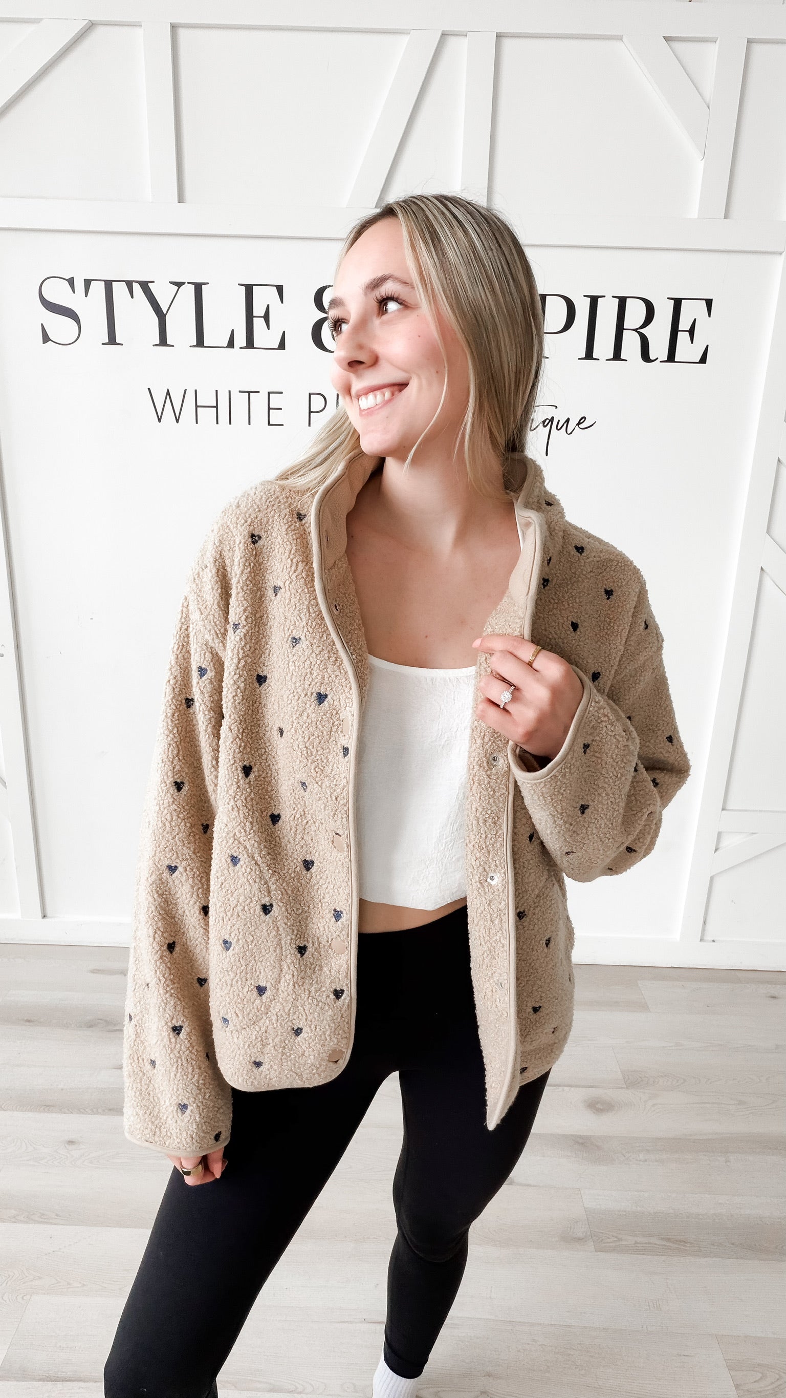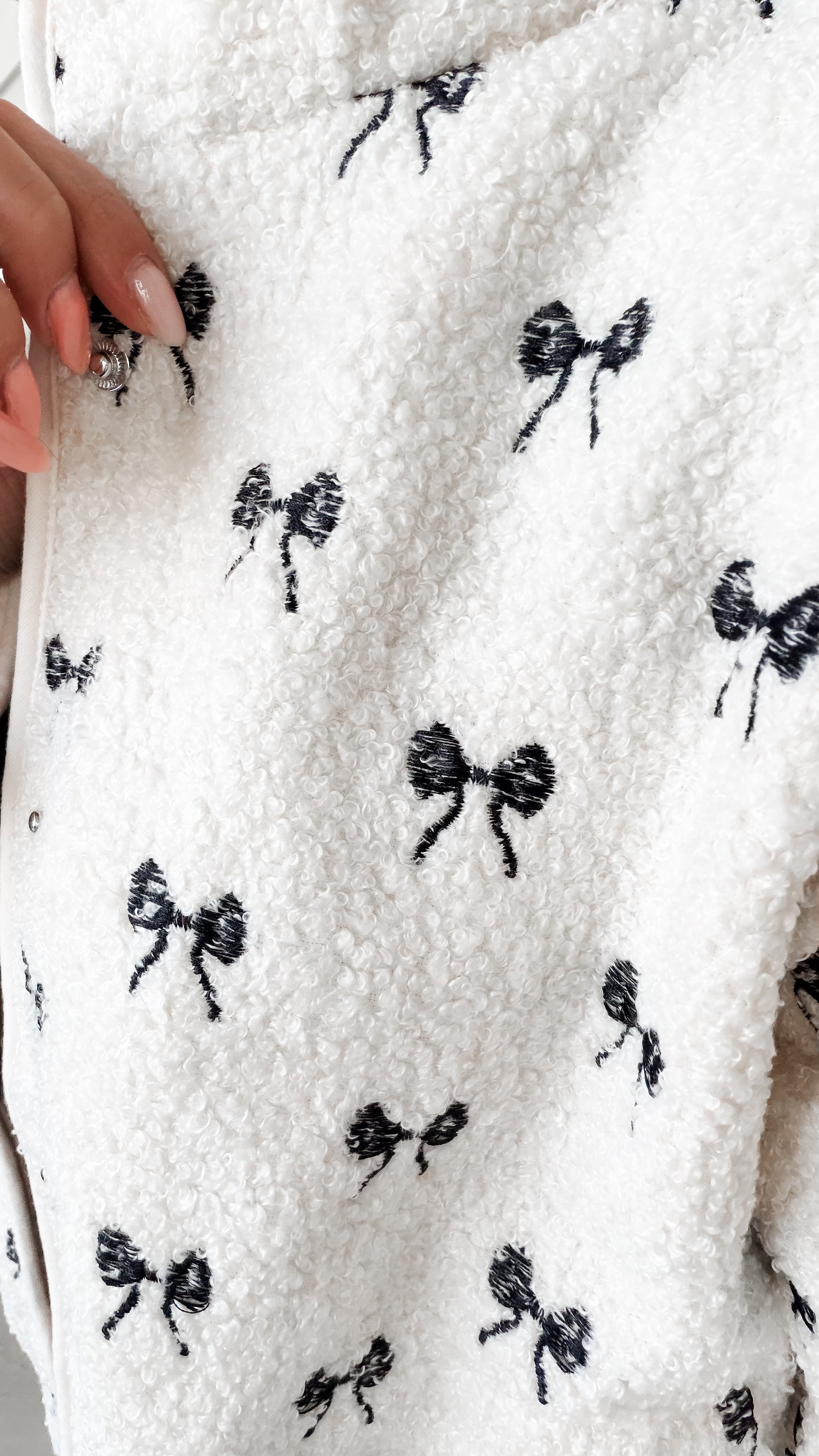 Style: Meet the Paige Sherpa Jacket—a refined layering essential designed for versatility and comfort. The structured polar collar and front snap closure create a polished silhouette, while drop shoulders and long sleeves offer relaxed, modern proportions. Practical side hand pockets and bonded sherpa lining deliver both function and warmth without added weight. Thoughtful embroidery detailing distinguishes this piece: select cream with black embroidered bows for understated sophistication or tan with navy hearts for a gentler touch. Exceptionally soft and lightweight, the Paige transitions seamlessly from season to season.