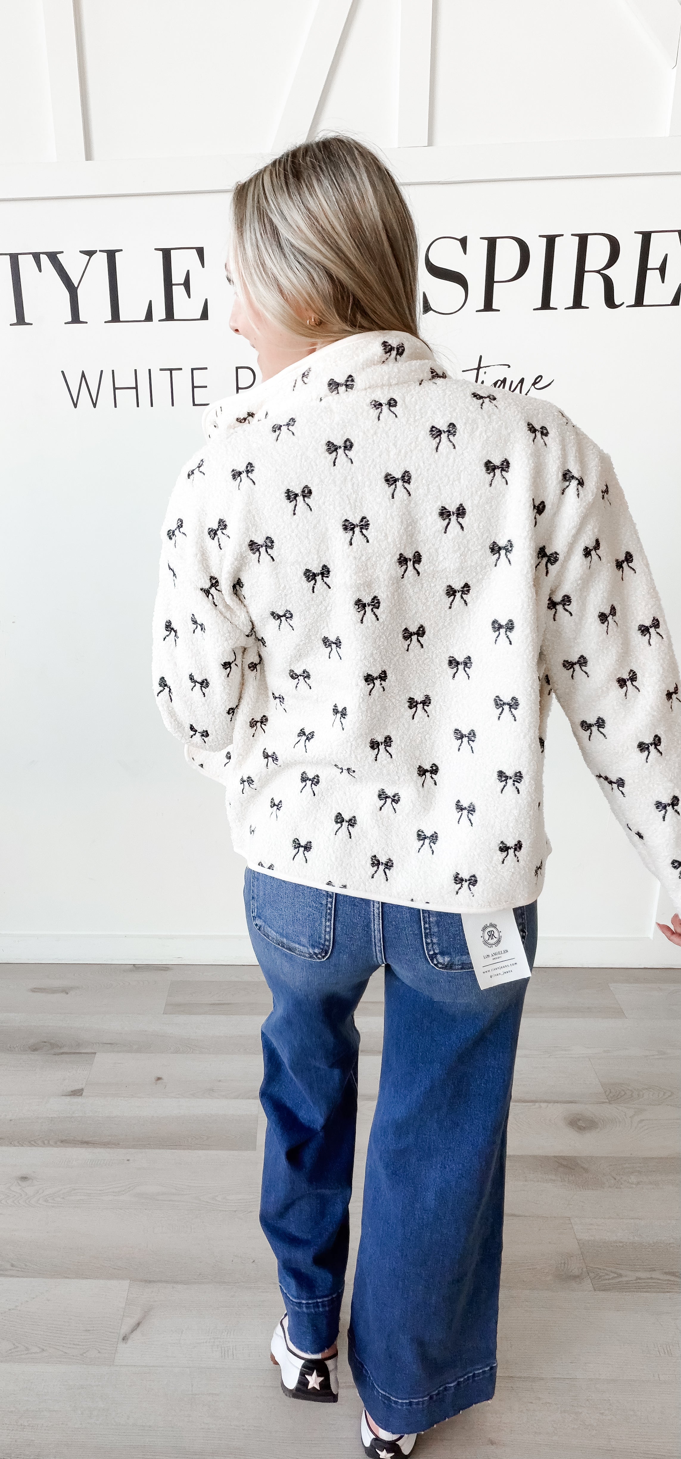 Fit: Stand up polar collar. Front snap closure. Drop shoulders. Long sleeves. Side hand pockets. Bonded sherpa. Embroidery detail. Cream with black embroidered bows or tan with navy hearts. Light weight and super soft.