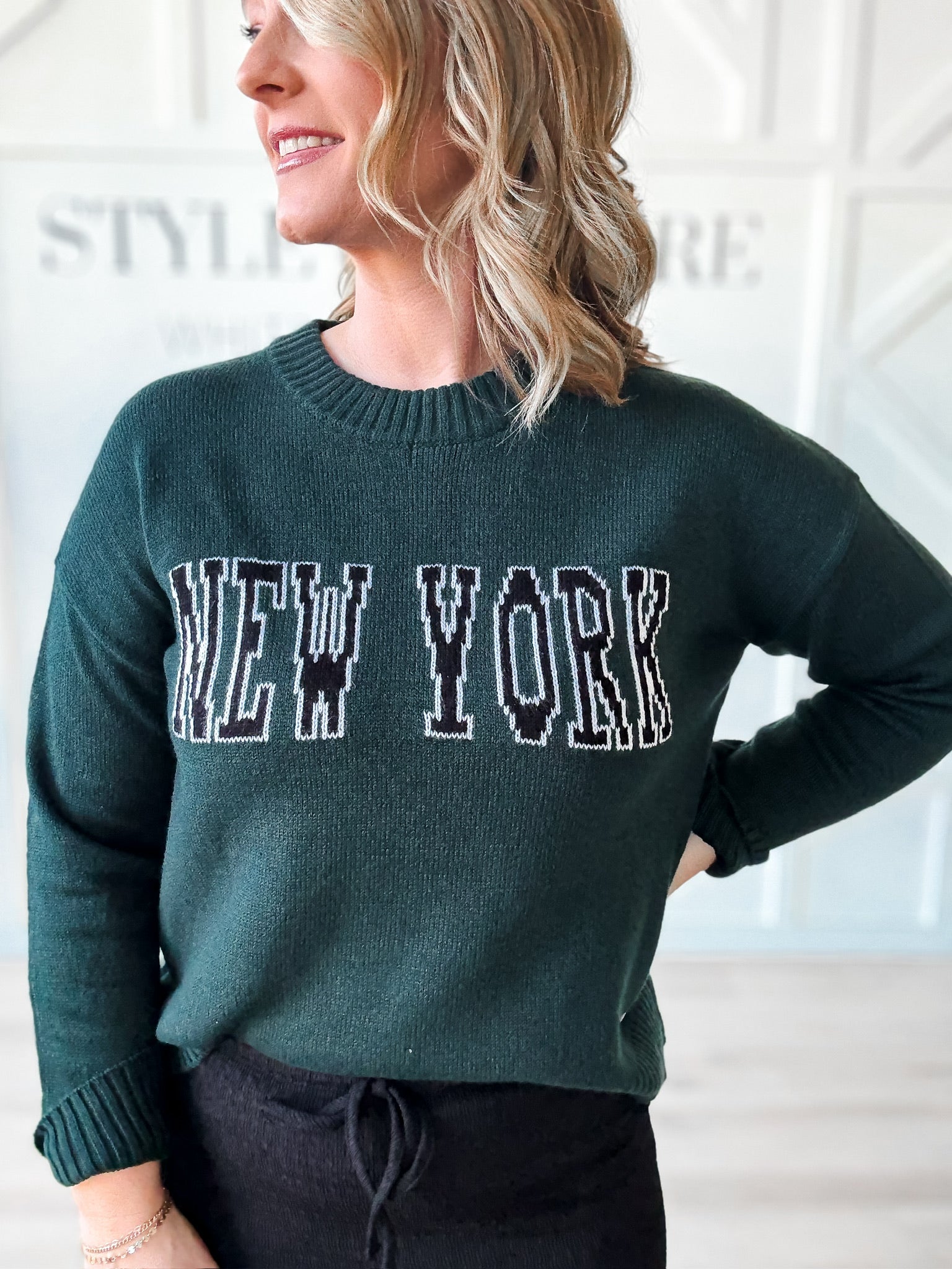 Fit: Crew neck. Drop shoulder. Long sleeves. New York graphic letter design knit into the sweater. Contrast ribbing on neckline, cuffs, and hemline.