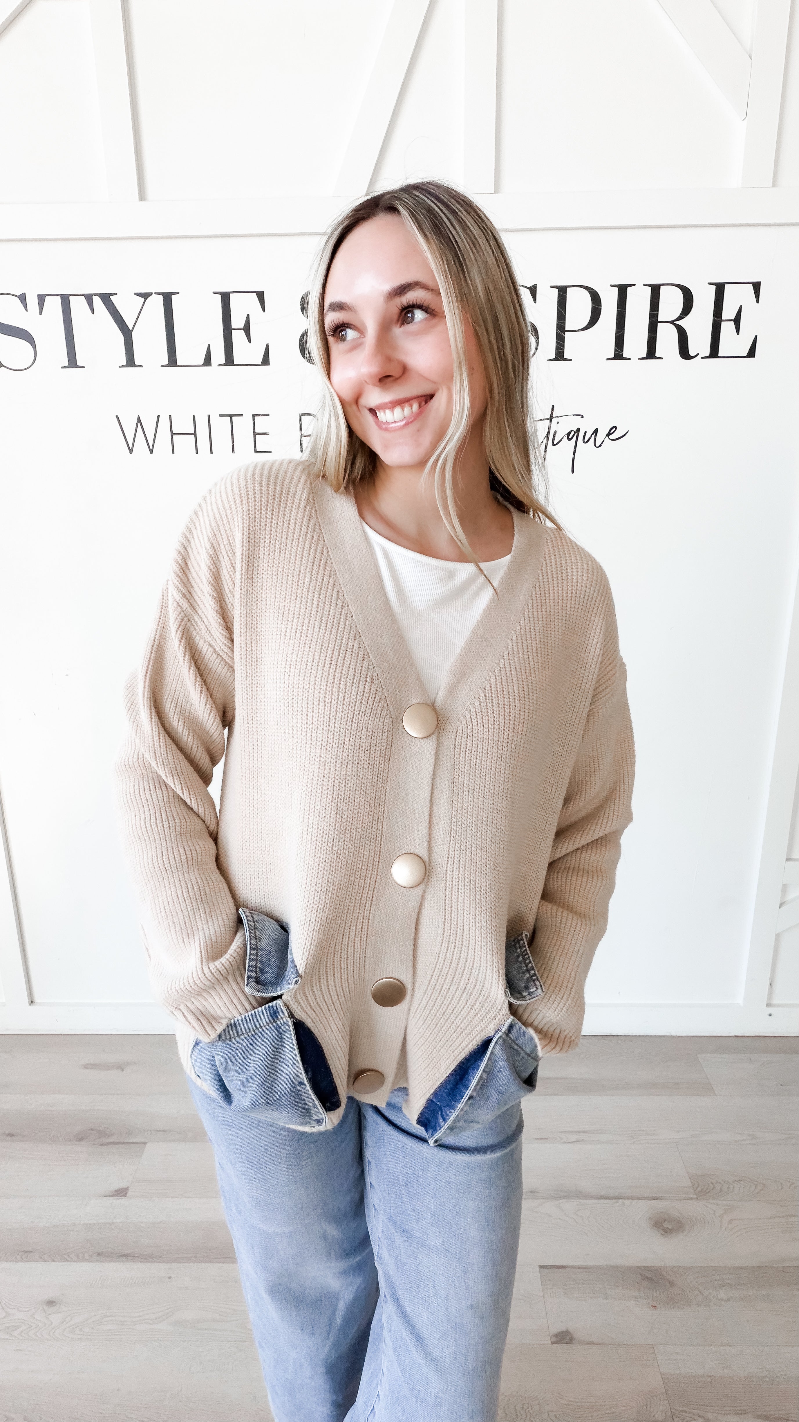 Fit: Deep V button down cardigan. Drop shoulders. Long sleeves. Soft ribbed knit texture. Large denim patch pockets. Trendy, fun, elevated look to your every day cardigan.