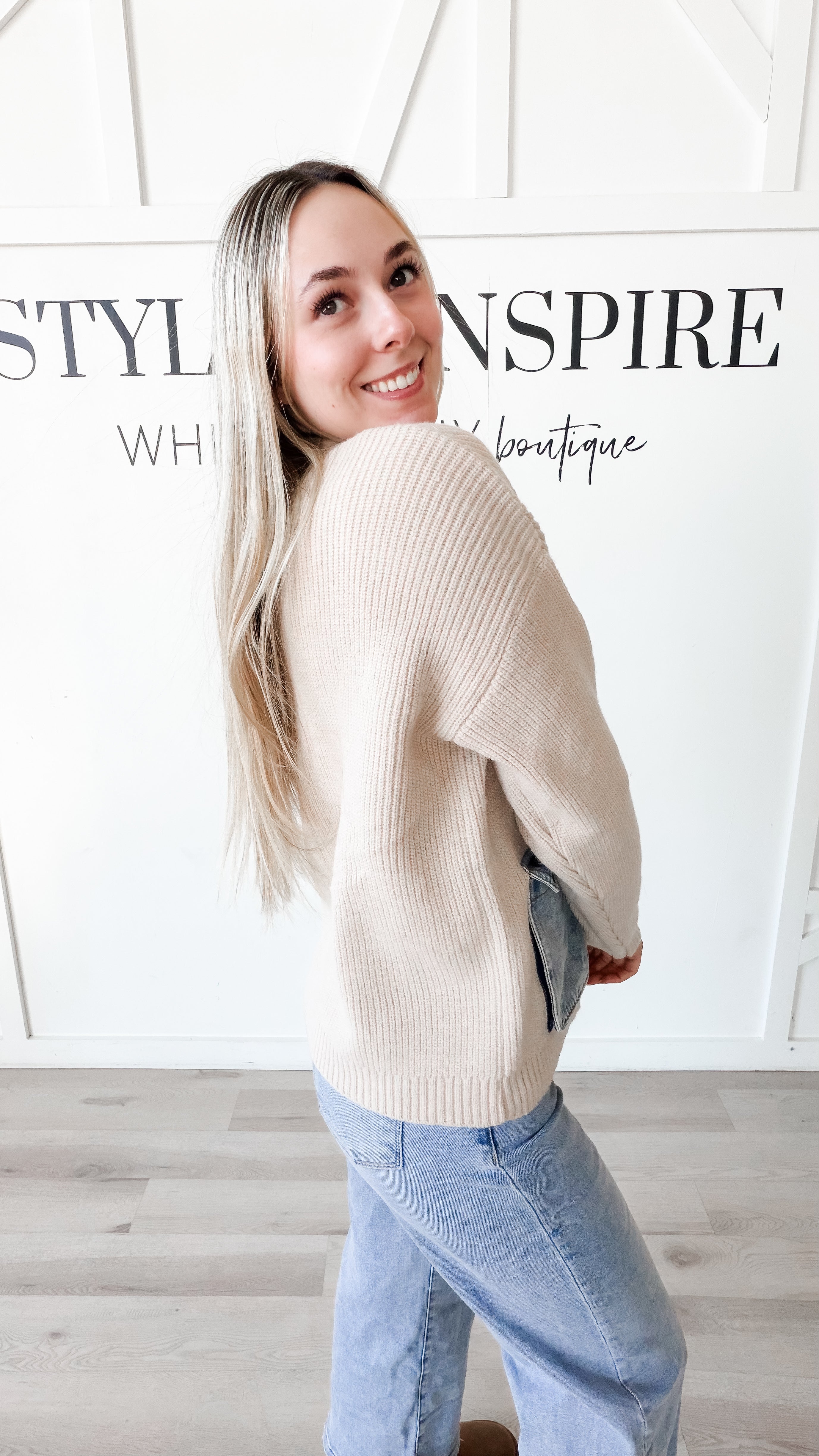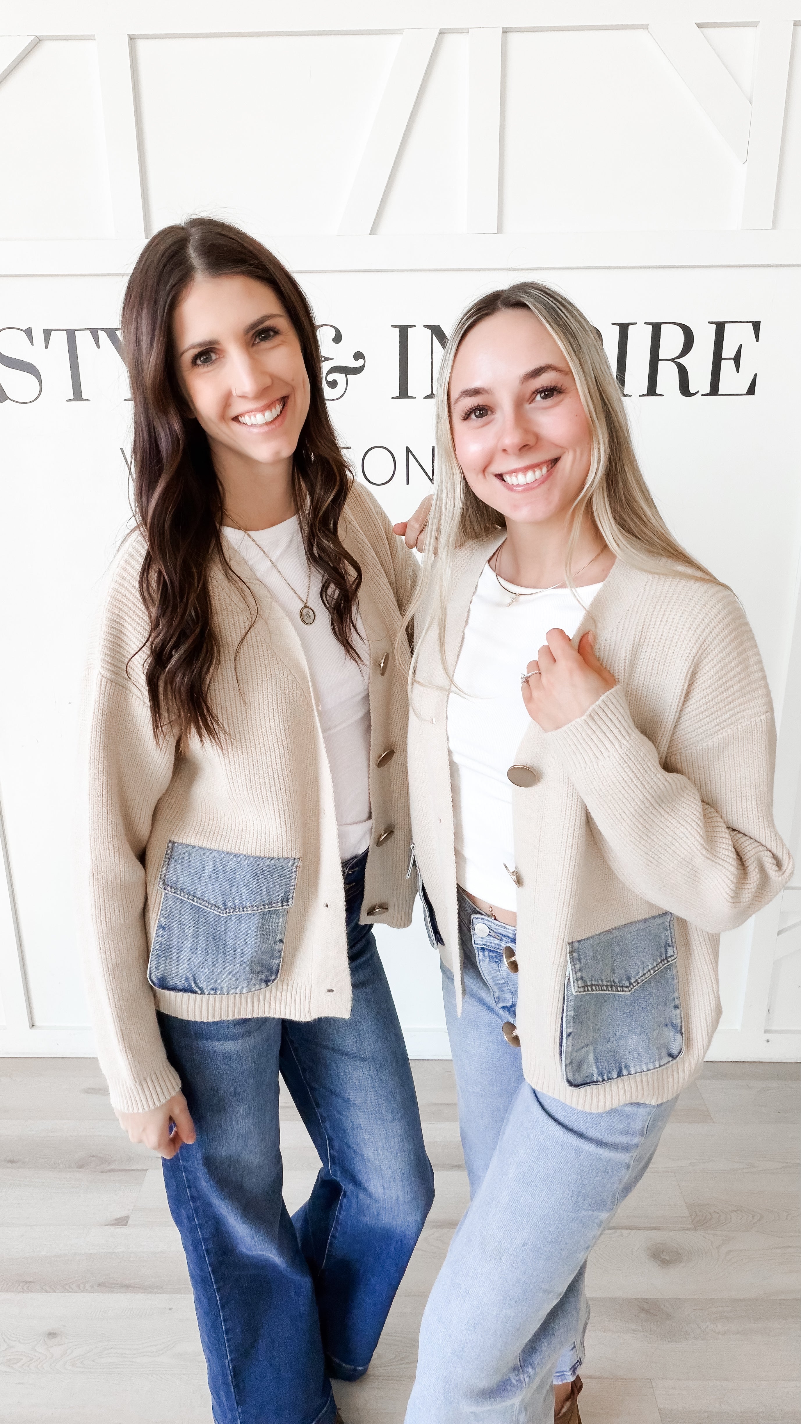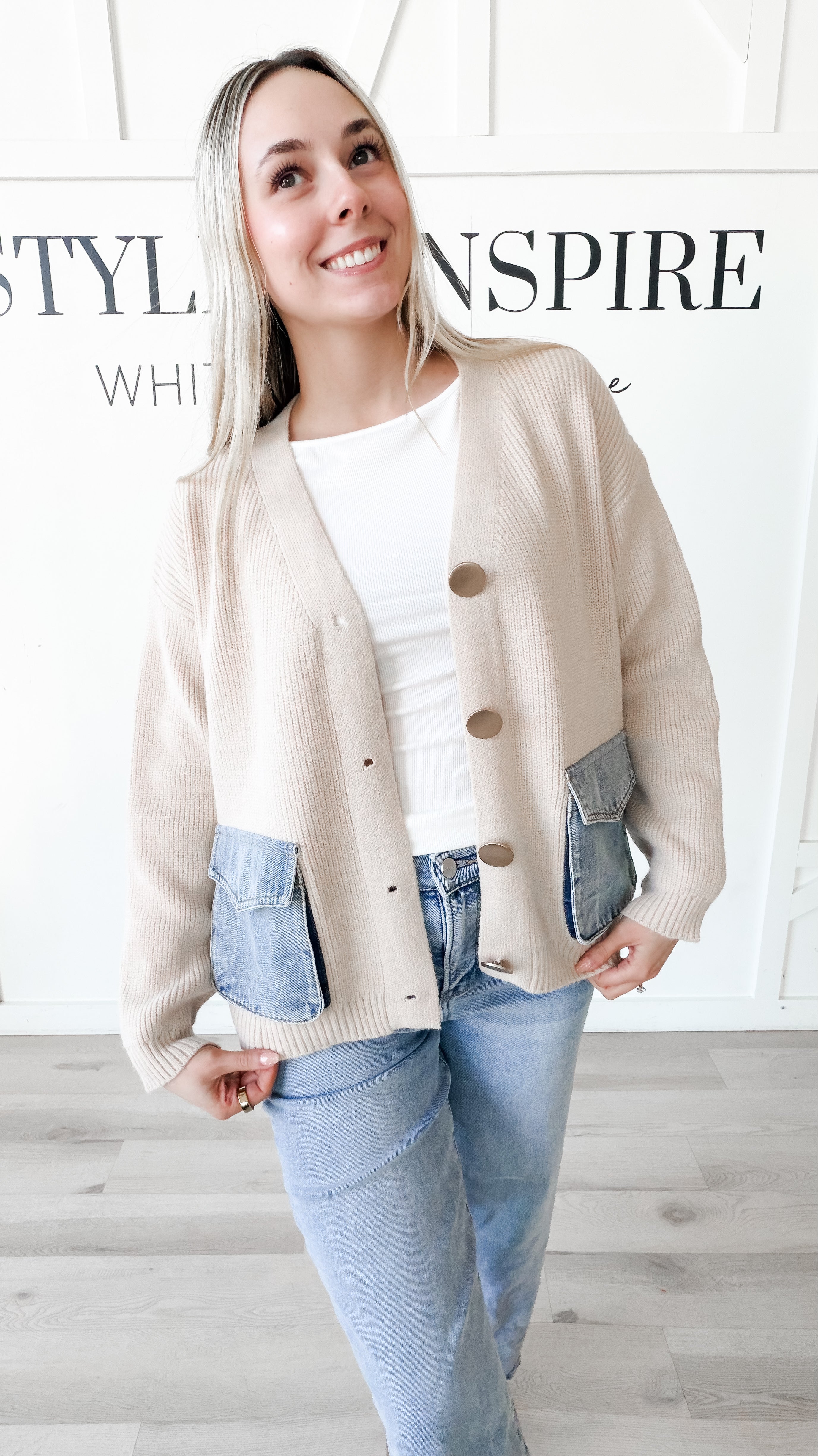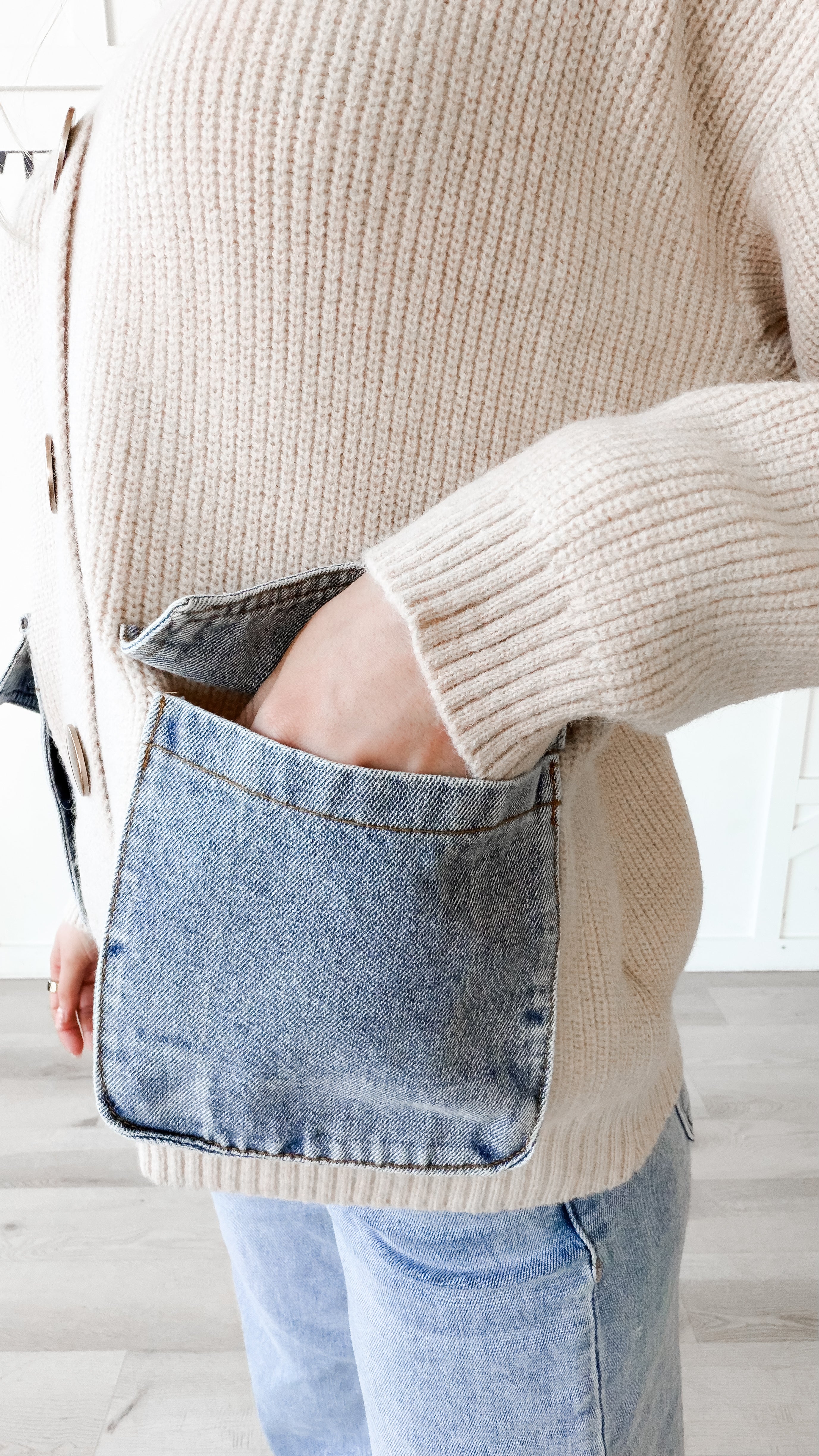 Style: The Stella Denim Pocket Cardigan combines contemporary design with everyday versatility. This piece features a flattering deep V neckline and relaxed drop shoulders that create an effortlessly chic silhouette. Crafted from soft ribbed knit, it drapes beautifully while maintaining structure. Functional denim patch pockets add visual interest and practical storage. Long sleeves and button-front closure make layering seamless across seasons. Perfect for elevating casual basics into polished, intentional outfits.