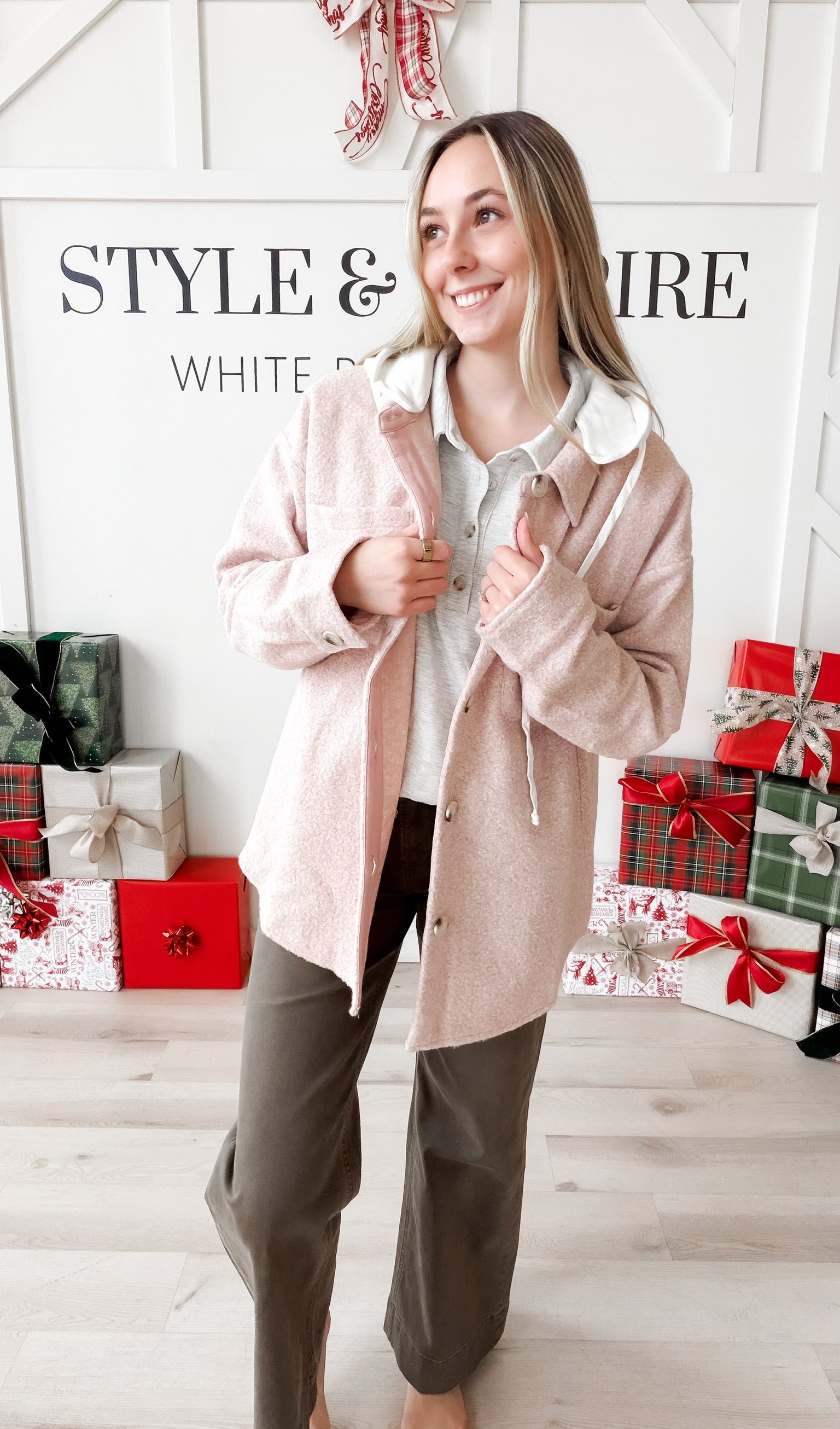 Style: The Winona Shacket combines structured tailoring with versatile layering potential. Crafted from soft boucle fabric, this piece features a classic shirt collar with a detachable hood for adaptive styling across seasons. The button-down front closure and drop shoulders create an effortless silhouette, while front patch pockets add functional detail. Long sleeves and a curved hem complete the refined design, making it equally suited for casual weekends or polished layering.