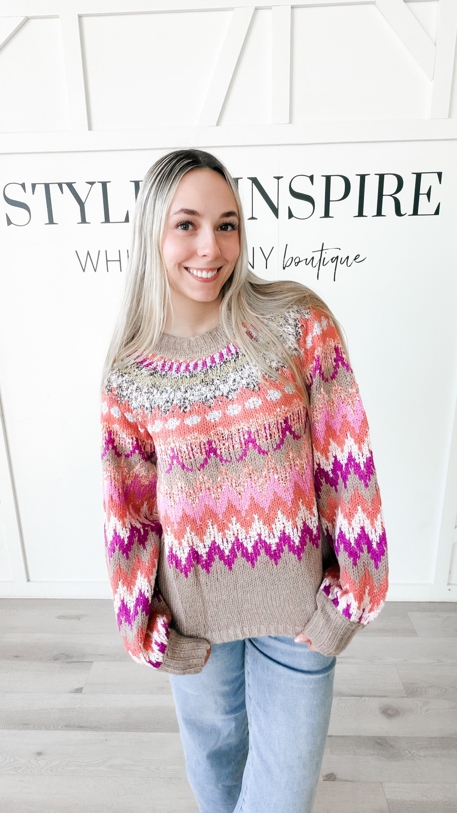 Style: Effortlessly elevate your everyday wardrobe with the Diana Multi Color Pattern Sweater. This lightweight knit features a relaxed crew neck and dramatic drop shoulders paired with voluminous balloon sleeves for an on-trend silhouette. Contrast ribbing frames the neckline, cuffs, and hem, adding refined detail to the playful tribal-inspired colorway. Crafted from soft, breathable sweater knit, it's the perfect piece for layering or wearing solo—designed for those who value comfort without compromising on style.