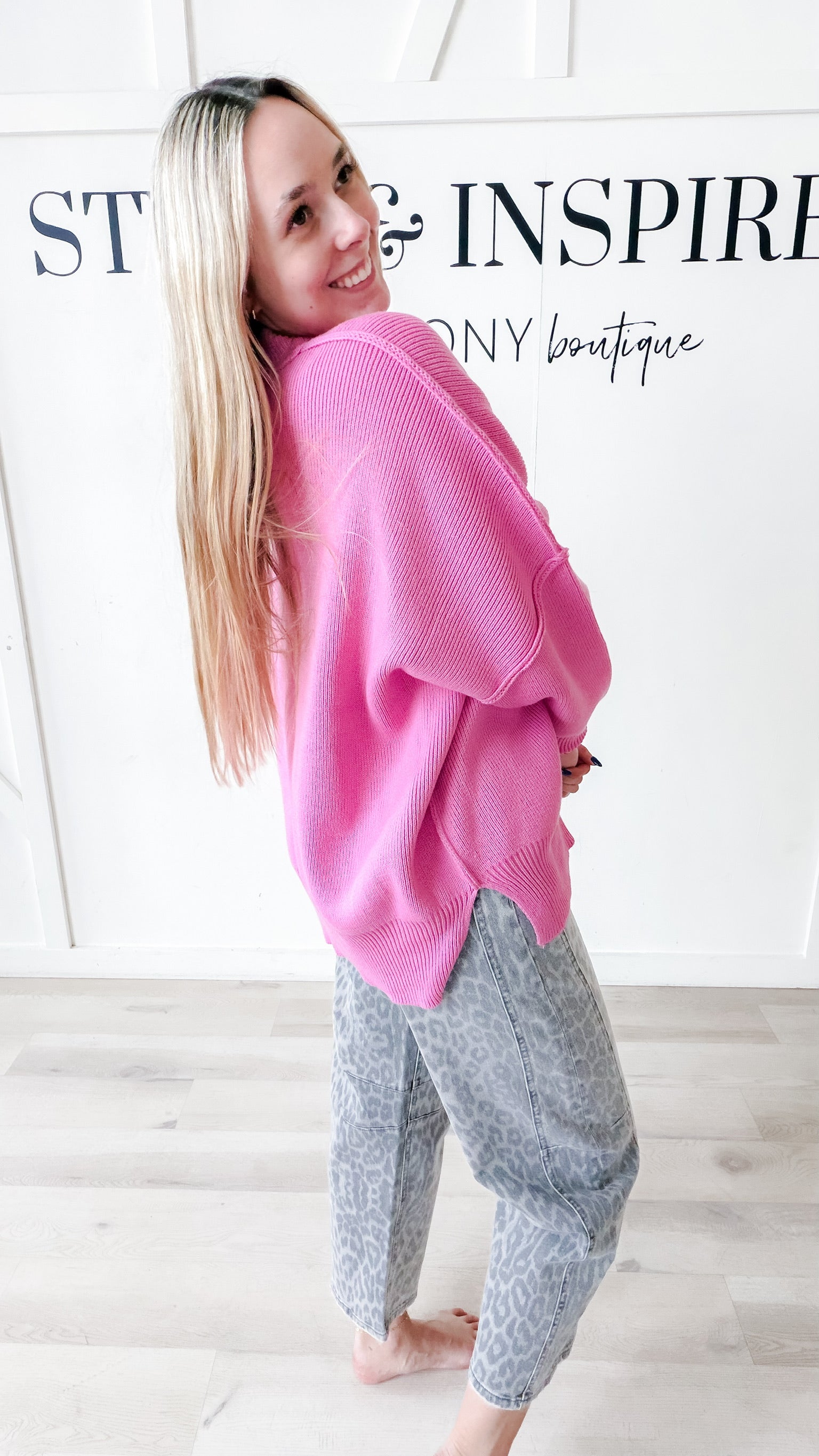 Style: The Kate Side Slit Oversized Sweater delivers effortless sophistication through thoughtfully designed details. This boxy silhouette features a relaxed crew neck and drop shoulders for a contemporary, comfortable fit. Long sleeves with wide cuffs frame the arms, while reverse seam construction adds refined texture. Strategic side slits enhance movement and visual interest, and the ribbed sweater knit provides structure and durability. Perfect for layering or wearing solo, this piece transitions seamlessly from casual to polished occasions.