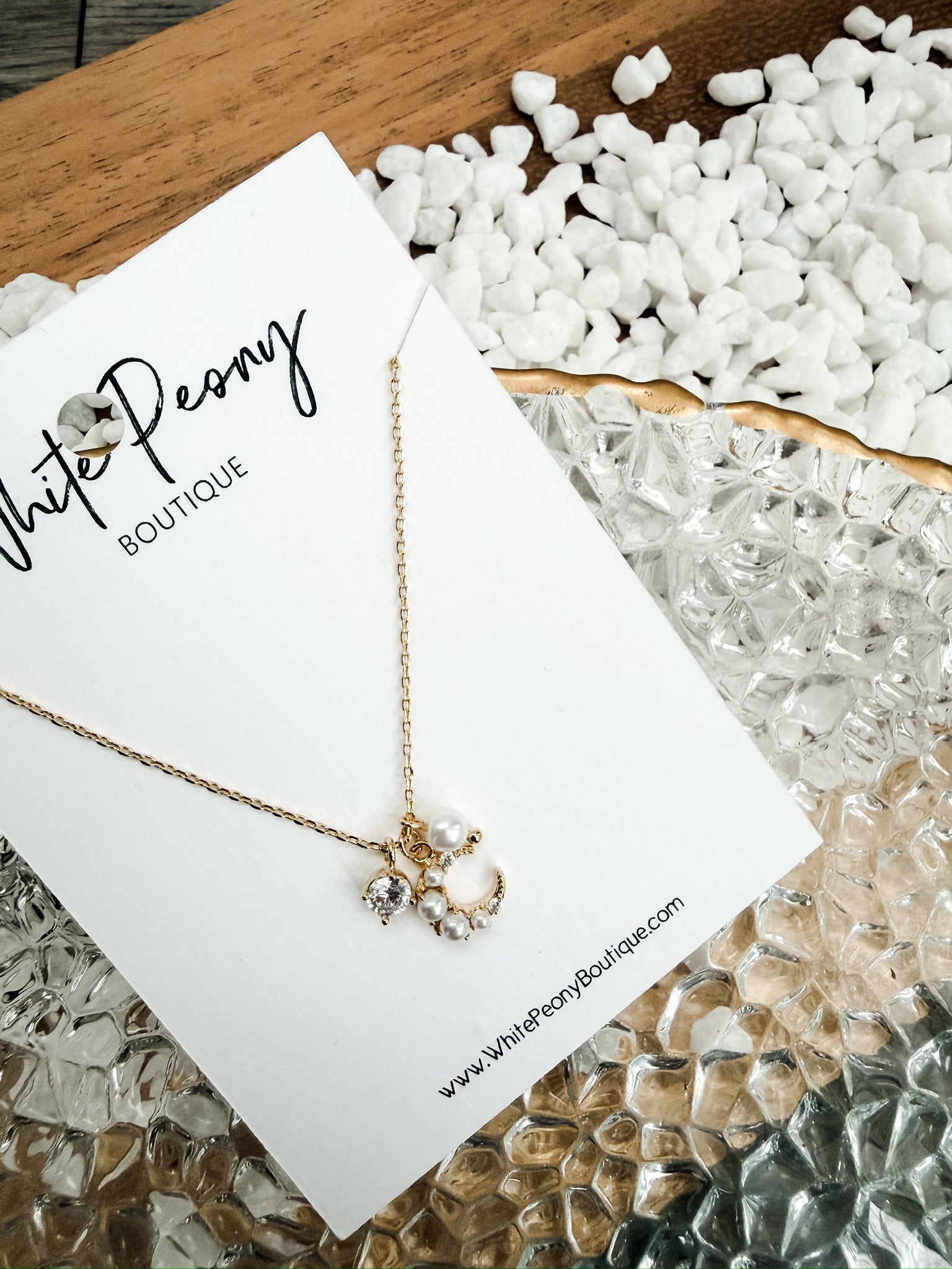A delicate gold-tone necklace featuring a petite crescent charm adorned with soft faux pearls and subtle crystal accents. The layered charm design adds just the right mix of shimmer and elegance, making this piece perfect for everyday wear or special occasions. Lightweight and feminine, it layers beautifully with other necklaces or stands alone as a refined statement.