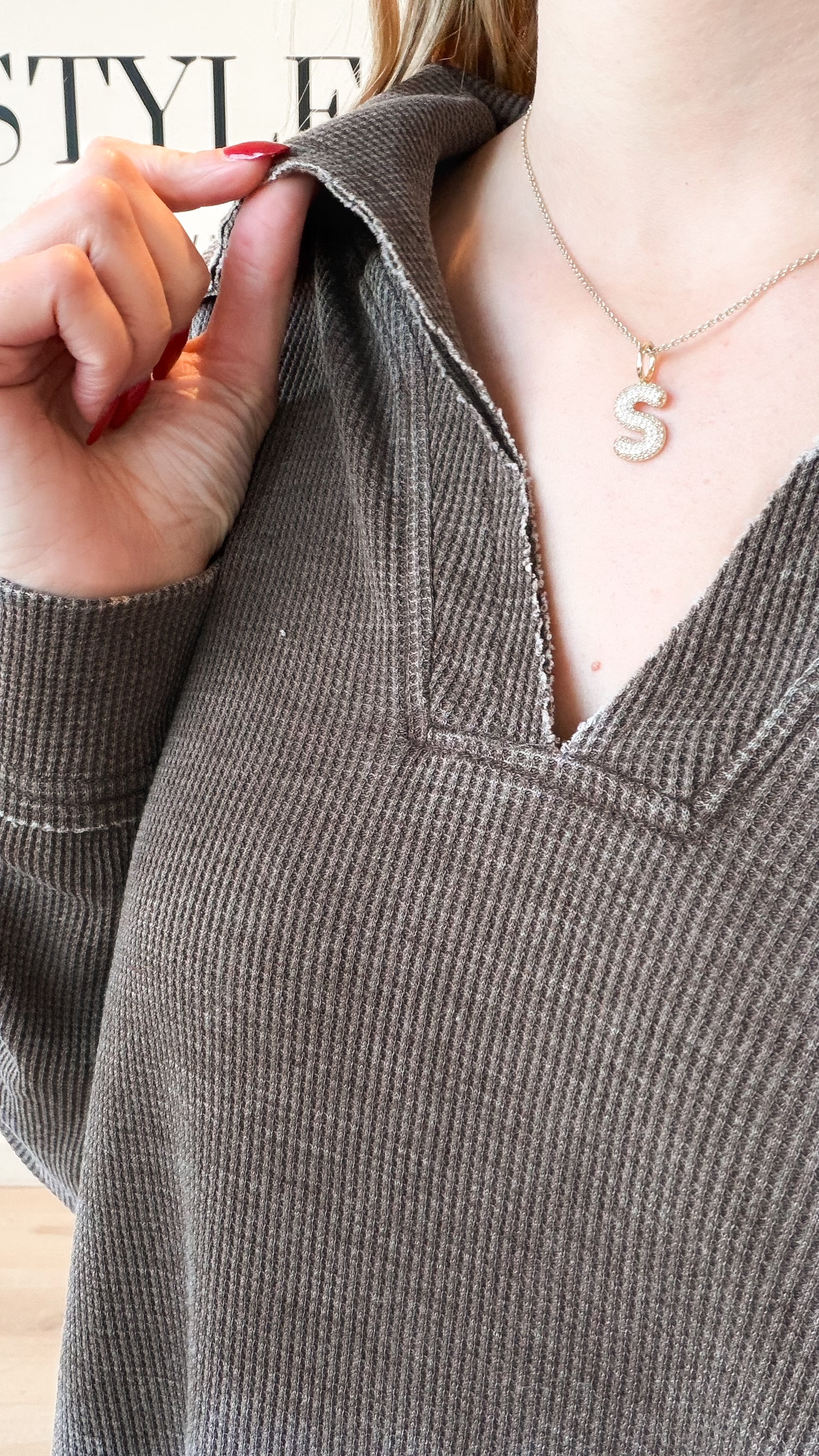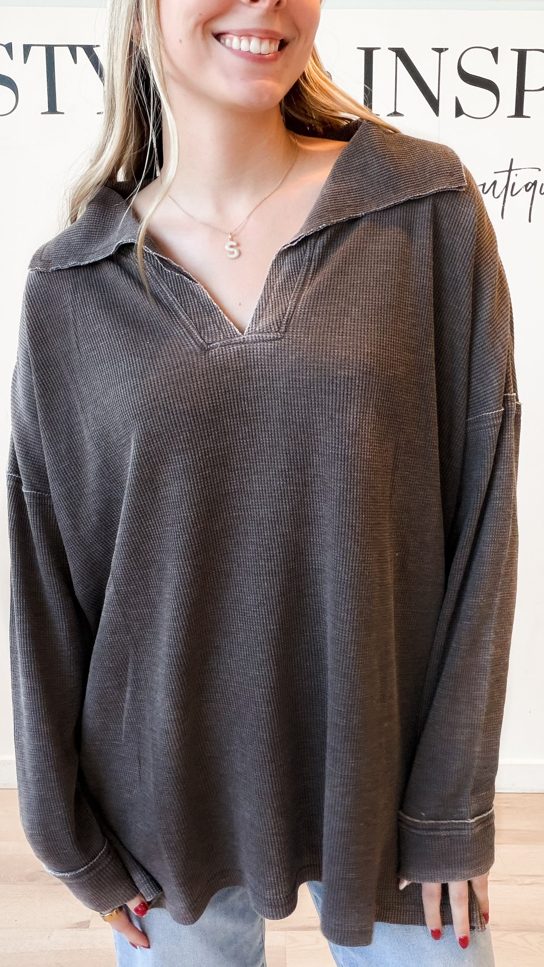 Style: The Candice Oversized top features a wide shirt collar and a split V-neck front, offering a relaxed yet refined neckline. Its drop shoulder design and long sleeves provide comfortable ease of movement. Crafted from lightweight waffle knit with a vintage-inspired mineral wash, this tunic-length piece has a long straight hem with side splits for added flow and versatility. Perfect for layering or wearing alone, the Candice delivers effortless style with a distinct textured finish.
