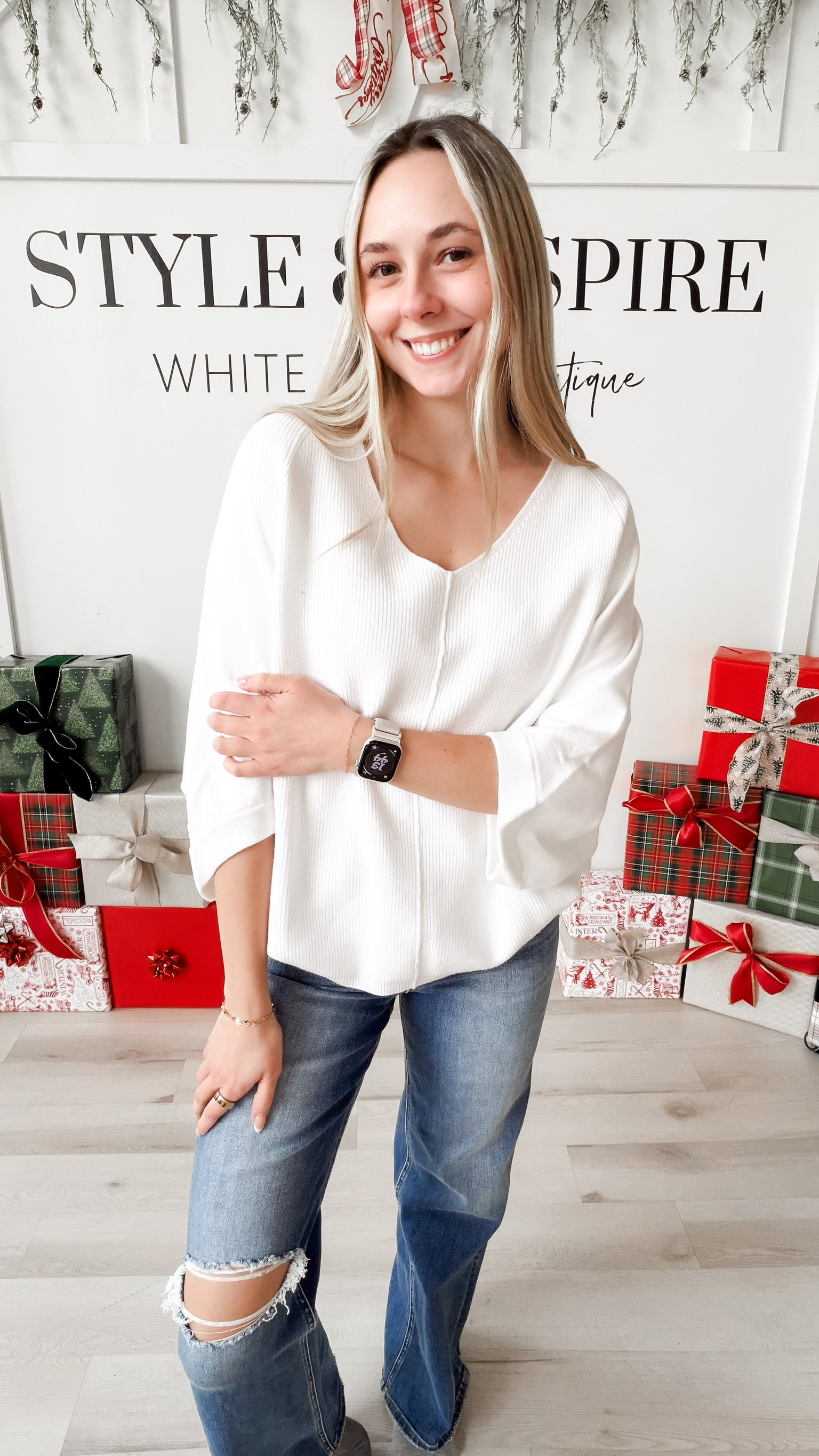 Fit: V-Neck. Center seam. Dolman sleeves. Curved hem. Rib detailing. Sweater knit.