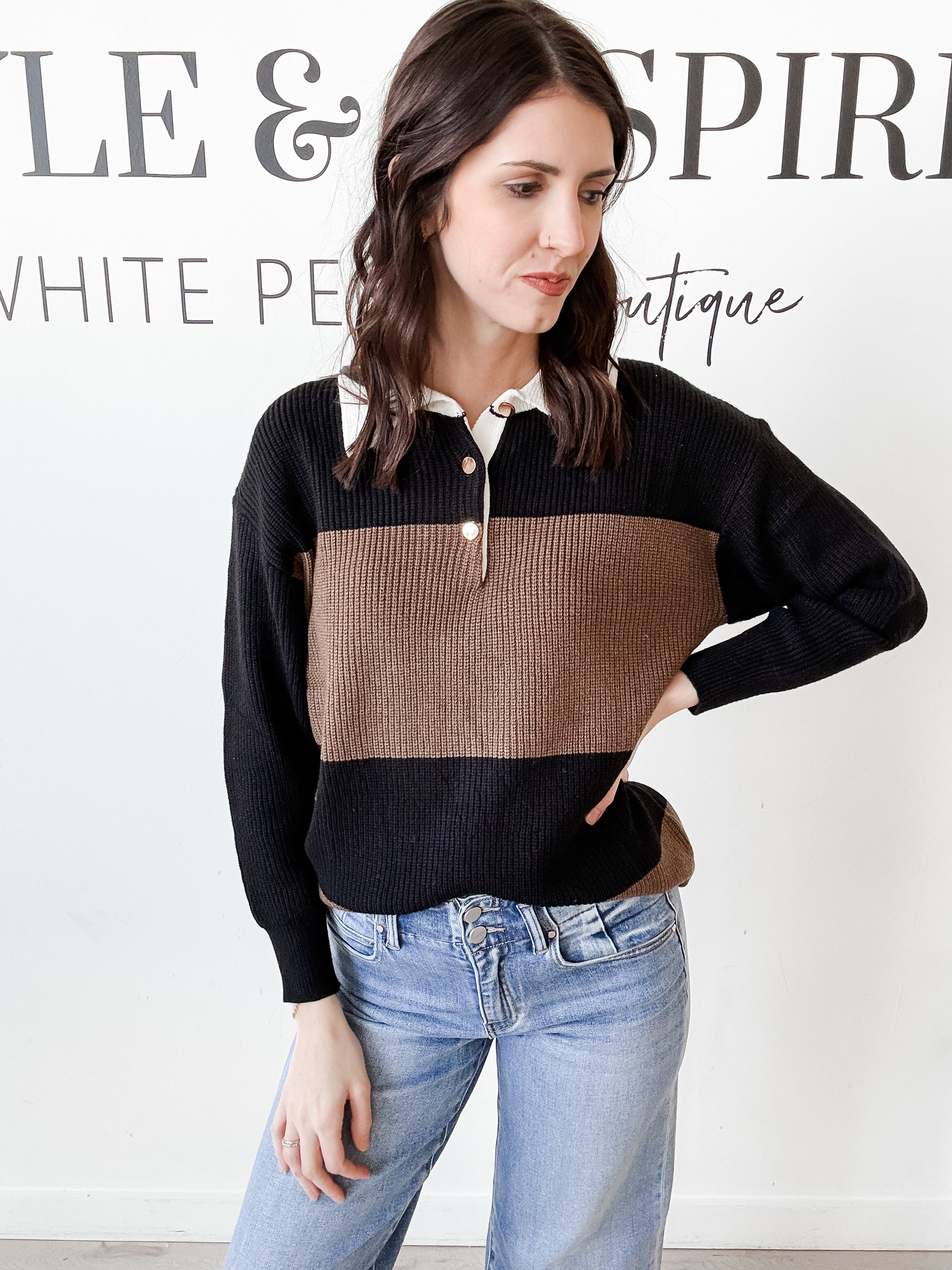 Fit: Shirt collar. Button front henley style. Drop shoulder. Long sleeves. Color block body. Contrast collar. Ribbed knit. Casual sporty appeal.