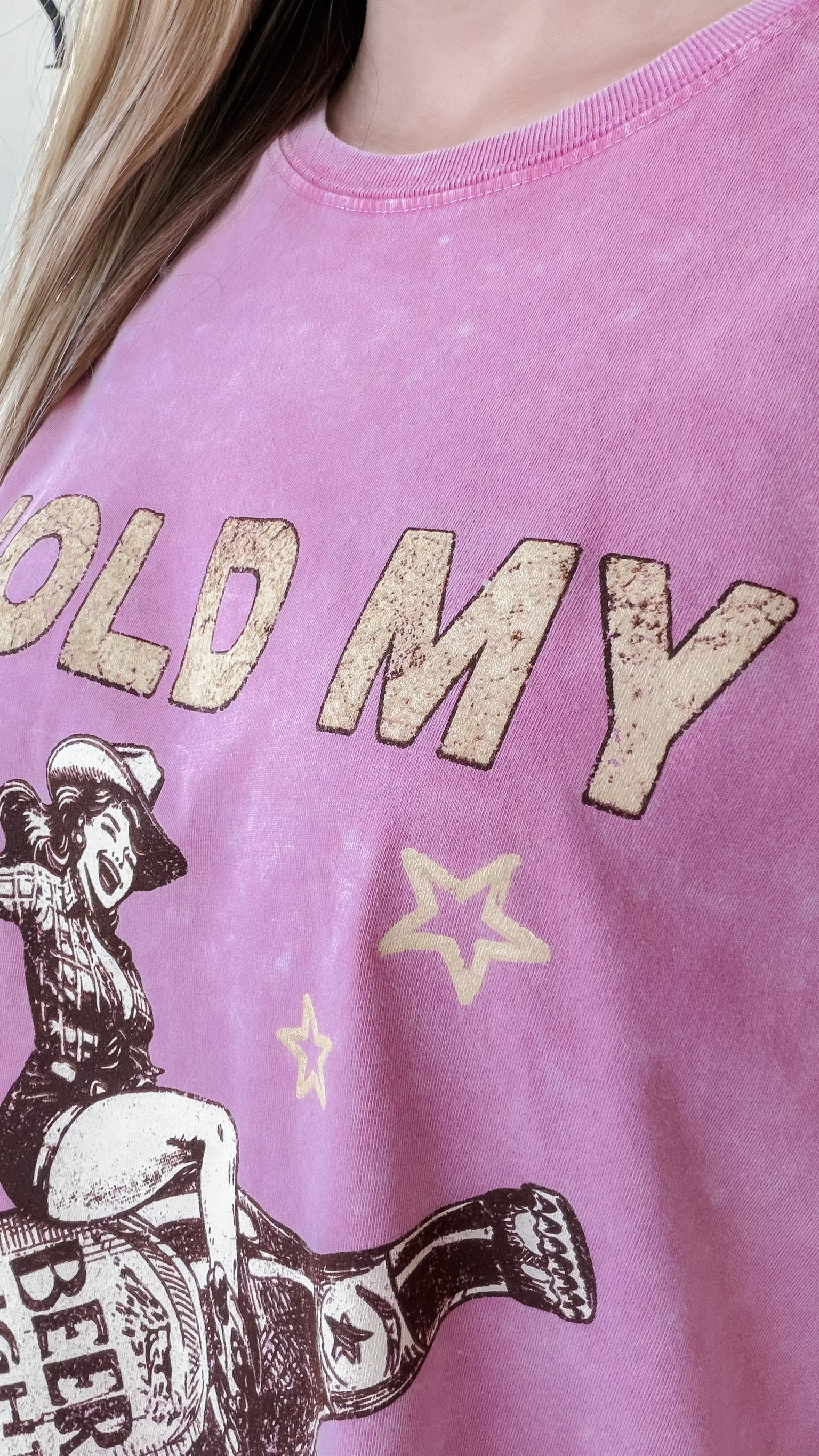 Fit: Crew neck. Drop shoulders. Cowgirl riding a beer bottle and hold my beer vintage graphics. Boyfriend fit tee. Vintage mineral washed cotton