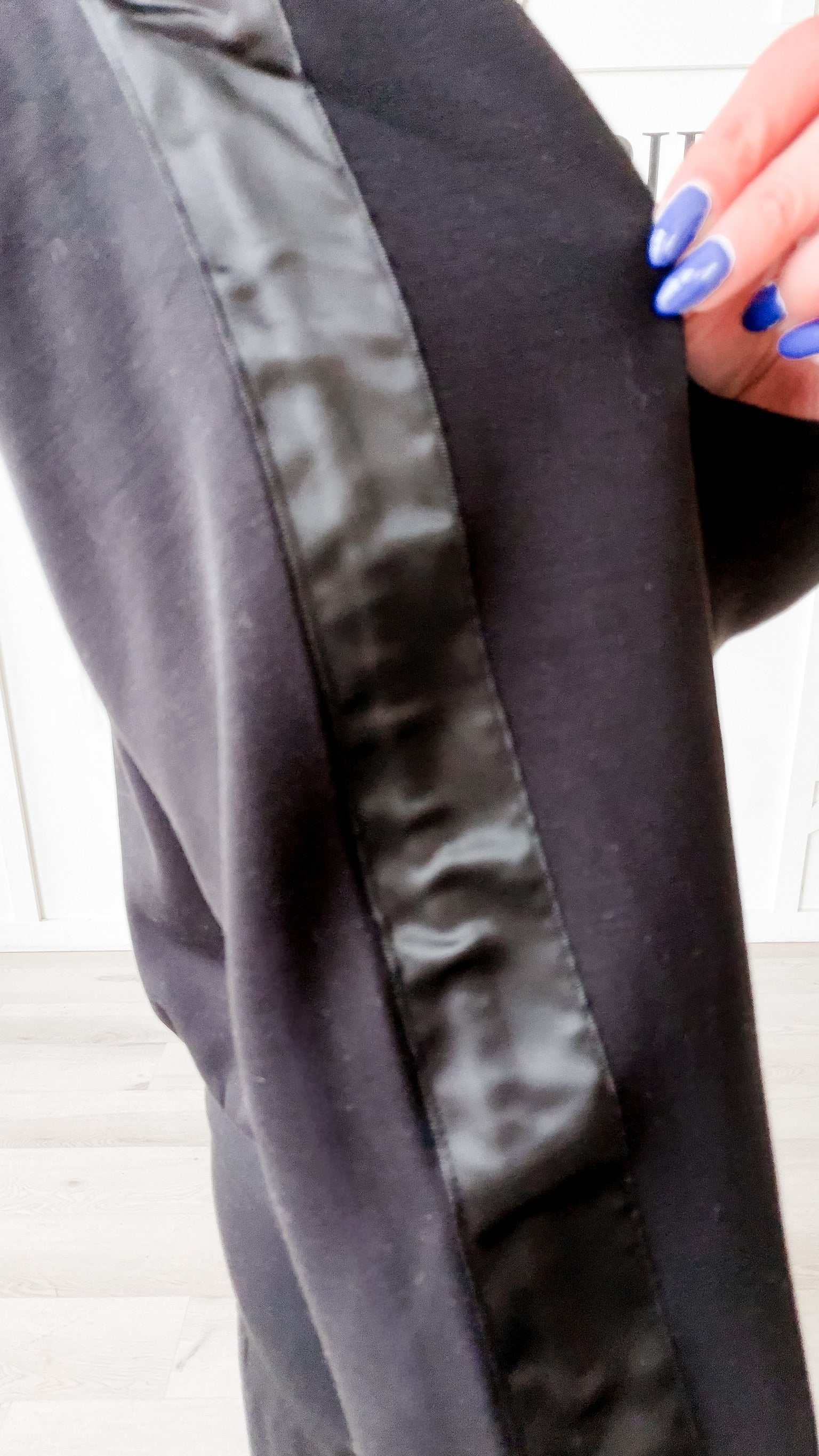 Fit: Semi Mock neck. Drop shoulders. Long sleeves. Satin trim on the length of each arm. Banded neck, cuffs and hem. Relaxed fit. Luxurious modal scuba fabric
