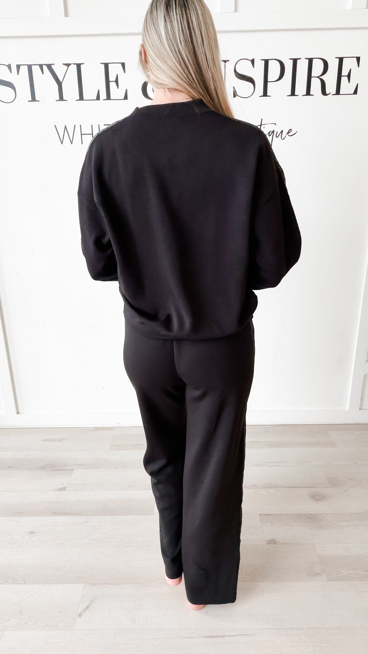 Style: Elevate your everyday essentials with the Mariah Satin Stripe Modal Crewneck, crafted from sumptuous modal scuba fabric that delivers exceptional softness and breathability. This relaxed-fit silhouette features a semi mock neck, drop shoulders, and long sleeves accented with lustrous satin trim running the length of each arm. Finished with banded detailing at the neck, cuffs, and hem for a polished, intentional look. A versatile layering piece that transitions seamlessly from day to evening.