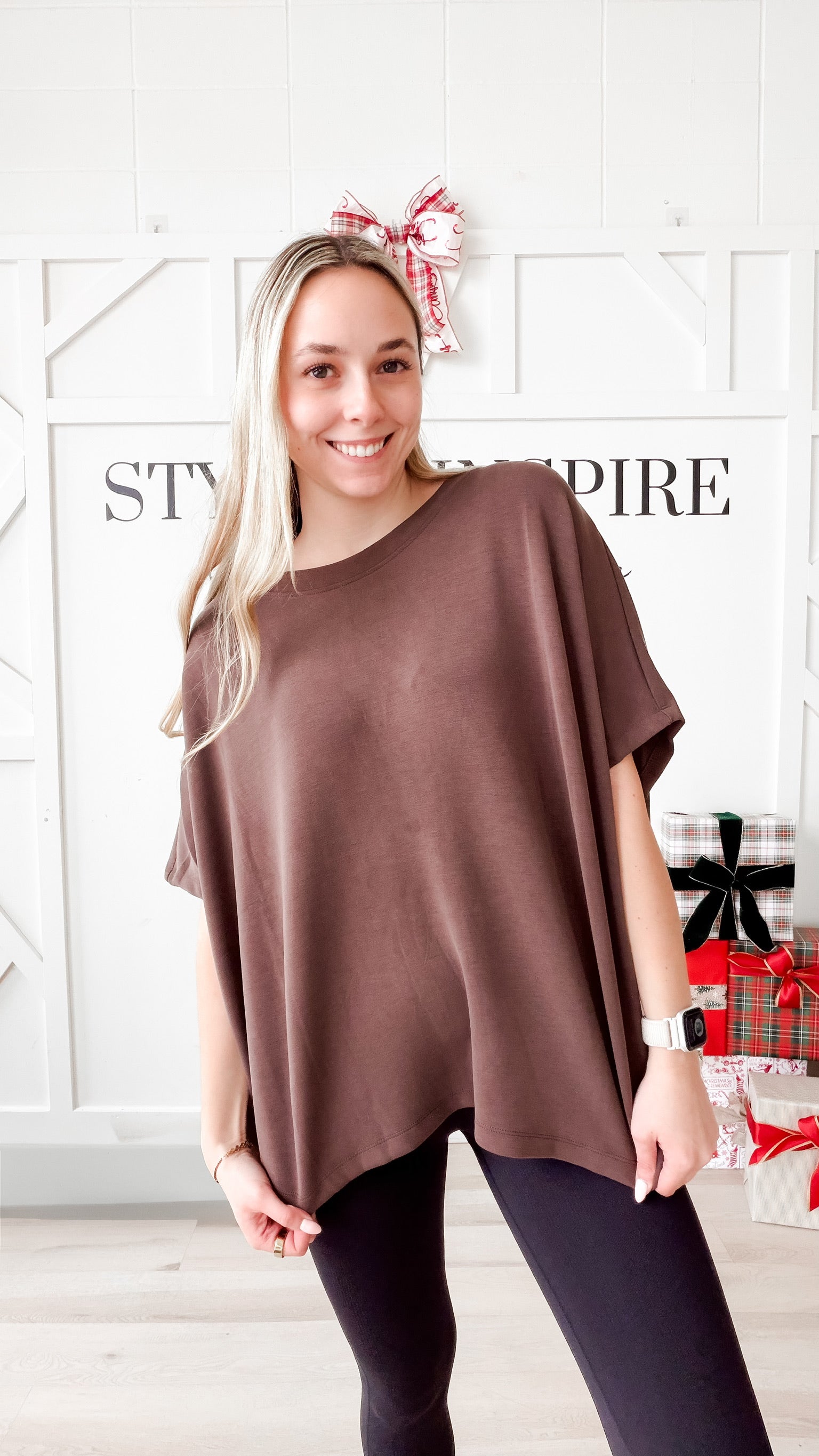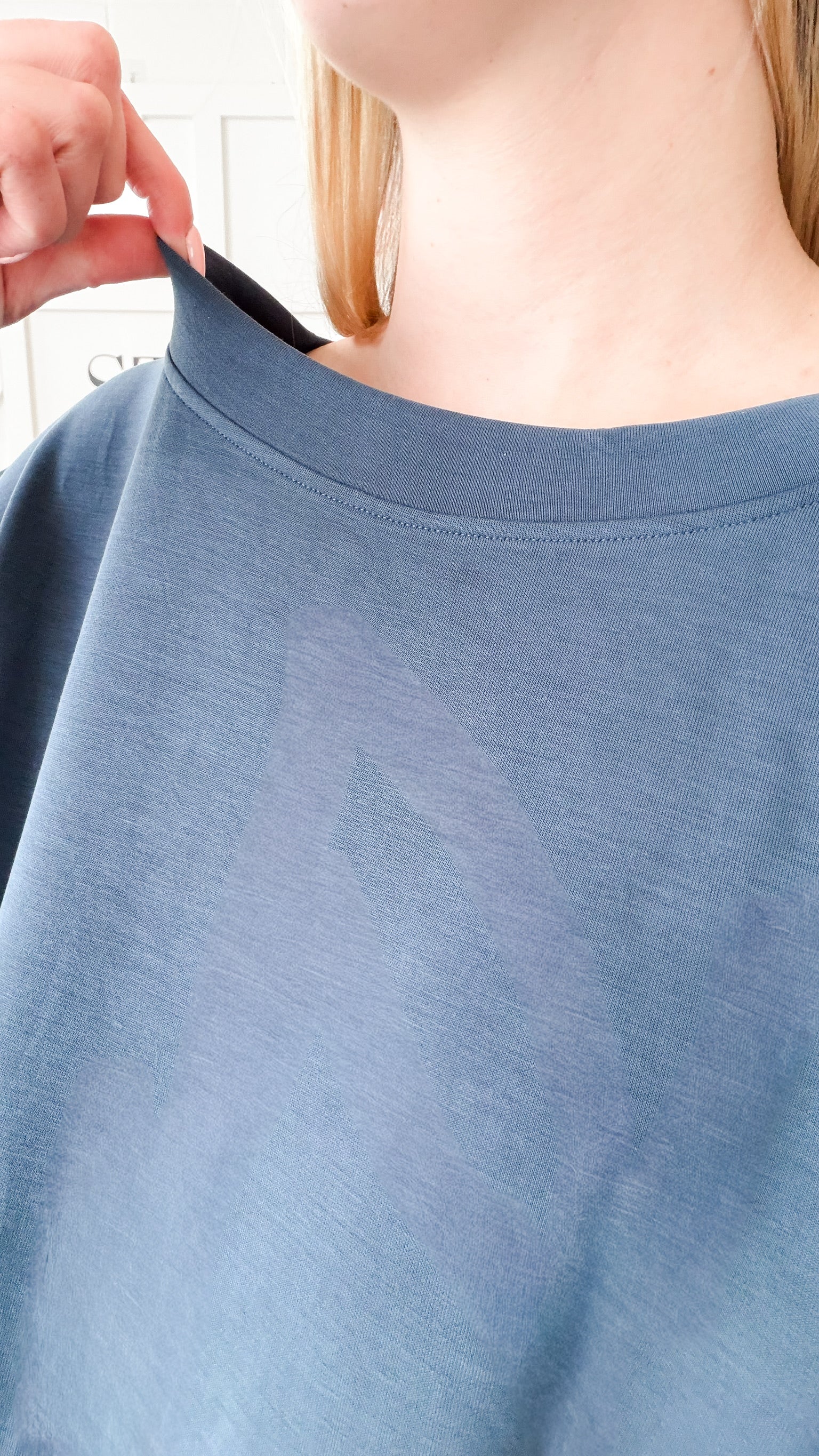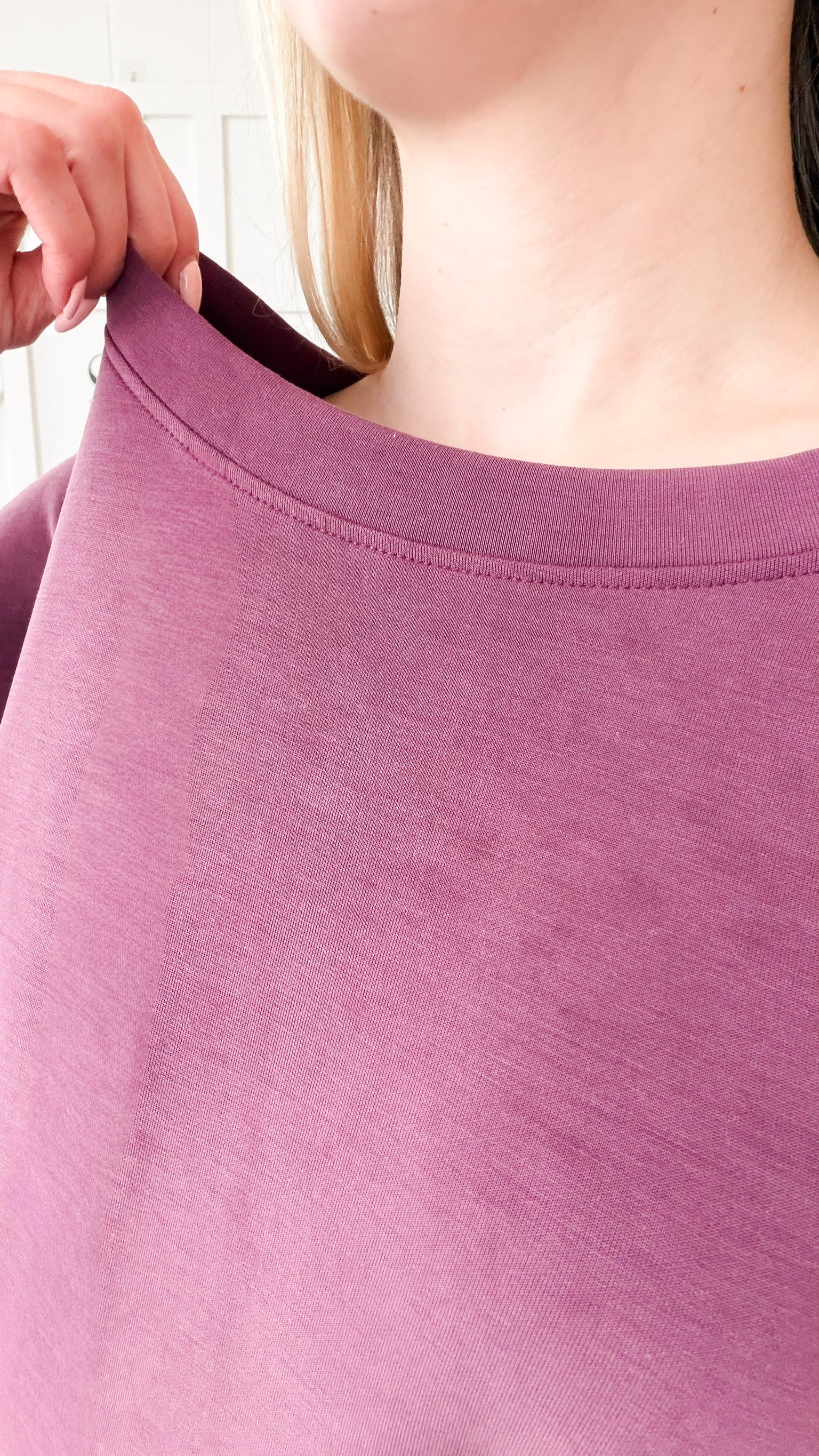 Fit: Boatneck. Dolman elbow sleeve. Boxy fit. Straight hem. Super stretchy silky modal fabric.