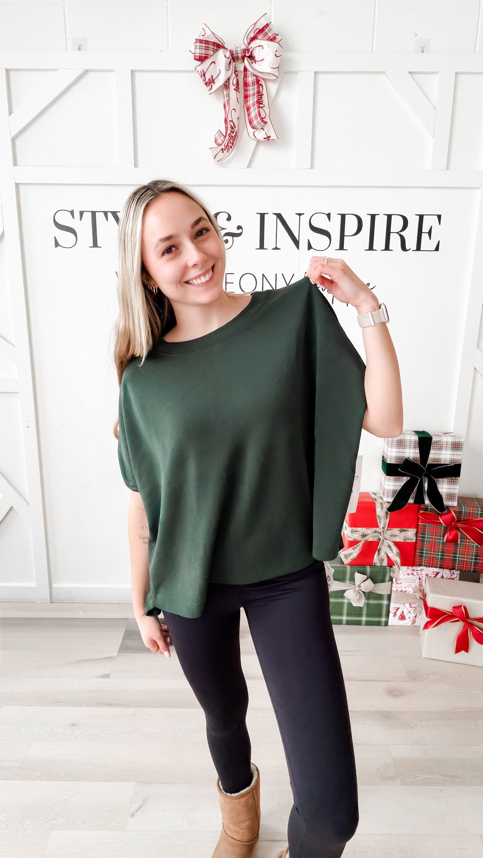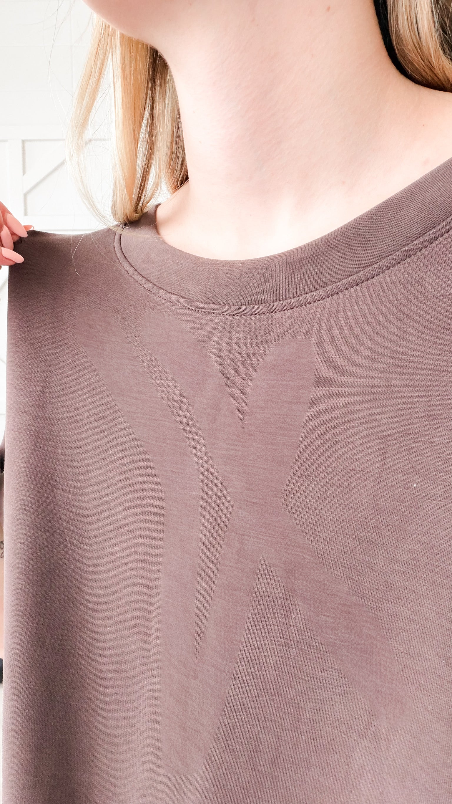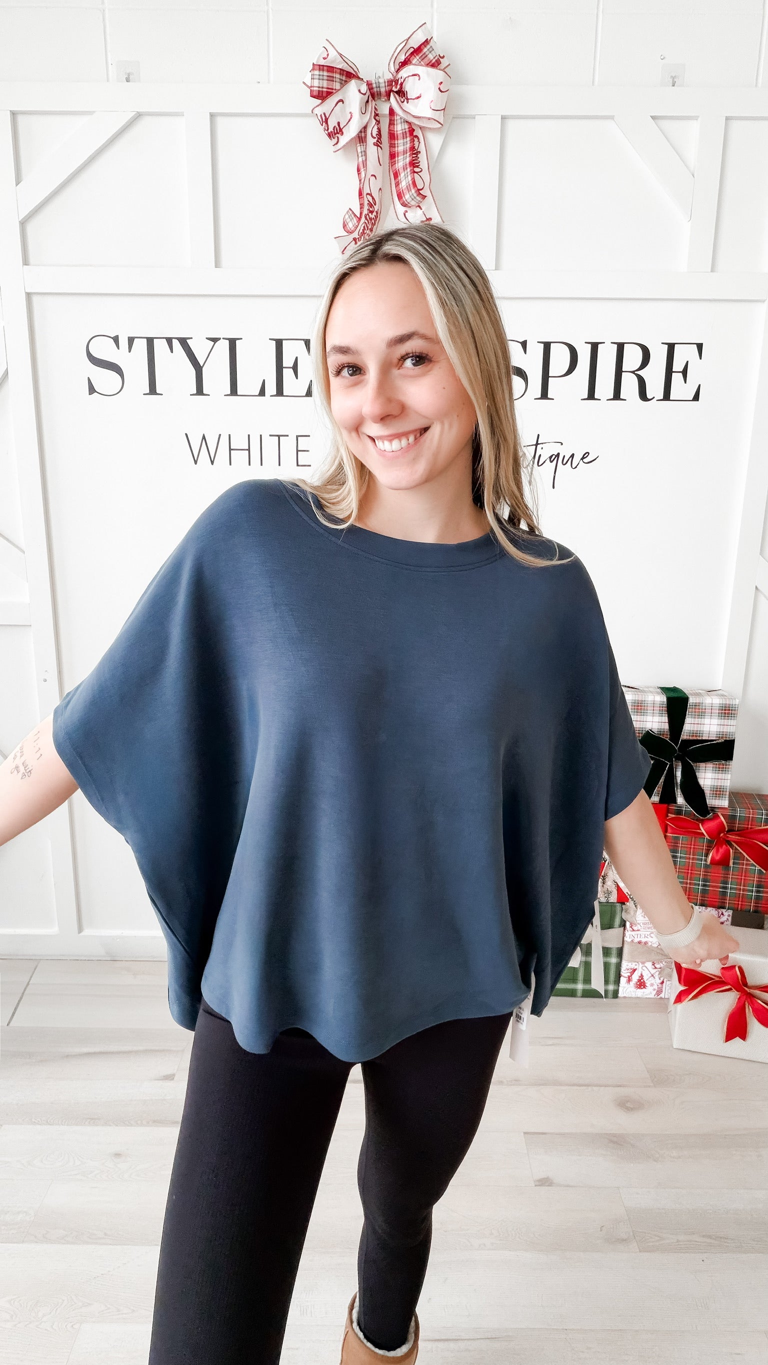 Fit: Boatneck. Dolman elbow sleeve. Boxy fit. Straight hem. Super stretchy silky modal fabric.